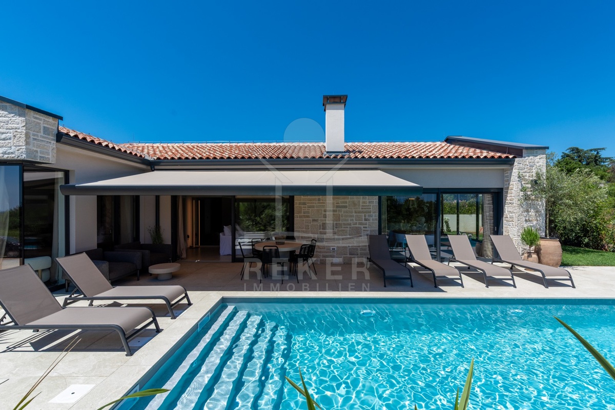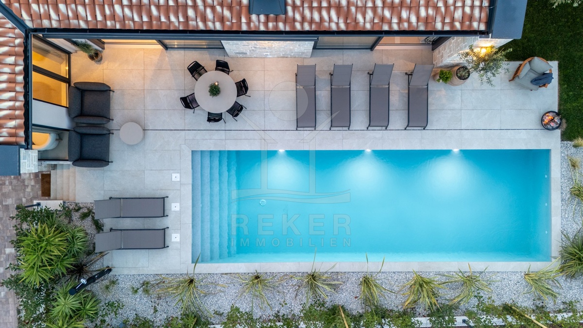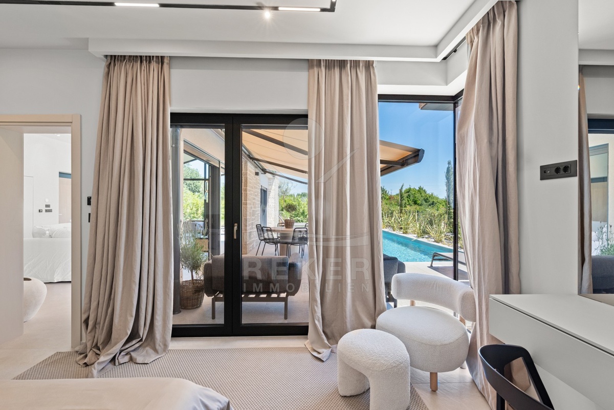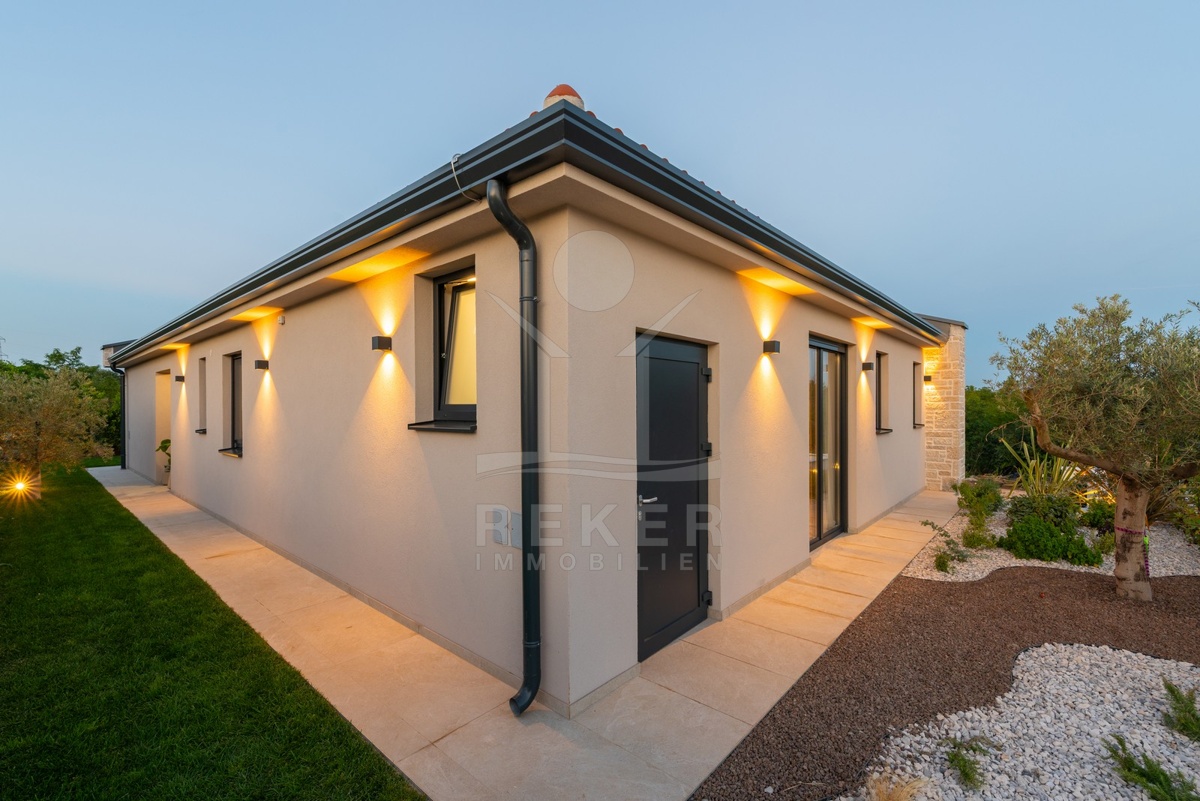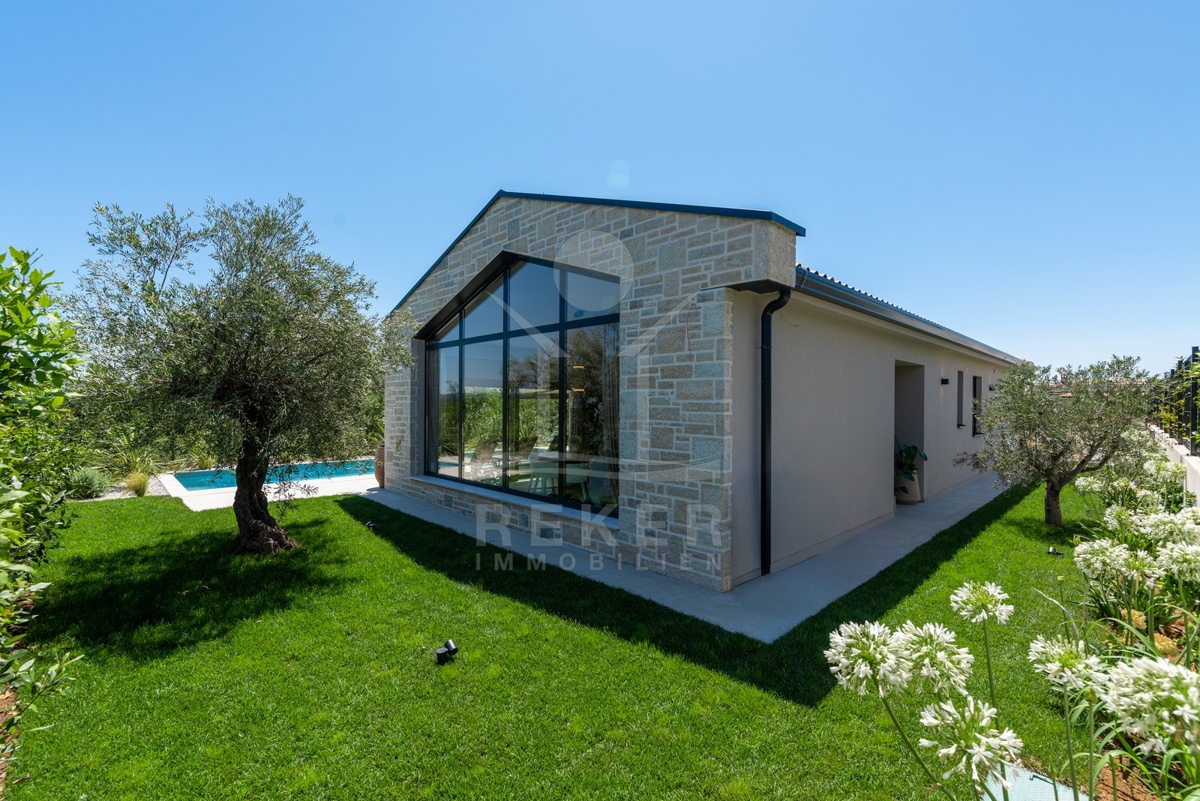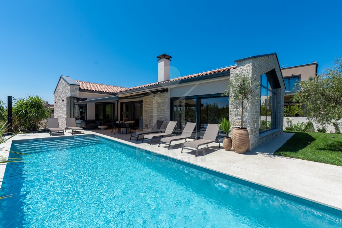 Ein Highlight für Designliebhaber: moderner Bungalow mit hochwertiger Ausstattung, Fußbodenheizung & Klimaanlage. Garten, Pool und Eleganz vereint in einer traumhaften Lage bei Poreč, nur 3 km vom Meer.