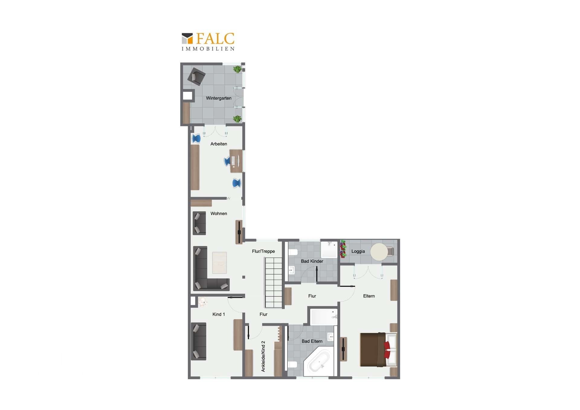 Ebenfalls im Obergeschoss befinden sich drei geräumige Schlafzimmer, die viel Platz für eine Familie bieten. Das Elternschlafzimmer verfügt über einen direkten Zugang zur Loggia. Das große moderne Eltern-Badezimmer mit frei stehender Badewanne und Einlaufdusche, sowie das "Kinderbad" mit Dusche runden das Angebot auf dieser Etage ab.
