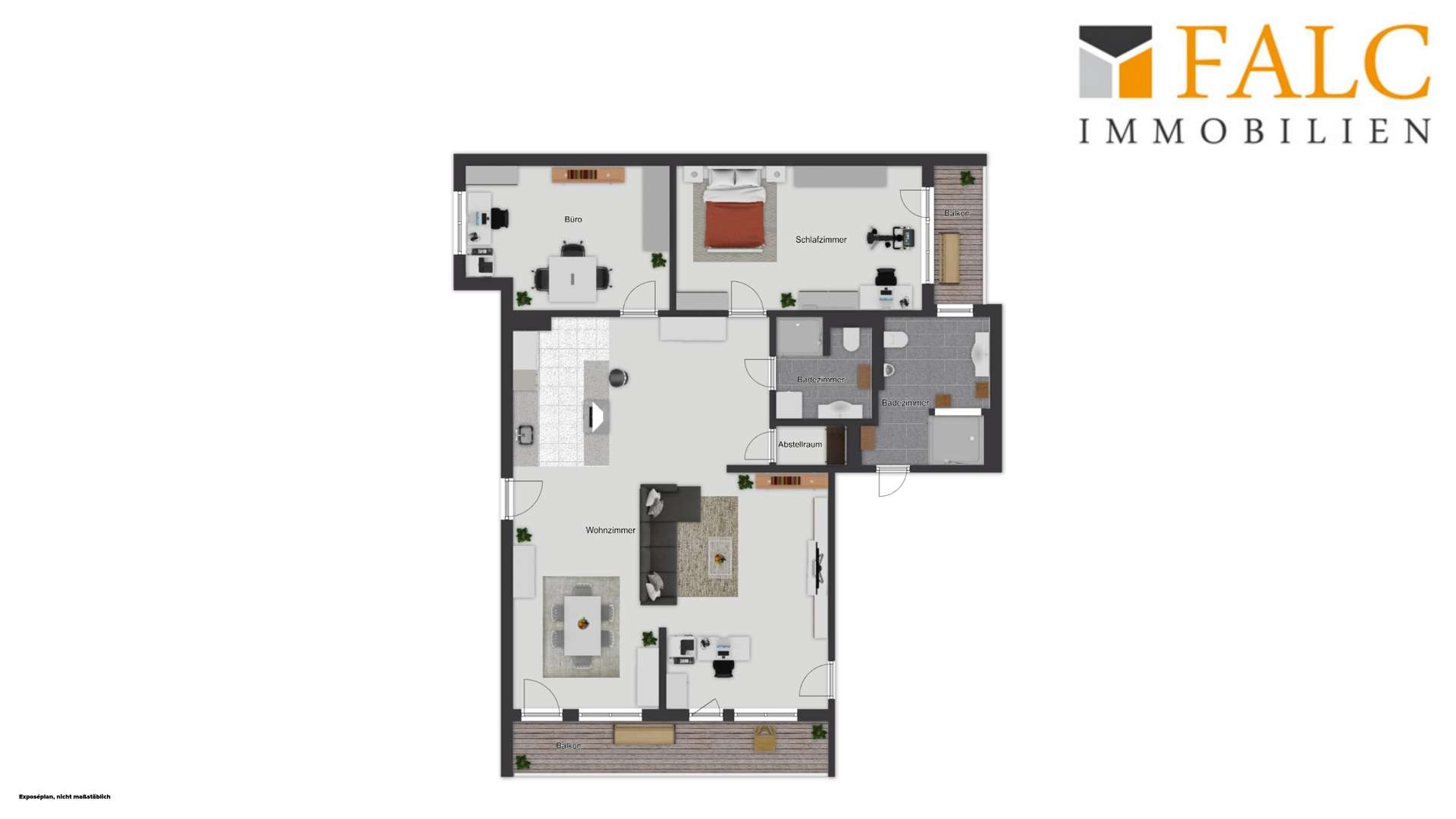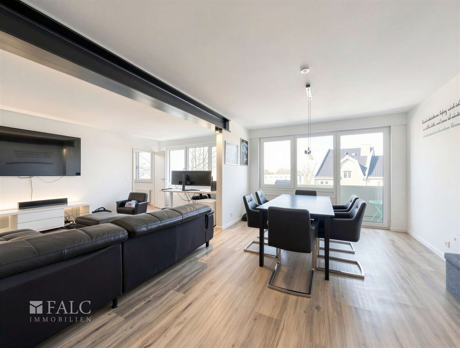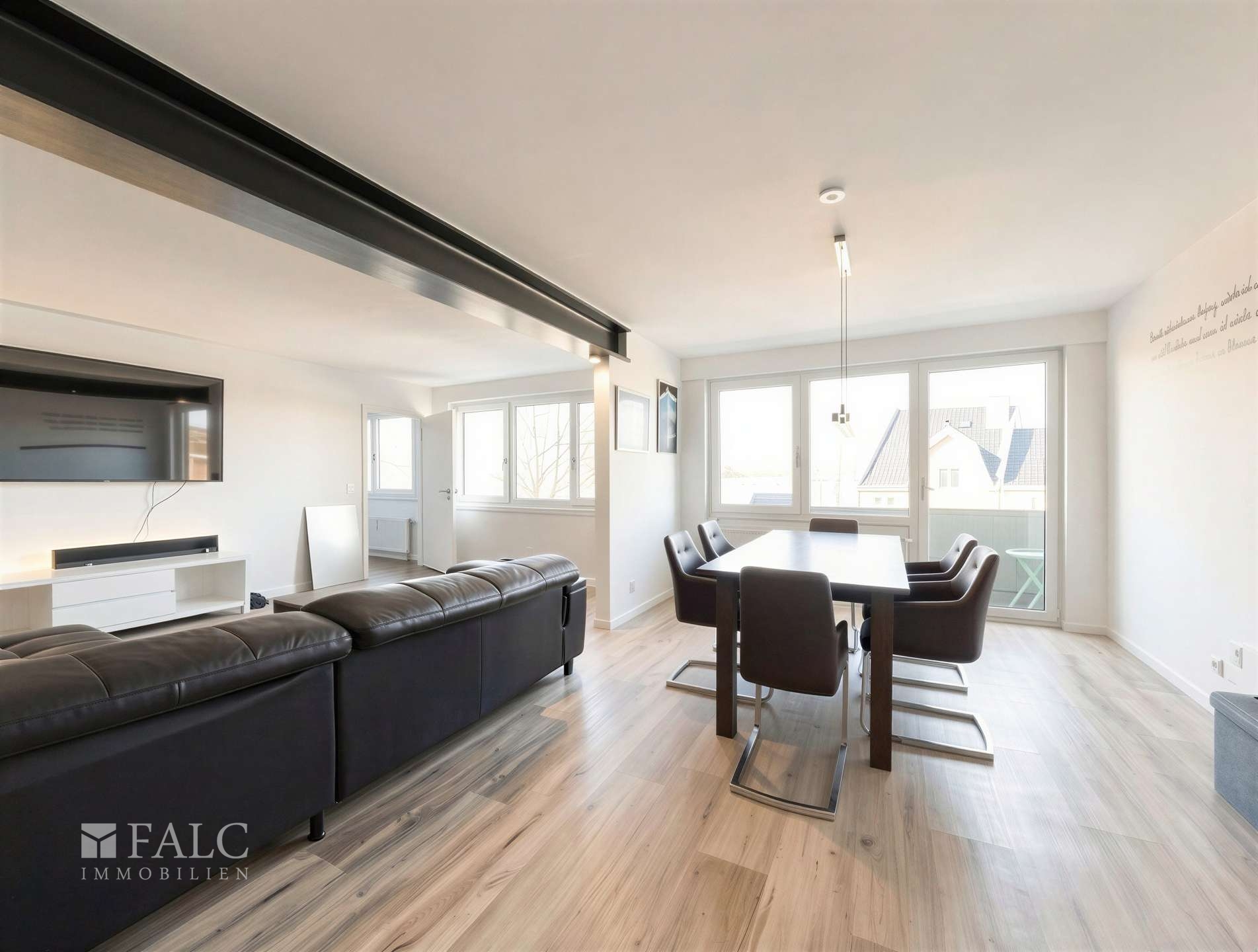 Große Fensterfronten lassen viel Tageslicht herein und führen auf den ersten Balkon, der vom Wohnbereich aus begehbar ist und zum Entspannen im Freien einlädt. Hier lassen sich sonnige Stunden und laue Sommerabende in angenehmer Atmosphäre genießen.