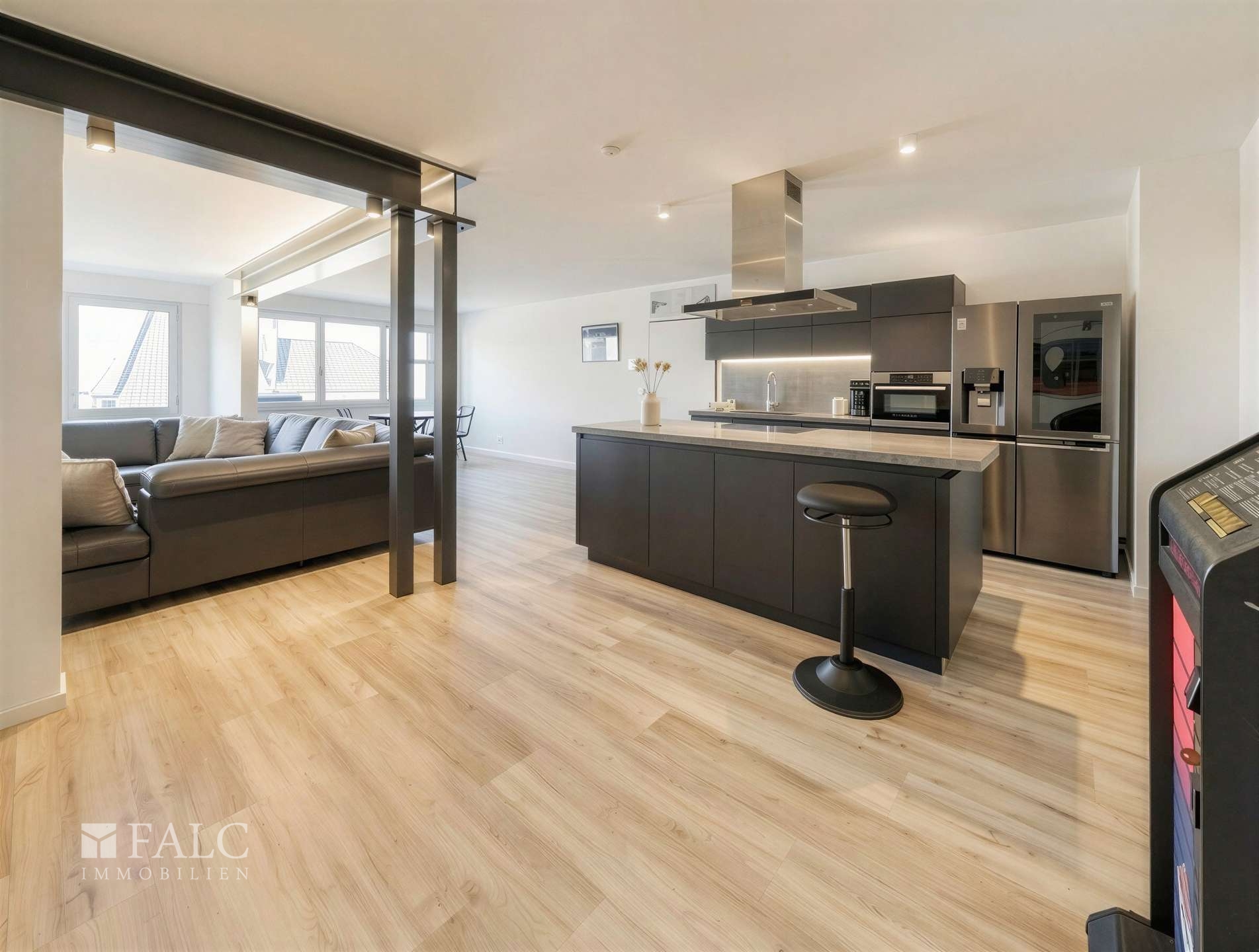 Bereits beim Betreten der Wohnung öffnet sich der Blick in den großzügigen Wohn- und Essbereich, der das Herzstück des Objekts bildet. Vom Eingangsbereich gelangt man direkt in den offenen Wohnraum, wo sich links die moderne Einbauküche der Marke Nolte mit hochwertigen Elektrogeräten befindet. Der weitläufige, offene Grundriss sorgt für ein luftiges Raumgefühl und verbindet Kochen, Essen und Wohnen auf harmonische Weise.