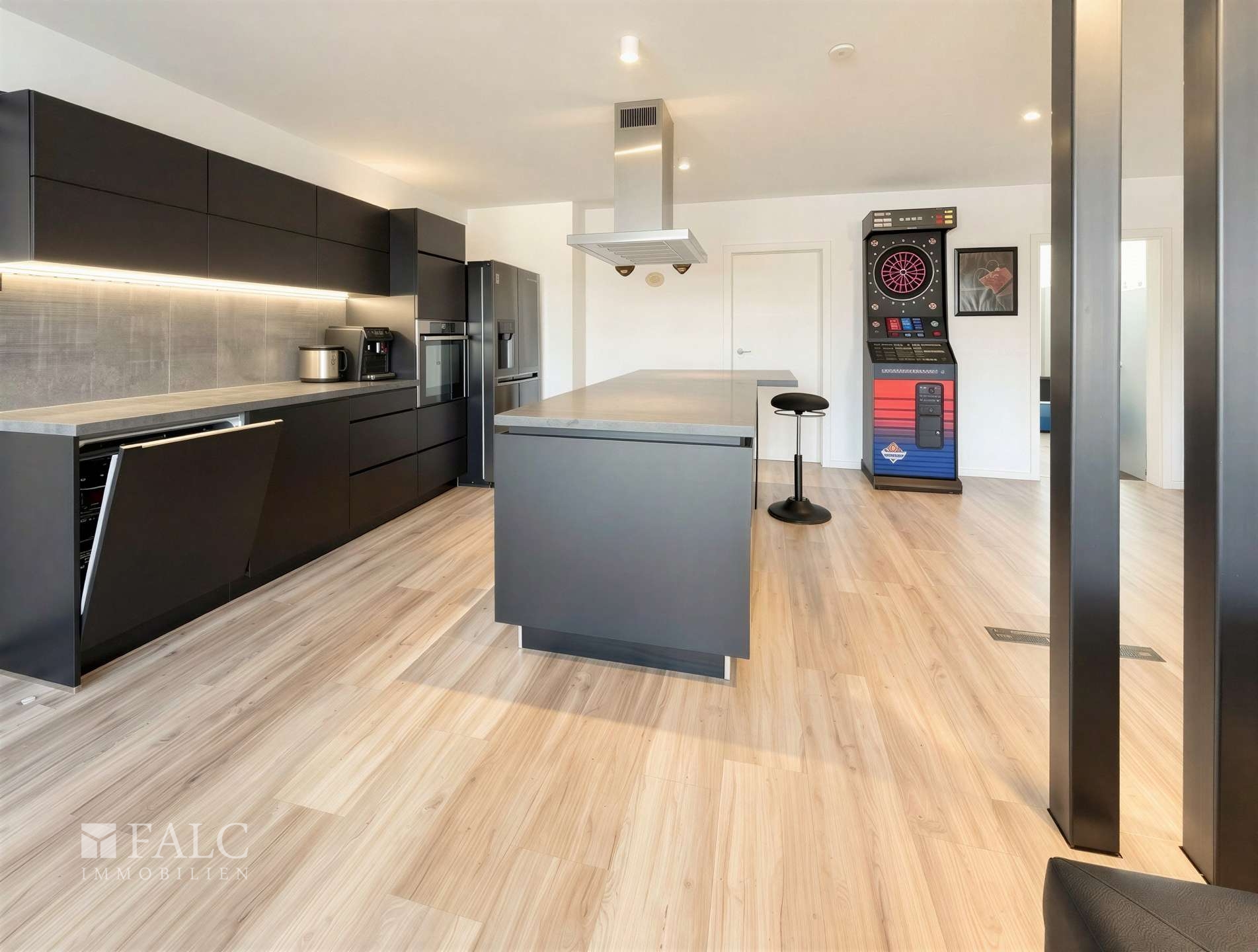 Die maßgefertigte Einbauküche fügt sich harmonisch in den offenen Wohn- und Essbereich ein und überzeugt durch ihr elegantes Design, hochwertige Markenelektrogeräte sowie durchdachten Stauraum. Hier lassen sich kulinarische Ideen ebenso gut umsetzen wie gesellige Abende mit Familie oder Freunden genießen – in einer Atmosphäre, die Stil und Behaglichkeit vereint.
