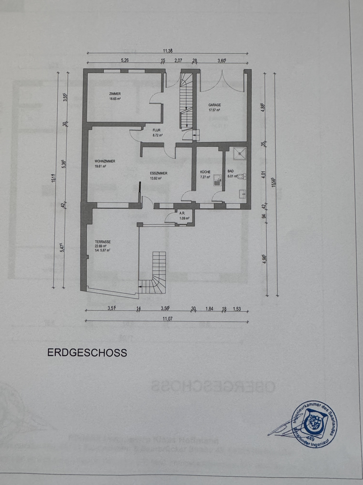 Über nur 4 Stufen betreten Sie den Eingangsbereich. Bei Bedarf könnte hier eine vollständige Trennung in zwei Wohneinheiten (EG und OG) erfolgen, da direkt links die Treppe zum OG führt. Im EG-Flur befindet sich rechts ein sehr großes Schlafzimmer und, weiter auf der rechten Seite, eine Garderobennische. Links ist der Zugang zur Pkw-Garage und der geschlossene Treppenabgang zum Untergeschoss. Geradeaus führt der Flur zum geräumigen Wohn-/Esszimmer. Dem Essbereich grenzt direkt die Küche (mit Einbauküche) an und weiter das Badezimmer (mit Dusche). Im Essbereich gelangen Sie auf die große Terrasse, die einen kleinen Abstellraum besitzt. Eine Außentreppe führt von der Terrasse in den Garten.