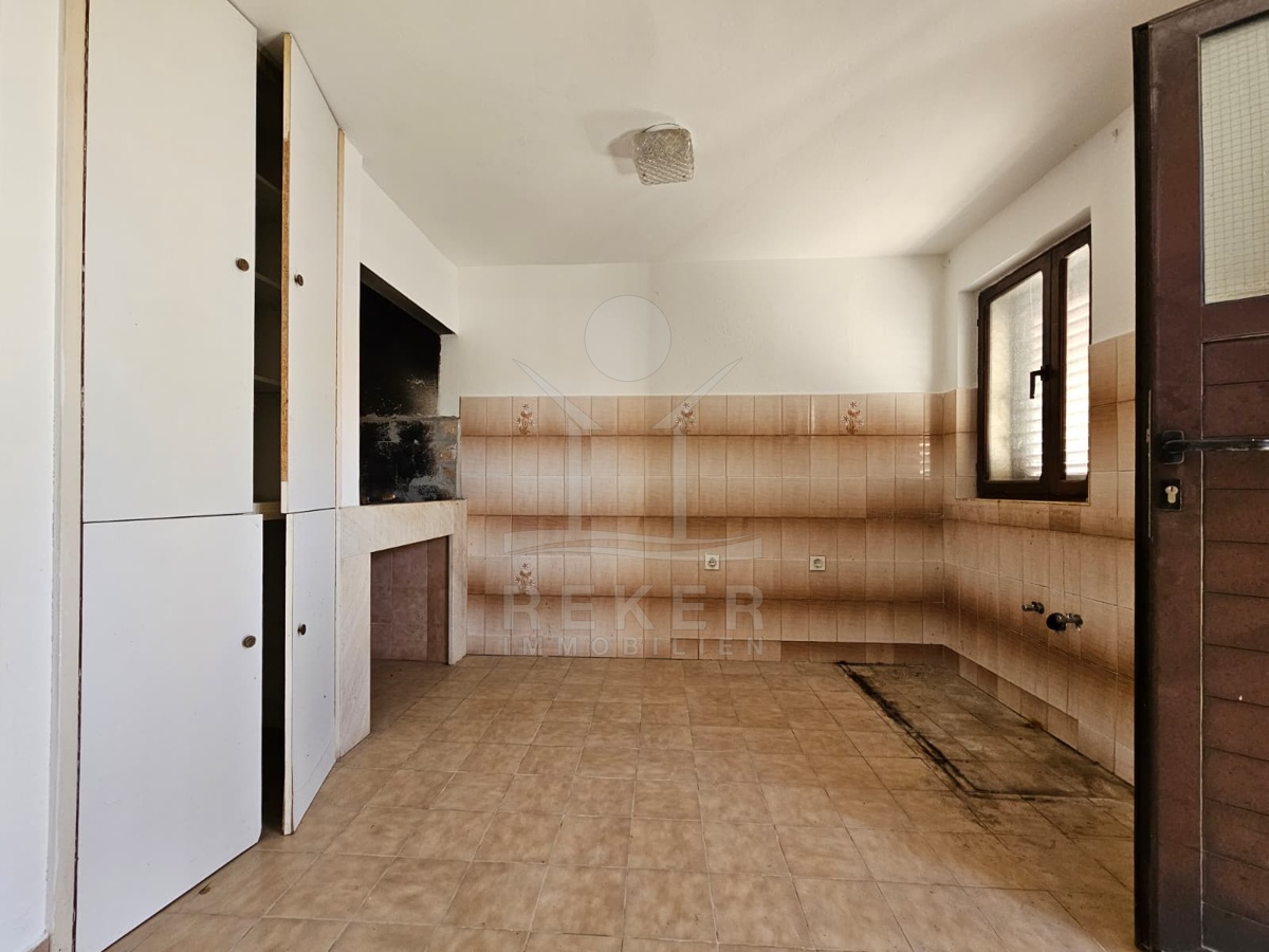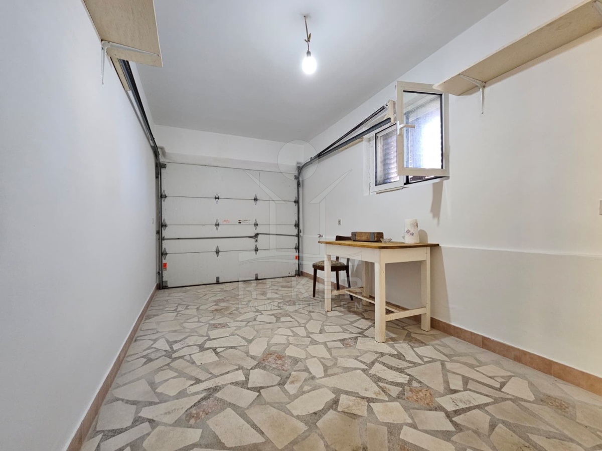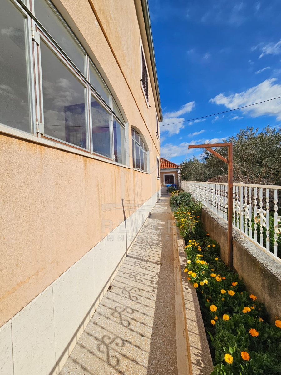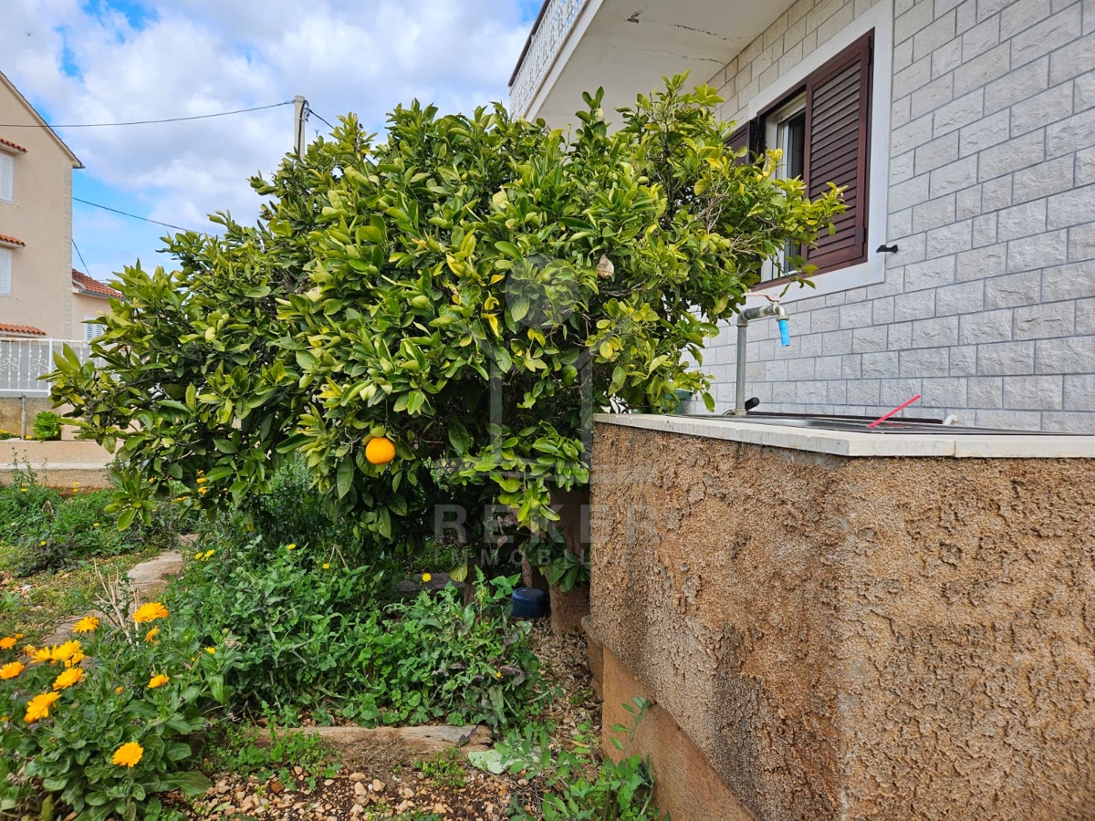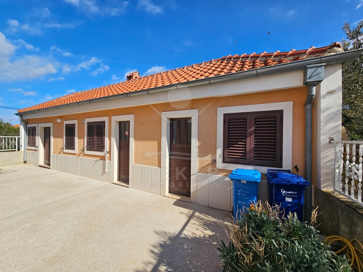 Nur 120 Meter vom Meer entfernt steht dieses freistehende Haus in ruhiger Lage nahe Šibenik. Es befindet sich im Zentrum einer gepflegten Siedlung. Den angelegten Strand erreichen Sie nach rund 250 Metern. Das Grundstück umfasst 400 m² und bietet angenehme Proportionen. Ihr Fahrzeug parken Sie im Hof oder in der etwa 14 m² großen Garage.