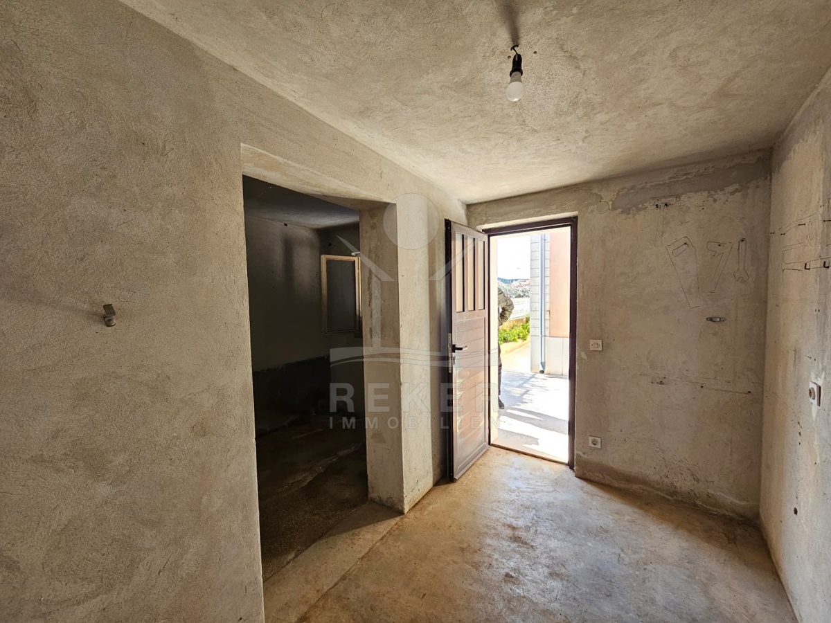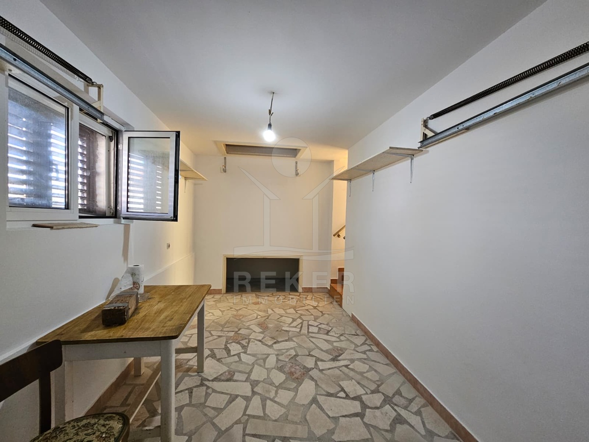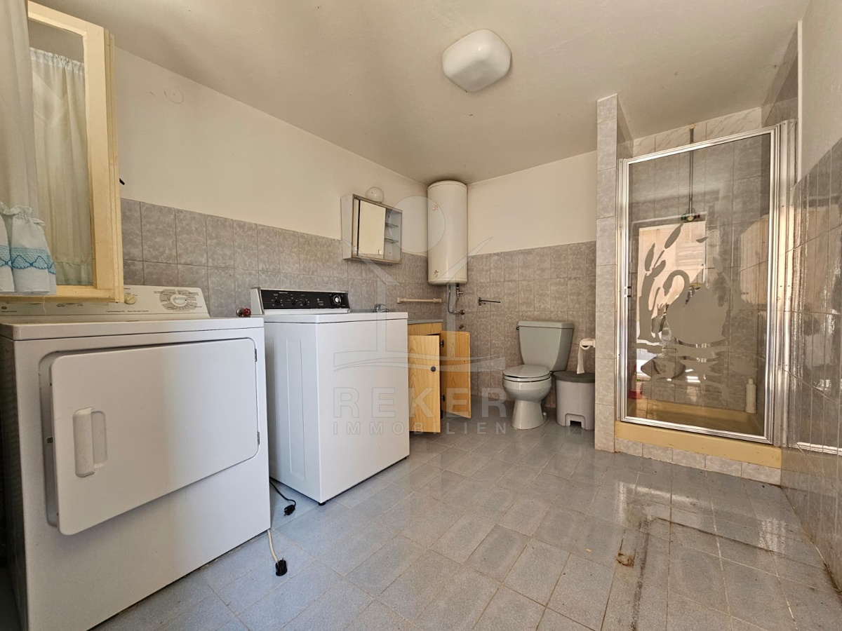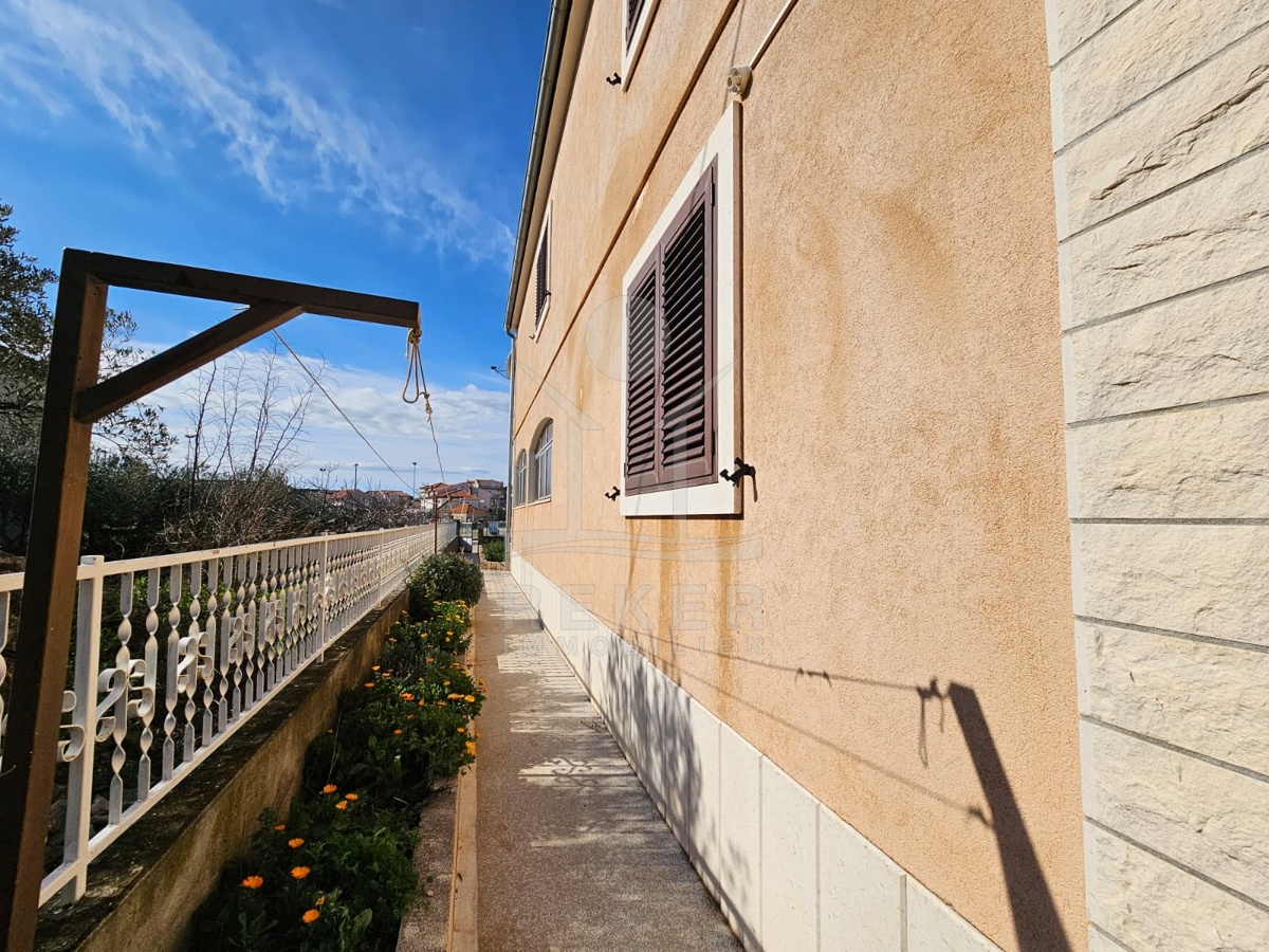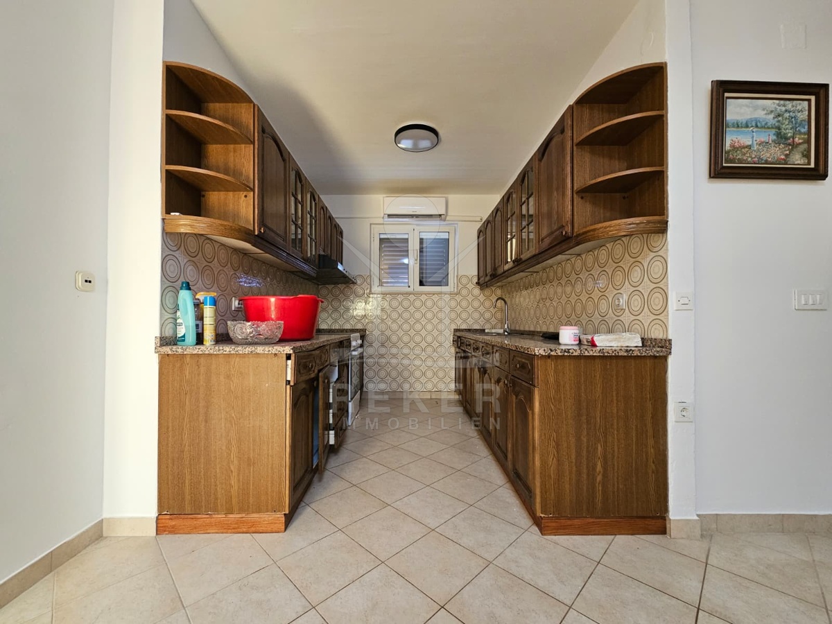 Nur 120 Meter vom Meer entfernt steht dieses freistehende Haus in ruhiger Lage nahe Šibenik. Es befindet sich im Zentrum einer gepflegten Siedlung. Den angelegten Strand erreichen Sie nach rund 250 Metern. Das Grundstück umfasst 400 m² und bietet angenehme Proportionen. Ihr Fahrzeug parken Sie im Hof oder in der etwa 14 m² großen Garage.