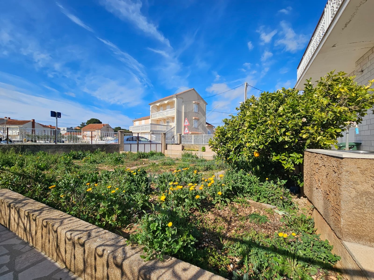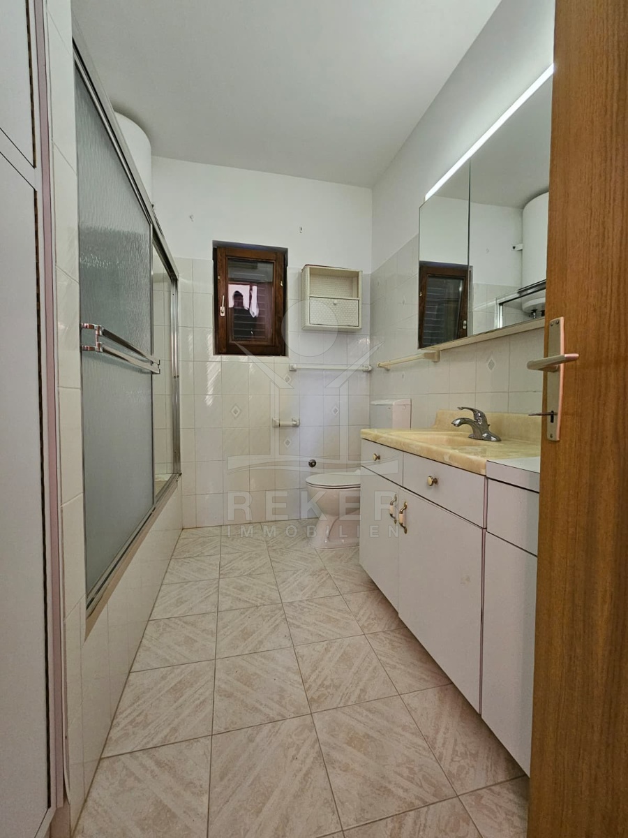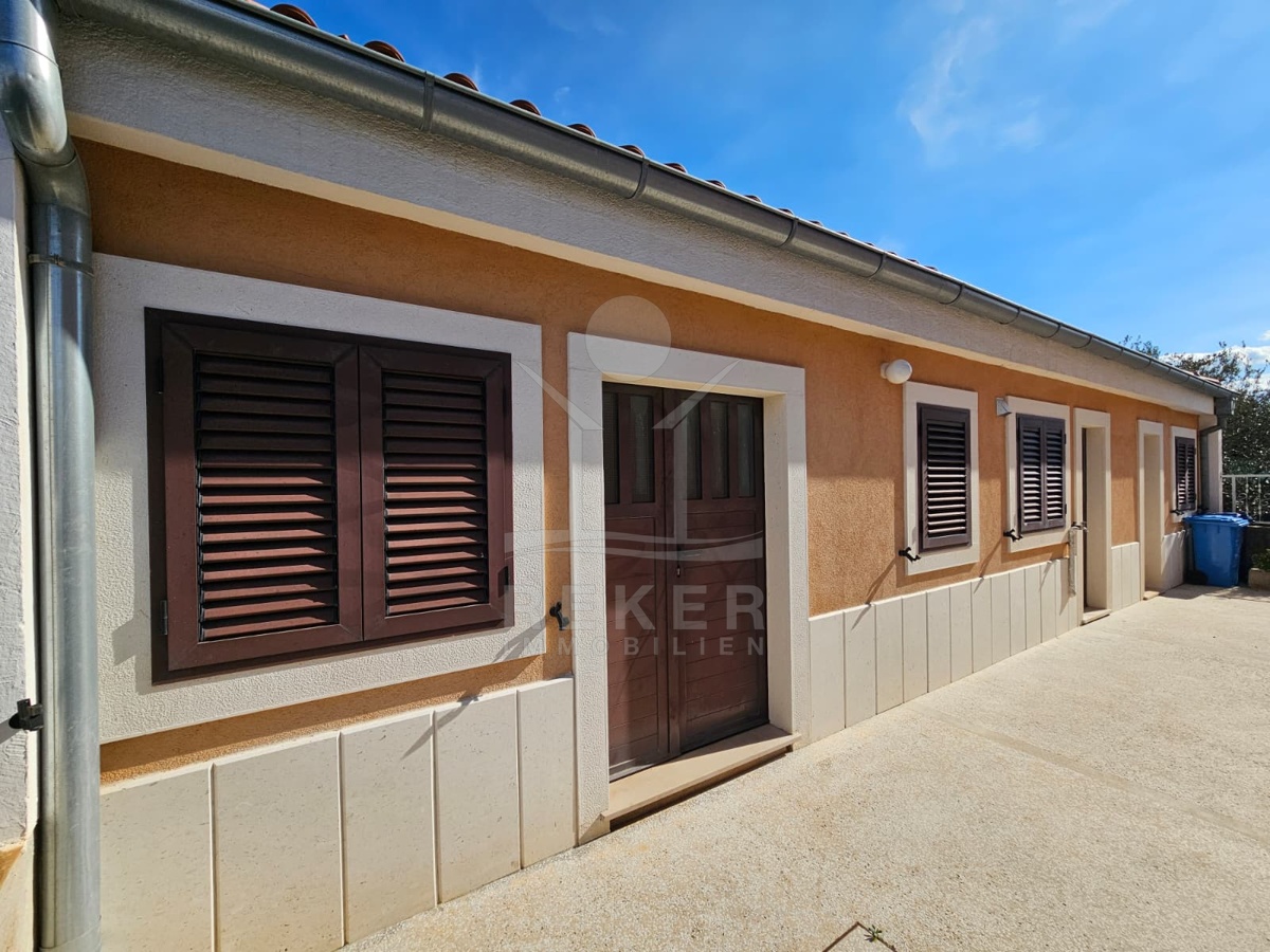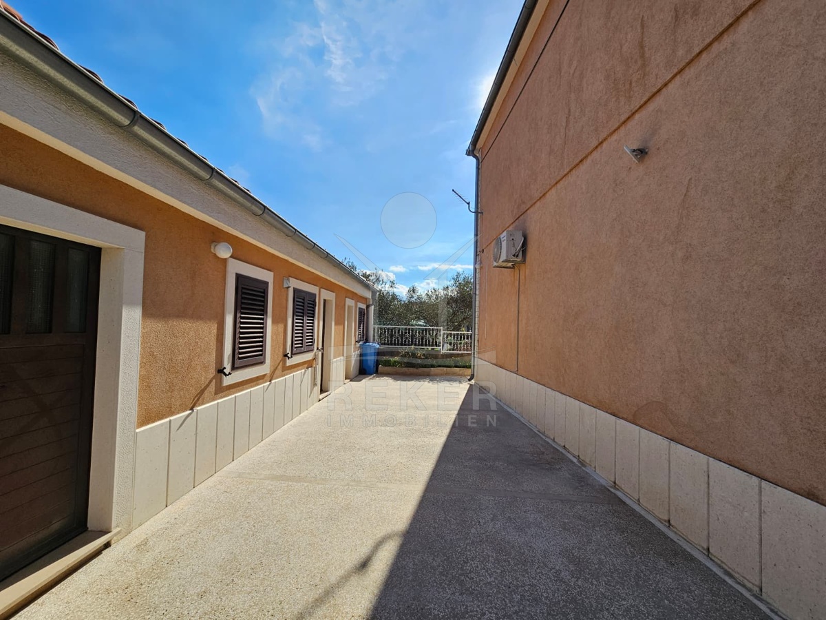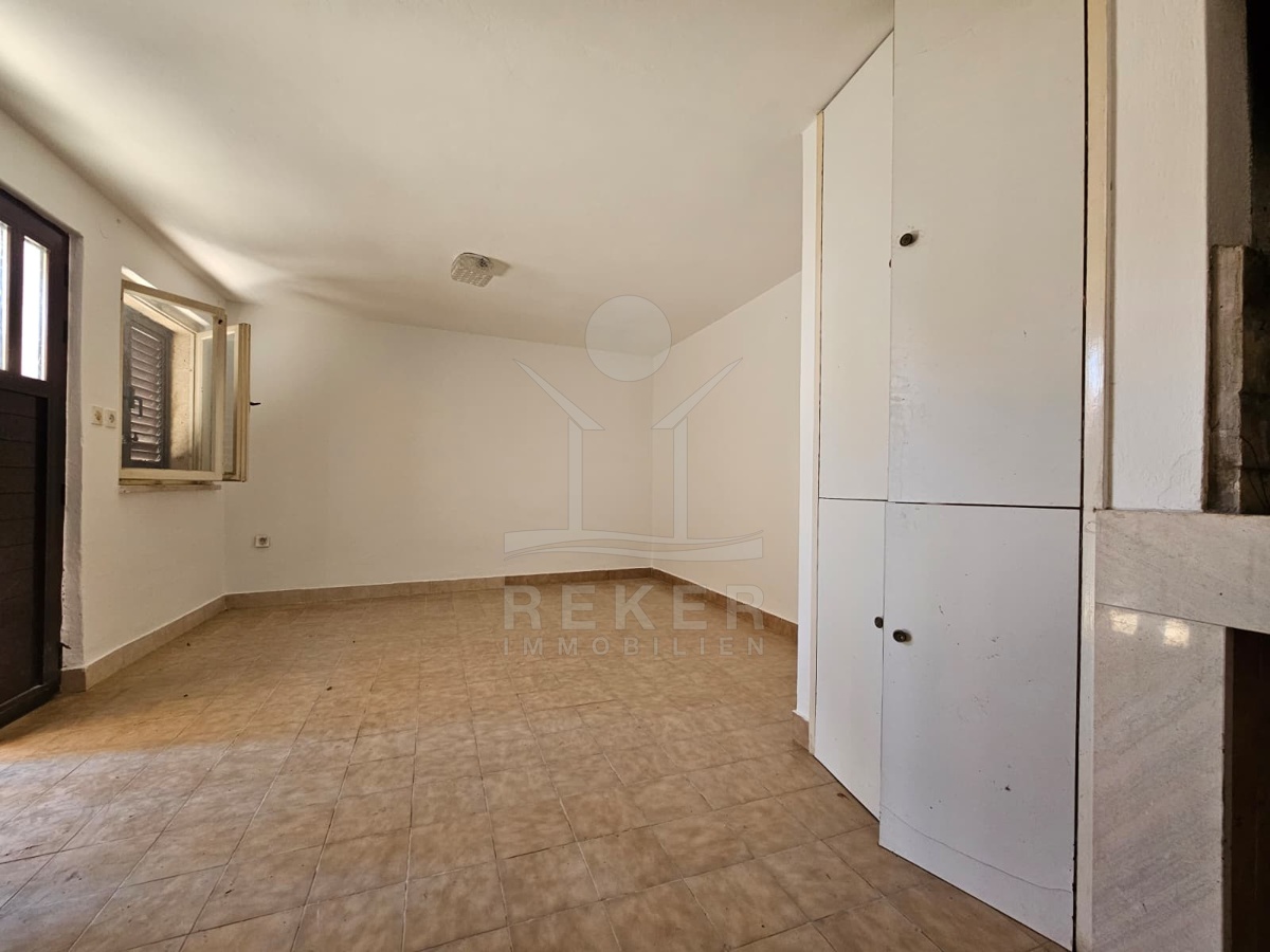 Nur 120 Meter vom Meer entfernt steht dieses freistehende Haus in ruhiger Lage nahe Šibenik. Es befindet sich im Zentrum einer gepflegten Siedlung. Den angelegten Strand erreichen Sie nach rund 250 Metern. Das Grundstück umfasst 400 m² und bietet angenehme Proportionen. Ihr Fahrzeug parken Sie im Hof oder in der etwa 14 m² großen Garage.