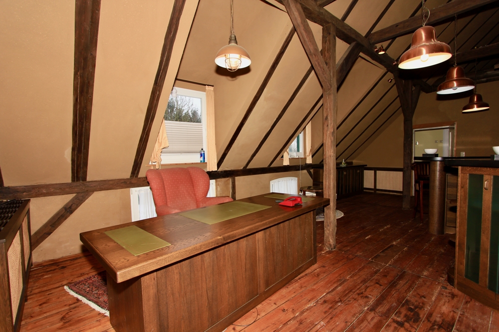 Im Dachgeschoss erwartet Sie ein rustikal gestalteter, bis in den Giebel offen ausgebauter Salon mit Thekenbereich. Dieser Bereich eignet sich ideal als gemütlicher Loungebereich, Aufenthaltsraum oder repräsentativer Wohnbereich mit besonderem Charme.