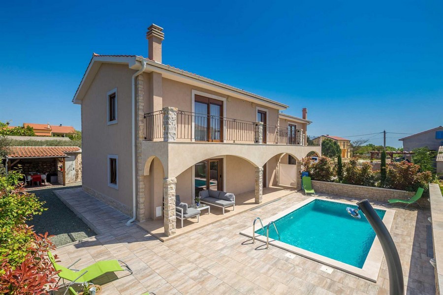 Das Haus wurde im Jahr 2015 auf einem 859 m² großen Grundstück in einem ruhigen Ort in der Region Krk errichtet und bietet eine Gesamt fläche von etwa 400 m². Jede Doppelhaushälfte erstreckt sich über zwei Etagen und ist wie folgt aufgeteilt: