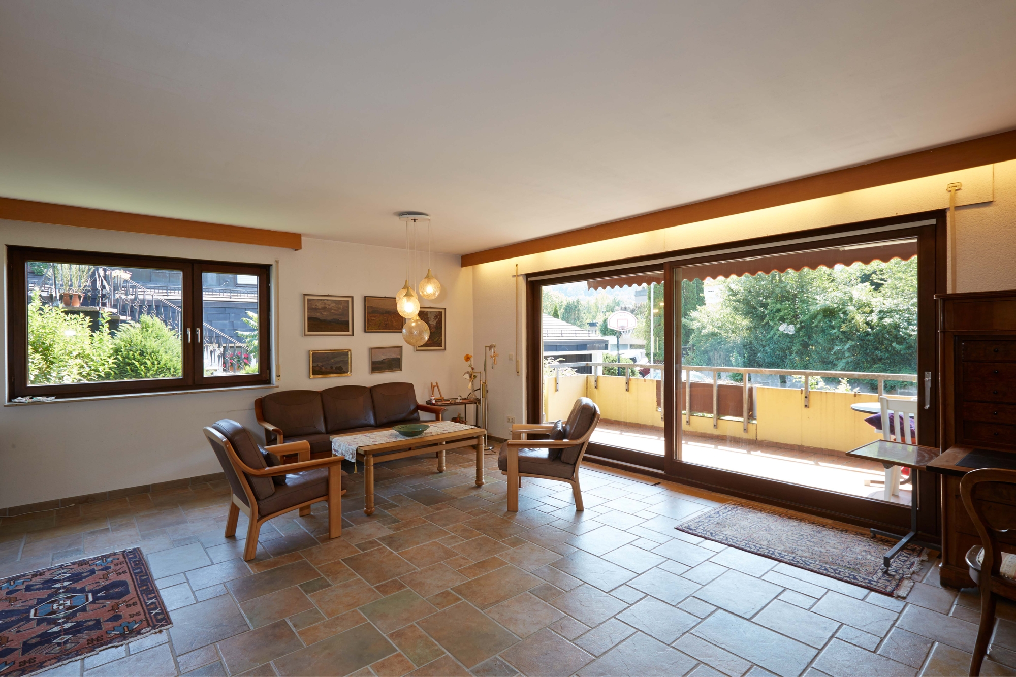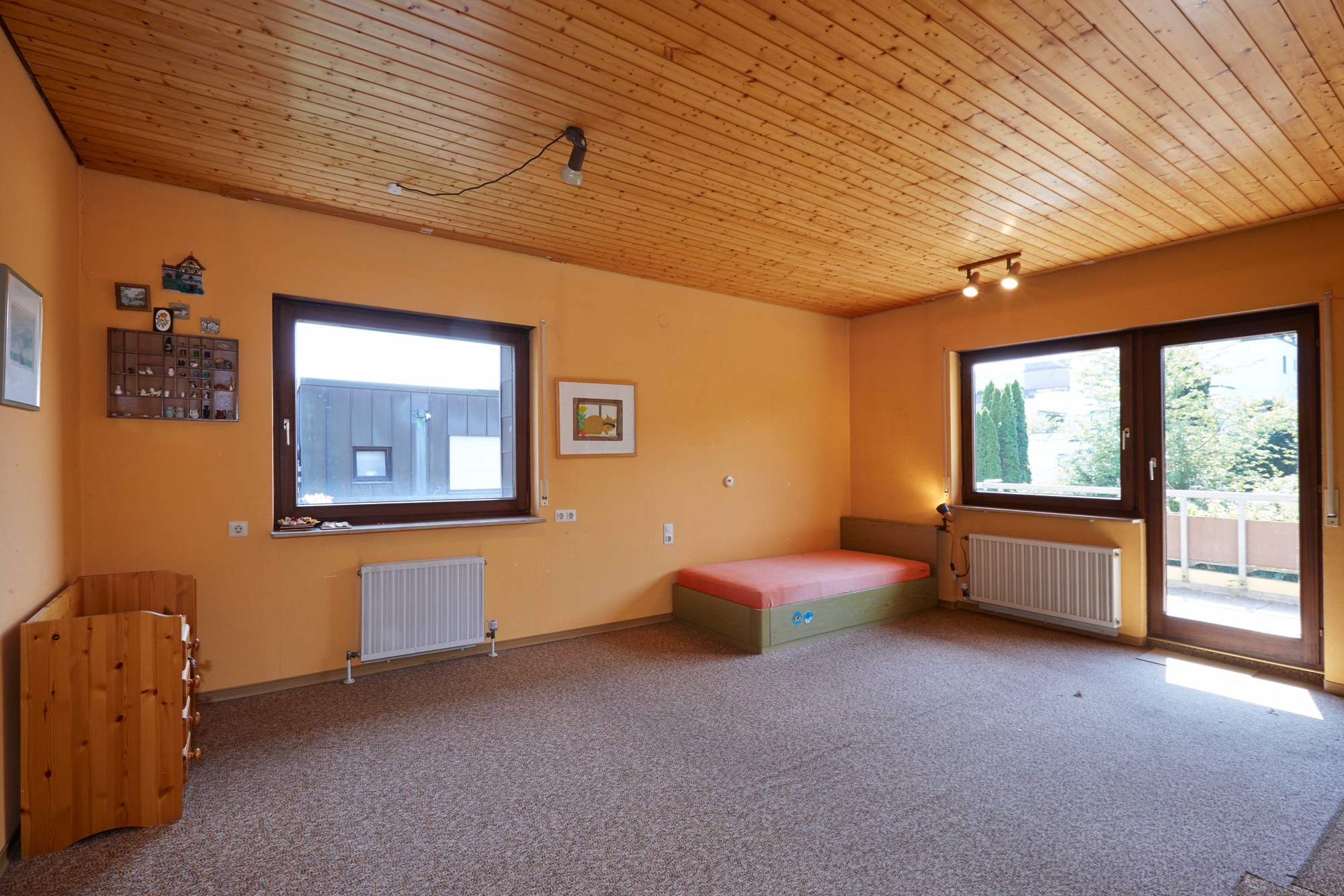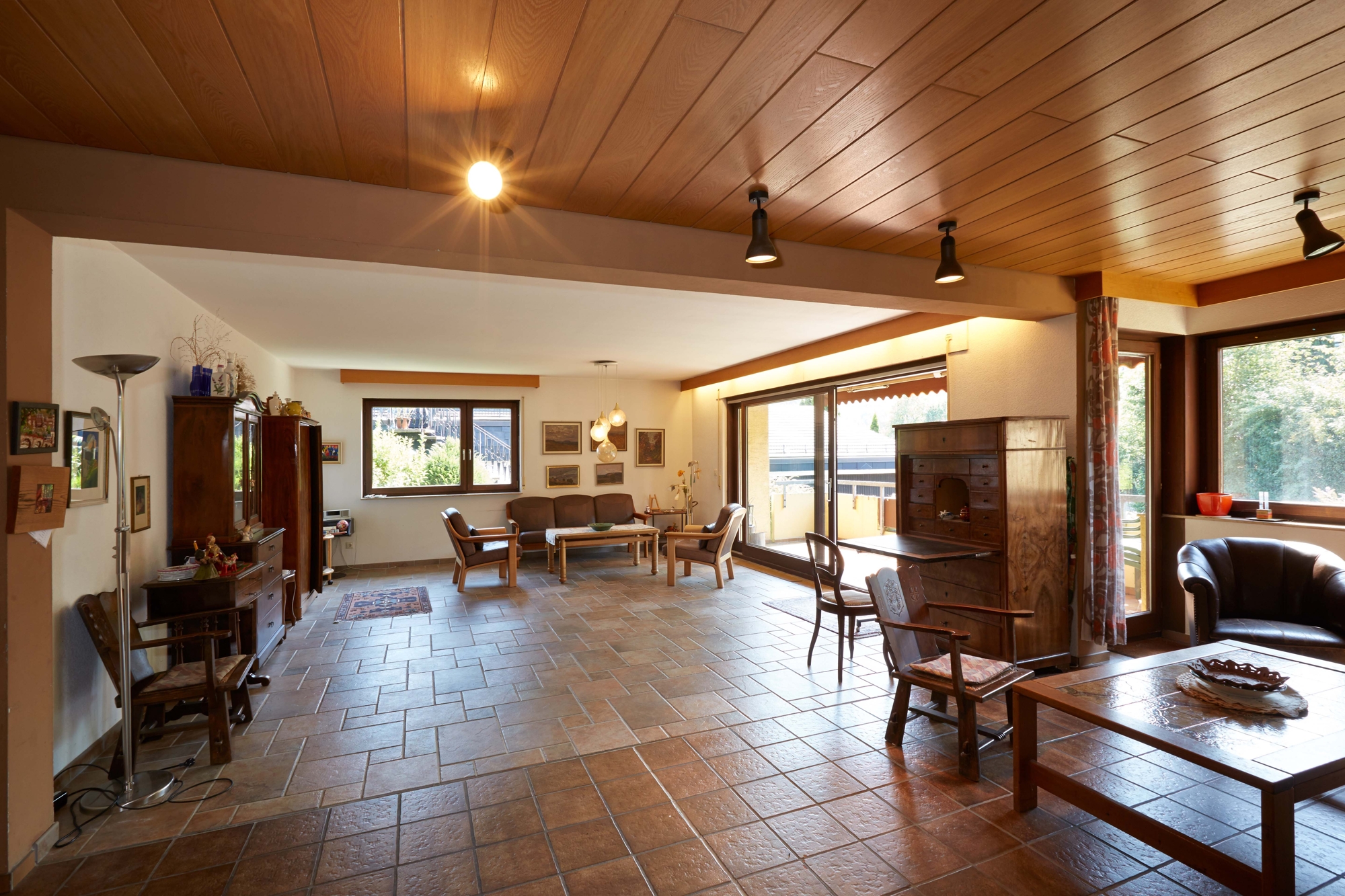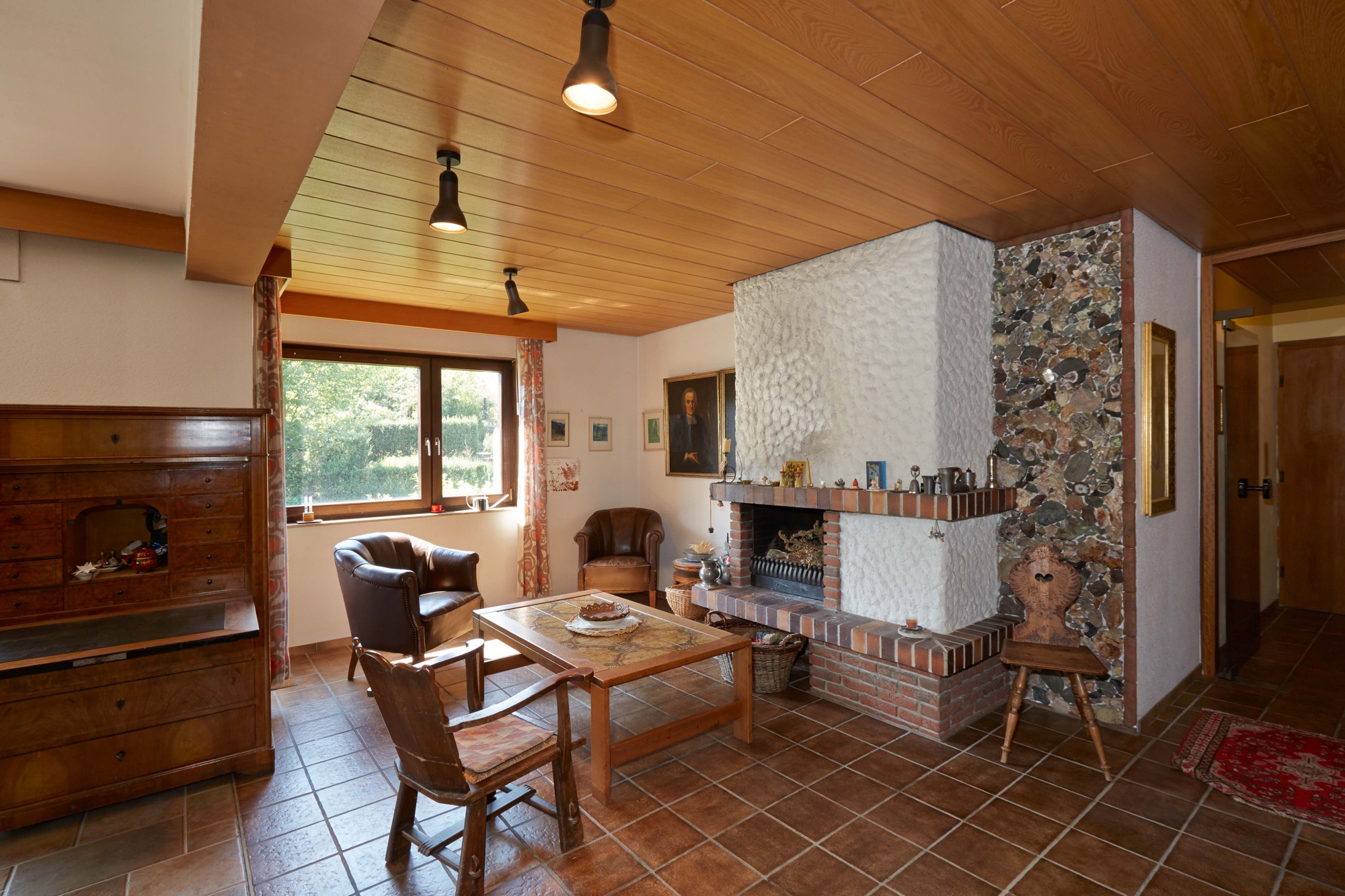 Erdgeschoss (EG): •ca. 100 m² Wfl. Wohnfläche •Wohnzimmer mit Zugang zum Balkon •Essbereich mit offenem Kamin •Wohn-Küche mit Einbauküche/Elektrogeräten (alt) •Büroraum •WC separat •Garderobe und Abstellraum •Fliesenböden im Wohn-Essbereich/Küche/Bad/WC, Teppichboden