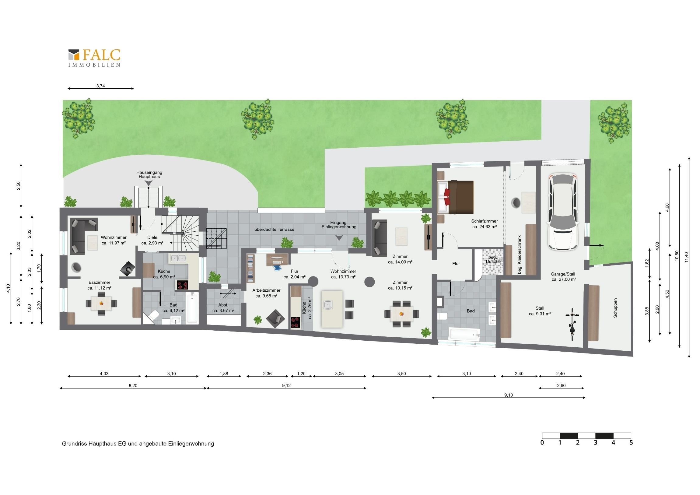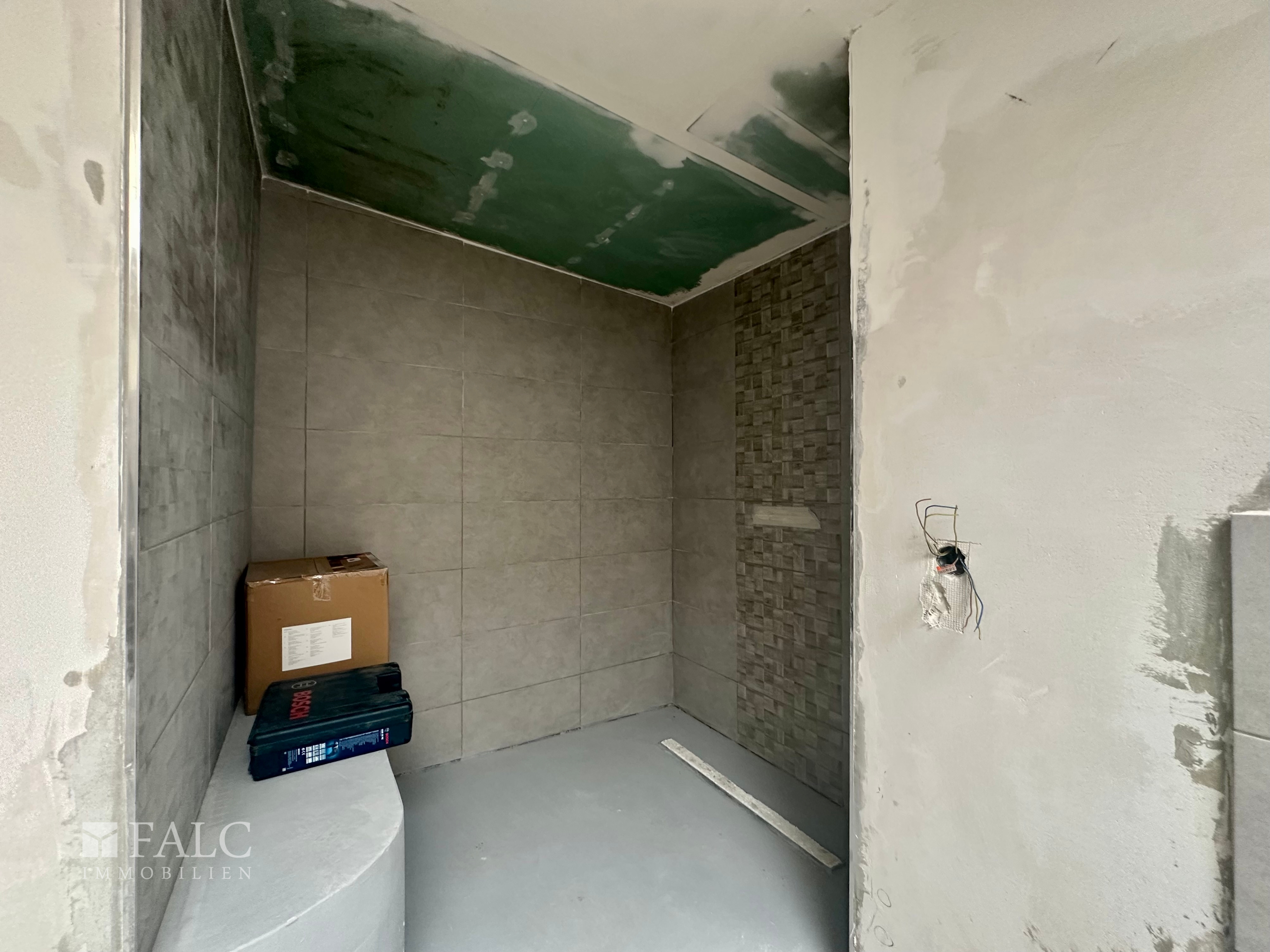 Ein Teil der Materialien für die ausstehenden Fertigstellungsarbeiten wurde bereits beschafft und ist im Kaufpreis enthalten – ideal für Käufer, die zügig mit dem Innenausbau fortfahren möchten. Ausstattung – Doppelhaushälfte (Haupthaus) - Baujahr ca. 1958 - Ca. 80 m² Wohnfläche - vier Zimmer (Wohn-, Ess-, Schlaf-Kinder und Hobby-/Arbeitszimmer) - Innenliegendes Badezimmer mit Wanne und hellen Fliesen - Doppelverglaste Fenster mit Rollläden - Böden mit Laminat ausgestattet - Keller vorhanden, Dachgeschoss bereits isoliert - Leitungen für Wasser, Abwasser und Elektro im Dachgeschoss vorhanden - Ausbaureserve für zusätzliches Zimmer mit Bad - Kamin im Wohnbereich Ausstattung – Bungalow (Anbau) ** ca. 120 m² ebenerdige Wohnfläche ** Rohbau und Putzarbeiten abgeschlossen ** Beheizung über Klimaanlagensystem ** Elektroinstallation vollständig vorhanden ** Offener Wohn-, Ess- und Küchenbereich ** Teilweise hohe Decken ** Großes Schlafzimmer mit Kosmetikecke ** Offene Nische als begehbarer Kleiderschrank ** helles Schlafzimmer mit Zugang zum Außenbereich ** Arbeits- und Hobbyzimmer ** Hausanschlussraum incl. Wasch- und Trockneranschluss ** Dachgeschossausbau möglich (Leitungen vorhanden) ** Öffnung für Wendeltreppe vorbereitet ** Flachdach zum Teil zweigeschossiger Aufbau ** Terrasse ca. 22 m², große Garage am Anbau, Schuppen ** Grundstücksfläche: 1.143 m²davon 626 m² als Wohnbaufläche ausgewiesen