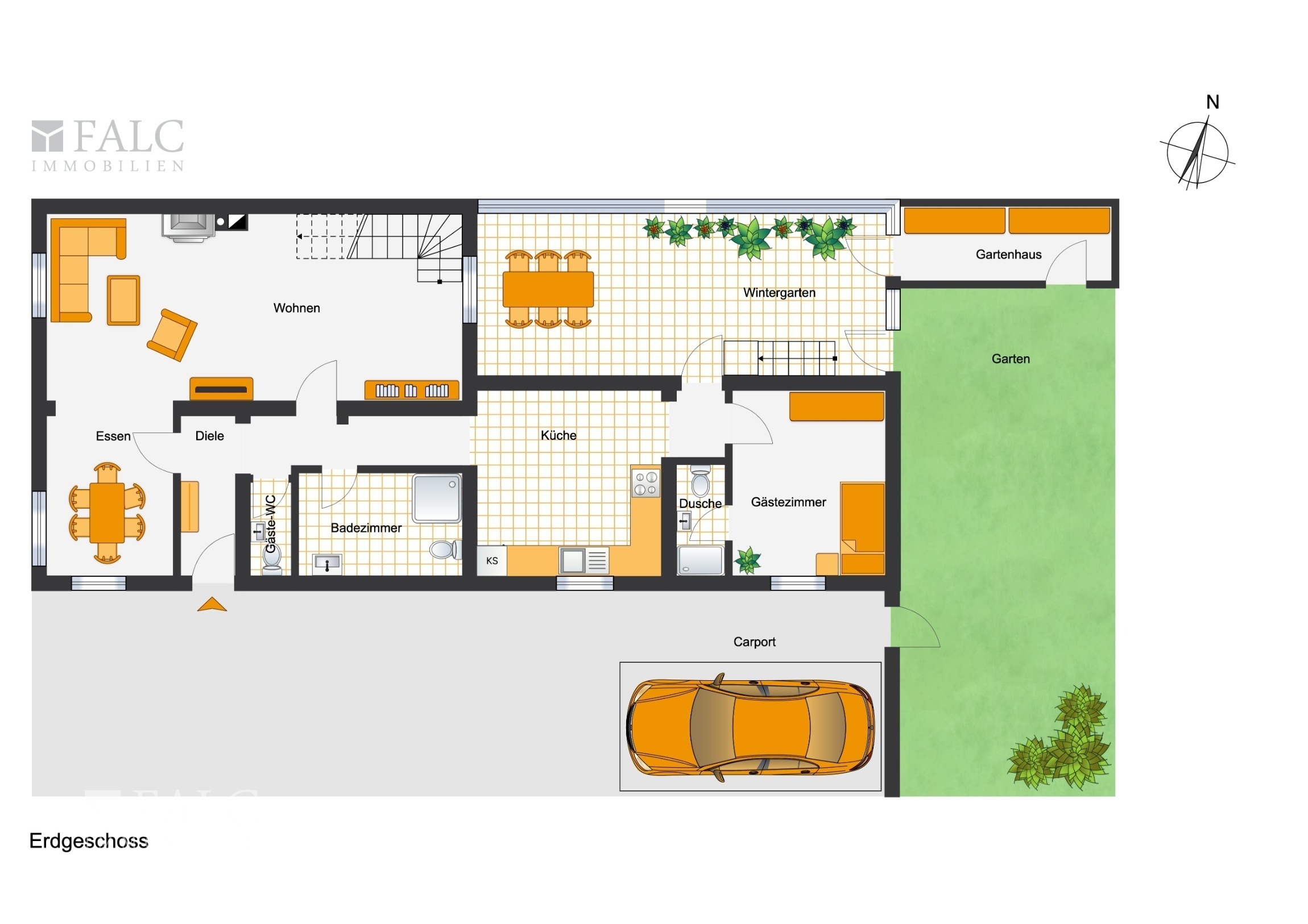 Raumaufteilung Erdgeschoss: • Wohnzimmer mit Essbereich • Badezimmer mit Dusche und WC • Gästezimmer mit eigenem Bad • Gäste-WC • Küche • Diele • Flur