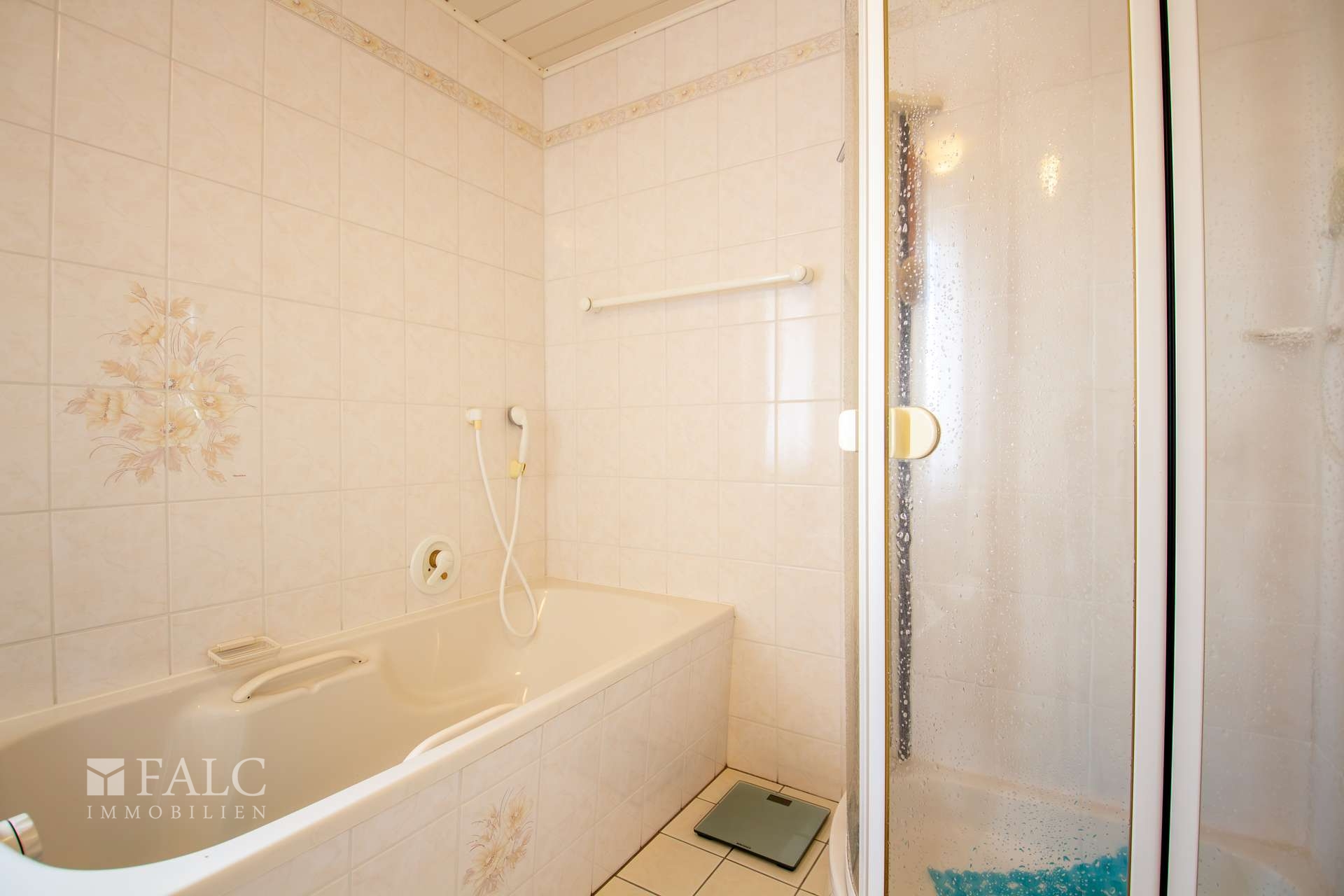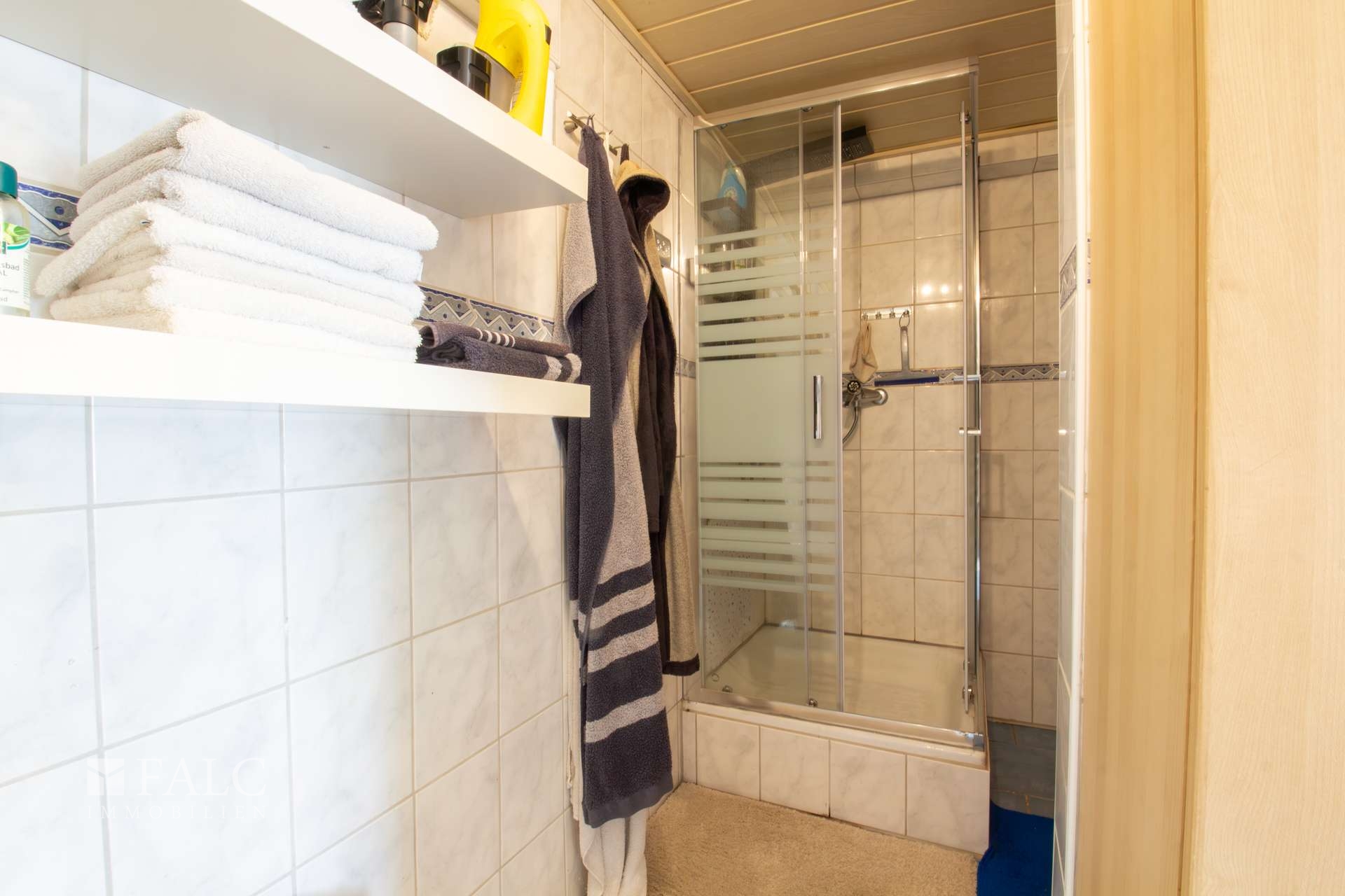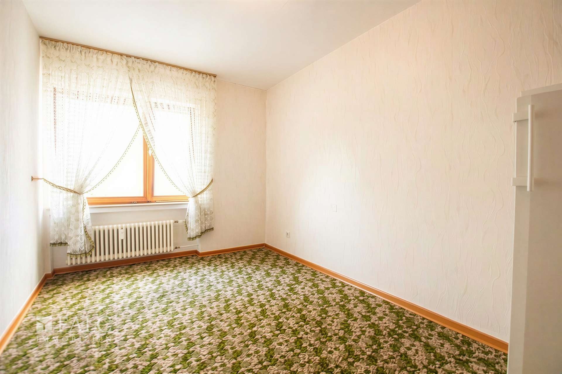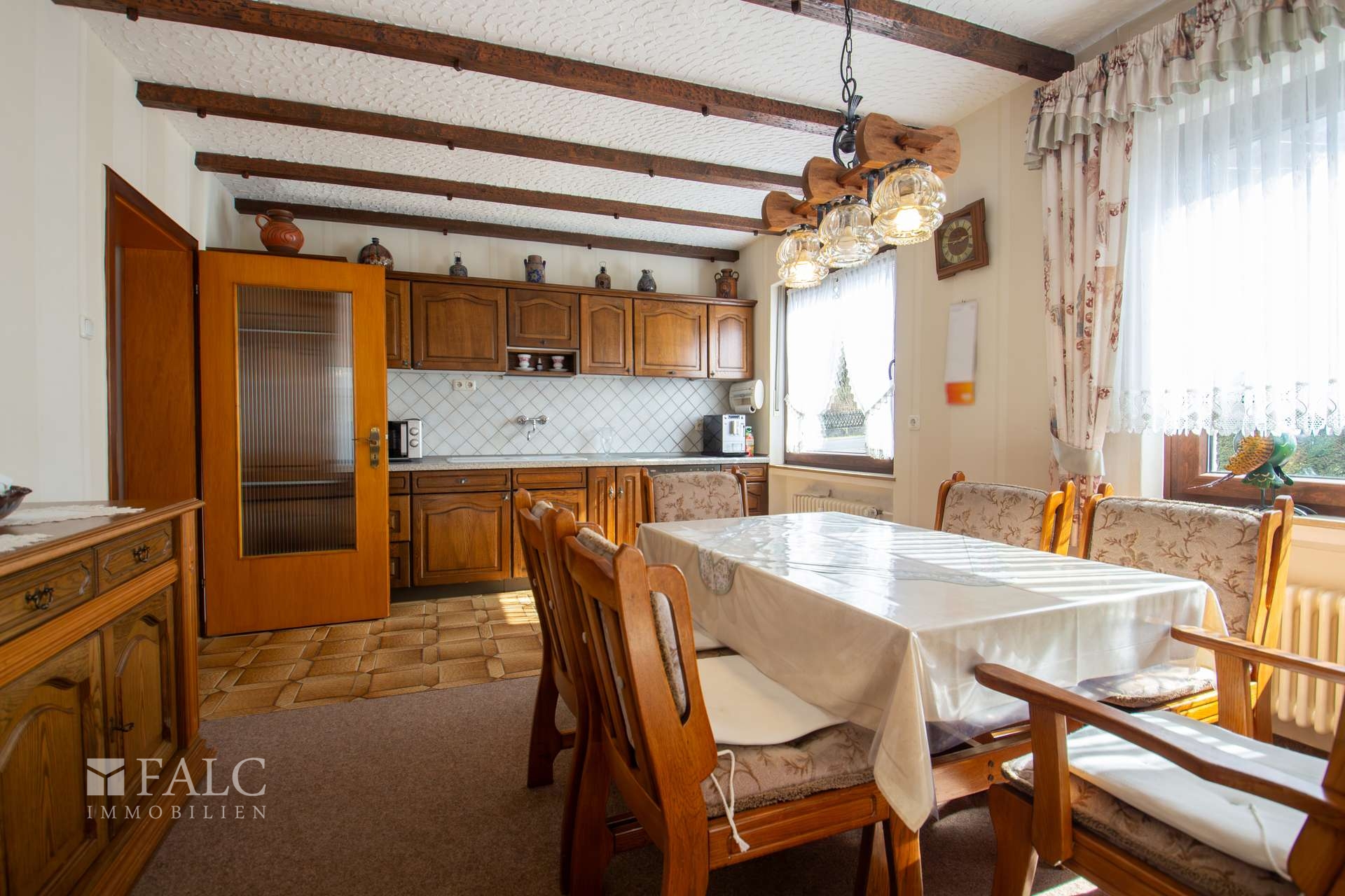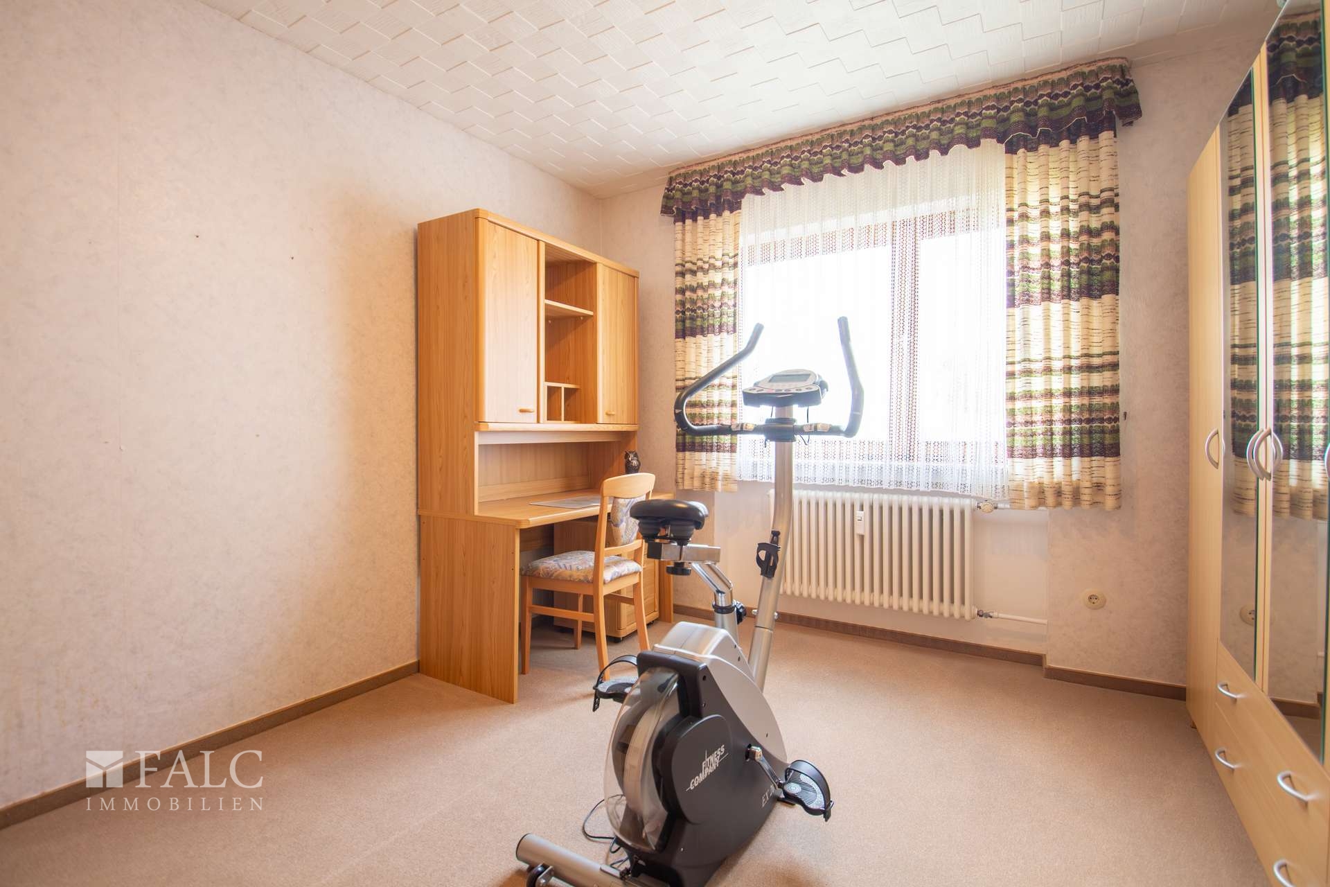 Im folgenden Text wird die Ausstattung des Zweifamilienhauses näher beschrieben. In den Wohnräumen des Wohnhauses sind die Böden im Erdgeschoss mit Teppich und Laminat ausgestattet. In der Küche liegt ein Linoleumboden. Das Dachgeschoss ist mit Teppich und Linoleum ausgestattet. Die Böden im Kellergeschoss sind gefliest. Die zweifachverglasten Holzfenster sind aus dem Baujahr. Einige Fenster wurden im Jahre 2021 durch zweifachverglaste Kunststofffenster erneuert. Alle Fenster sind mit Rollläden ausgestattet. Als Innentüren wurden braune Holztüren und Holztüren mit Glasausschnitt verwendet. Die Verbindungen vom Erd- ins Dachgeschoss und vom Erd- ins Kellergeschoss erfolgen über massive Treppen. Das Haus wird über eine Ölzentralheizung aus dem Jahre 1990 beheizt. In allen Wohnräumen sind Heizkörper vorhanden. Die Warmwassererzeugung erfolgt ebenfalls über die Ölzentralheizung. In der Dachgeschosswohnung wird in der Küche das Wasser über einen Boiler erwärmt. Das Badezimmer im Erdgeschoss ist aus den 90’er Jahren. Es ist mit hellen Wandfliesen raumhoch gefliest. Es verfügt über eine Badewanne und eine Dusche. Das Badezimmer im Dachgeschoss ist raumhoch mit hellen Fliesen gefliest. Es verfügt über eine Badewanne. Das Dach des Wohnhauses ist mit Kunstschieferplatten eingedeckt. Die Dachgeschosswohnung ist derzeit für eine Kaltmiete in Höhe von 370,- Euro vermietet.