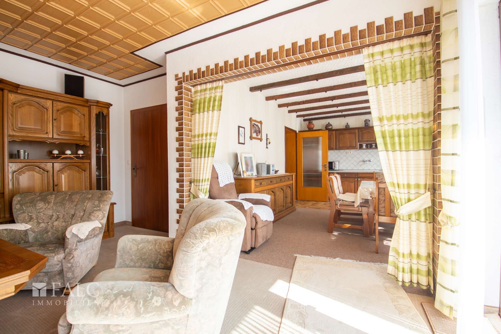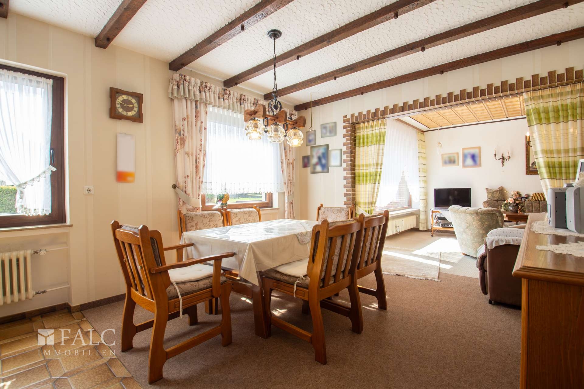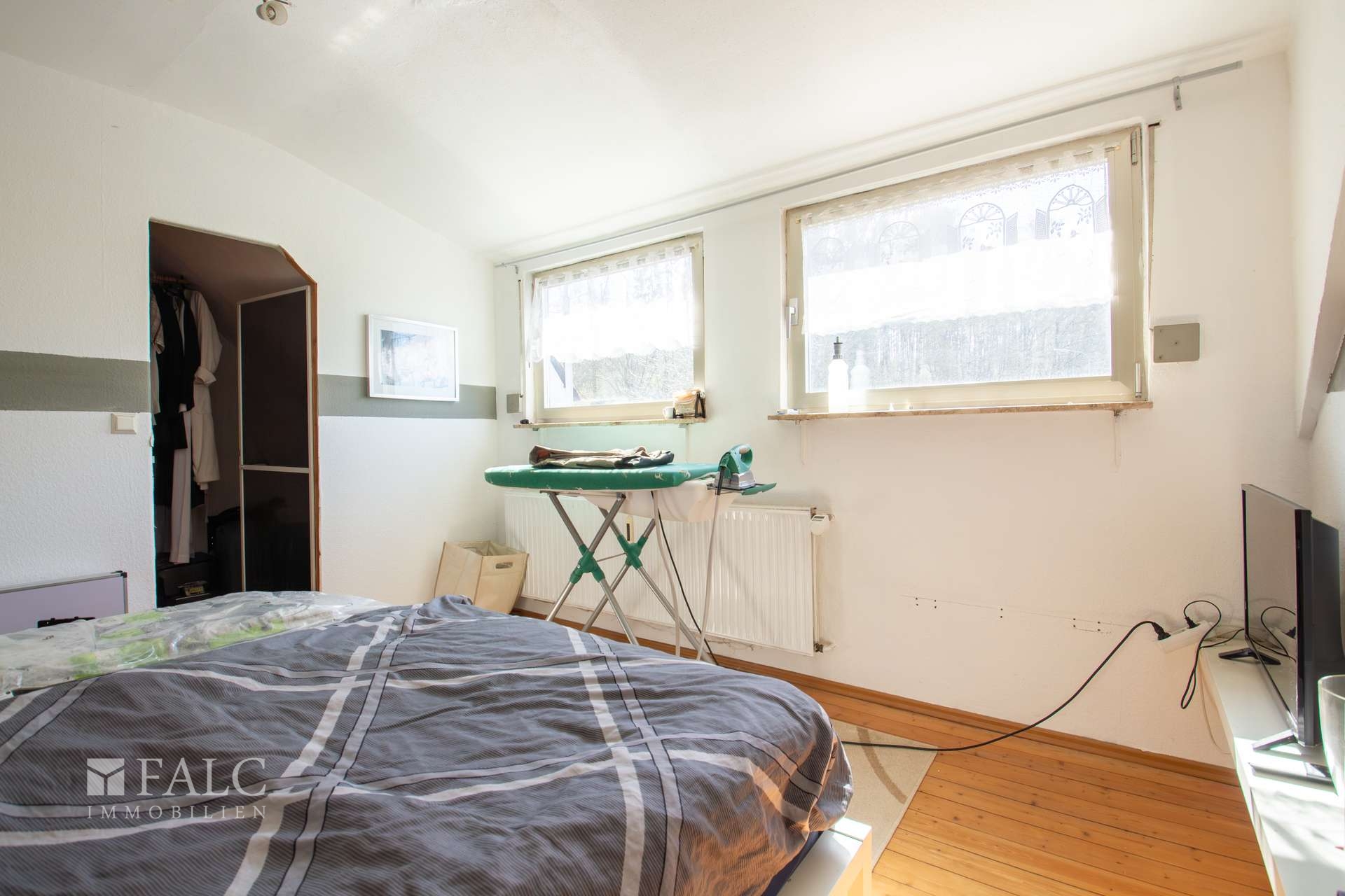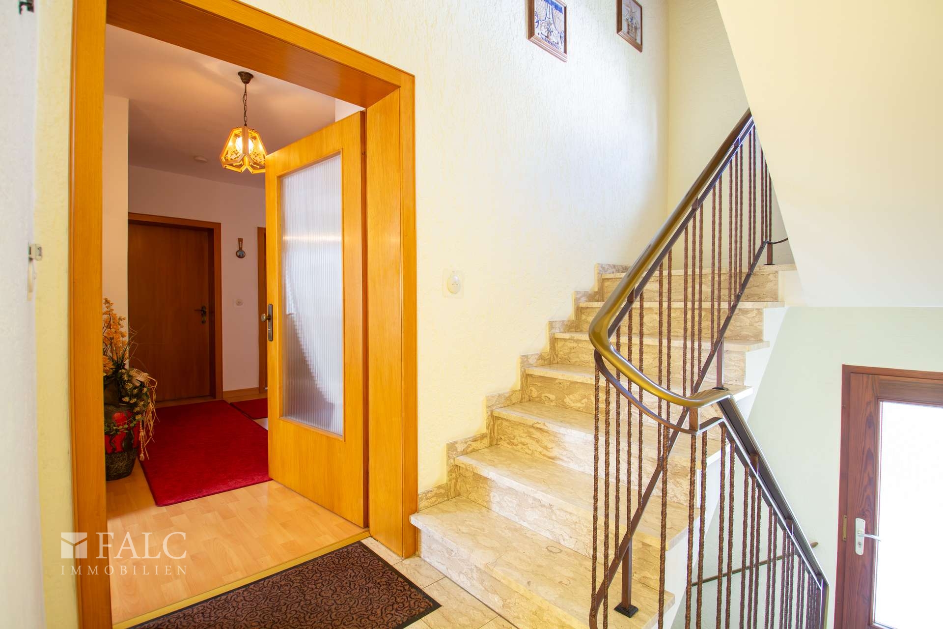 Im folgenden Text wird die Ausstattung des Zweifamilienhauses näher beschrieben. In den Wohnräumen des Wohnhauses sind die Böden im Erdgeschoss mit Teppich und Laminat ausgestattet. In der Küche liegt ein Linoleumboden. Das Dachgeschoss ist mit Teppich und Linoleum ausgestattet. Die Böden im Kellergeschoss sind gefliest. Die zweifachverglasten Holzfenster sind aus dem Baujahr. Einige Fenster wurden im Jahre 2021 durch zweifachverglaste Kunststofffenster erneuert. Alle Fenster sind mit Rollläden ausgestattet. Als Innentüren wurden braune Holztüren und Holztüren mit Glasausschnitt verwendet. Die Verbindungen vom Erd- ins Dachgeschoss und vom Erd- ins Kellergeschoss erfolgen über massive Treppen. Das Haus wird über eine Ölzentralheizung aus dem Jahre 1990 beheizt. In allen Wohnräumen sind Heizkörper vorhanden. Die Warmwassererzeugung erfolgt ebenfalls über die Ölzentralheizung. In der Dachgeschosswohnung wird in der Küche das Wasser über einen Boiler erwärmt. Das Badezimmer im Erdgeschoss ist aus den 90’er Jahren. Es ist mit hellen Wandfliesen raumhoch gefliest. Es verfügt über eine Badewanne und eine Dusche. Das Badezimmer im Dachgeschoss ist raumhoch mit hellen Fliesen gefliest. Es verfügt über eine Badewanne. Das Dach des Wohnhauses ist mit Kunstschieferplatten eingedeckt. Die Dachgeschosswohnung ist derzeit für eine Kaltmiete in Höhe von 370,- Euro vermietet.
