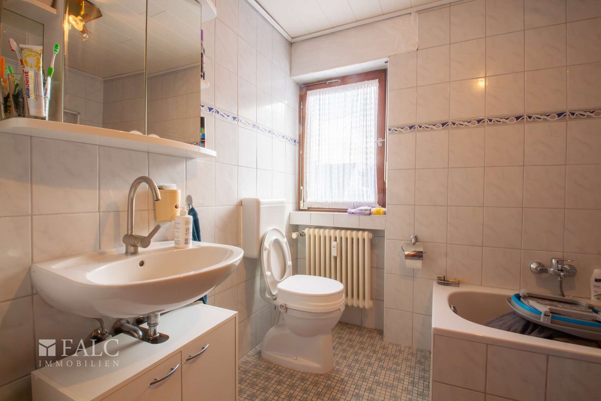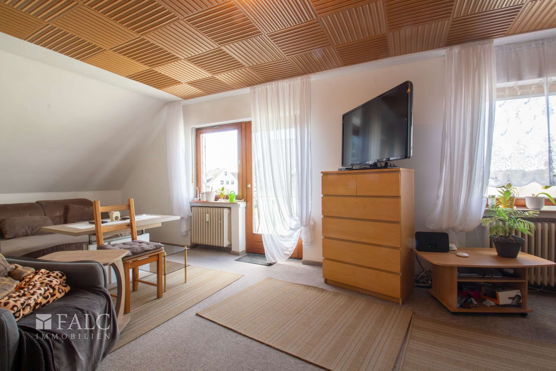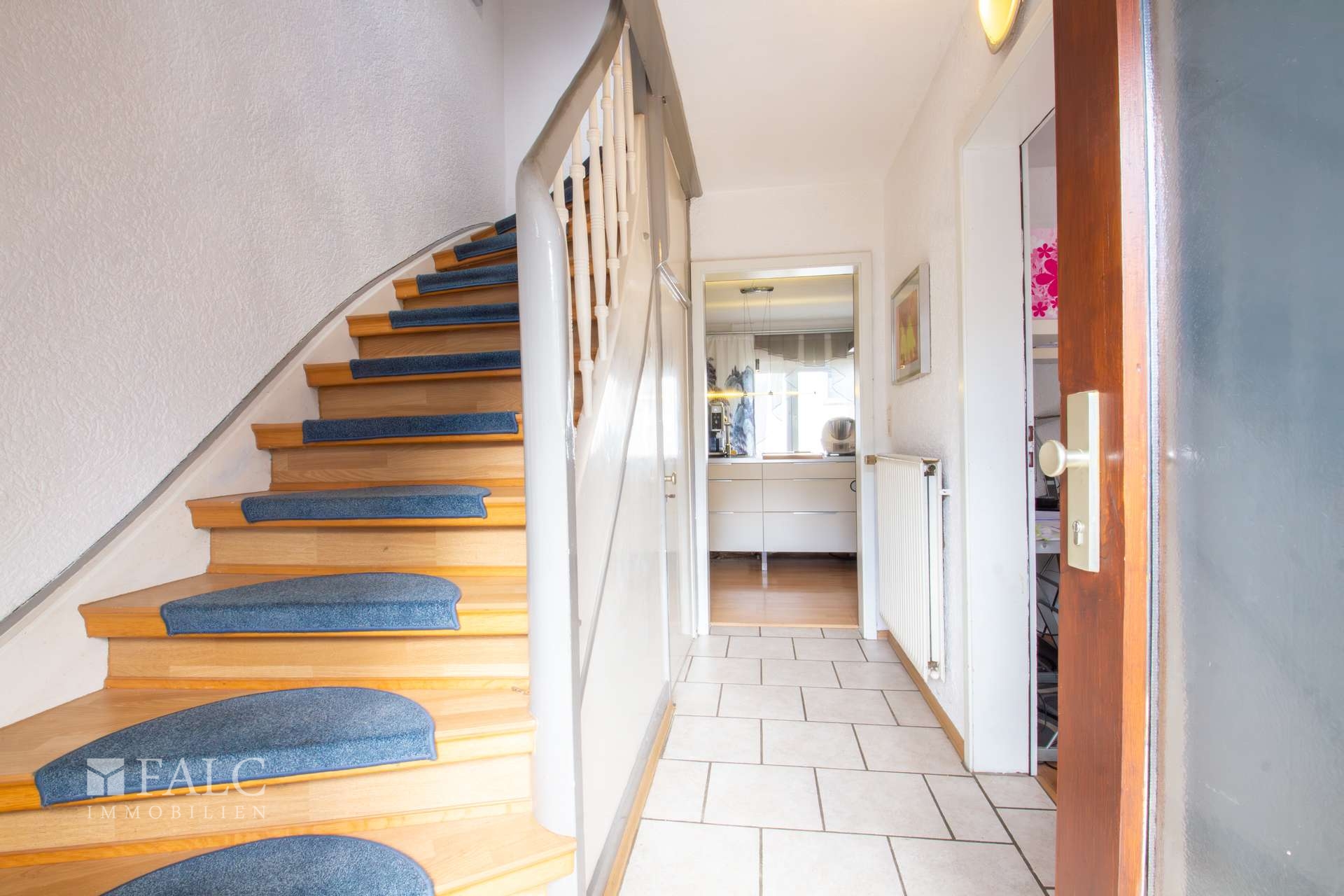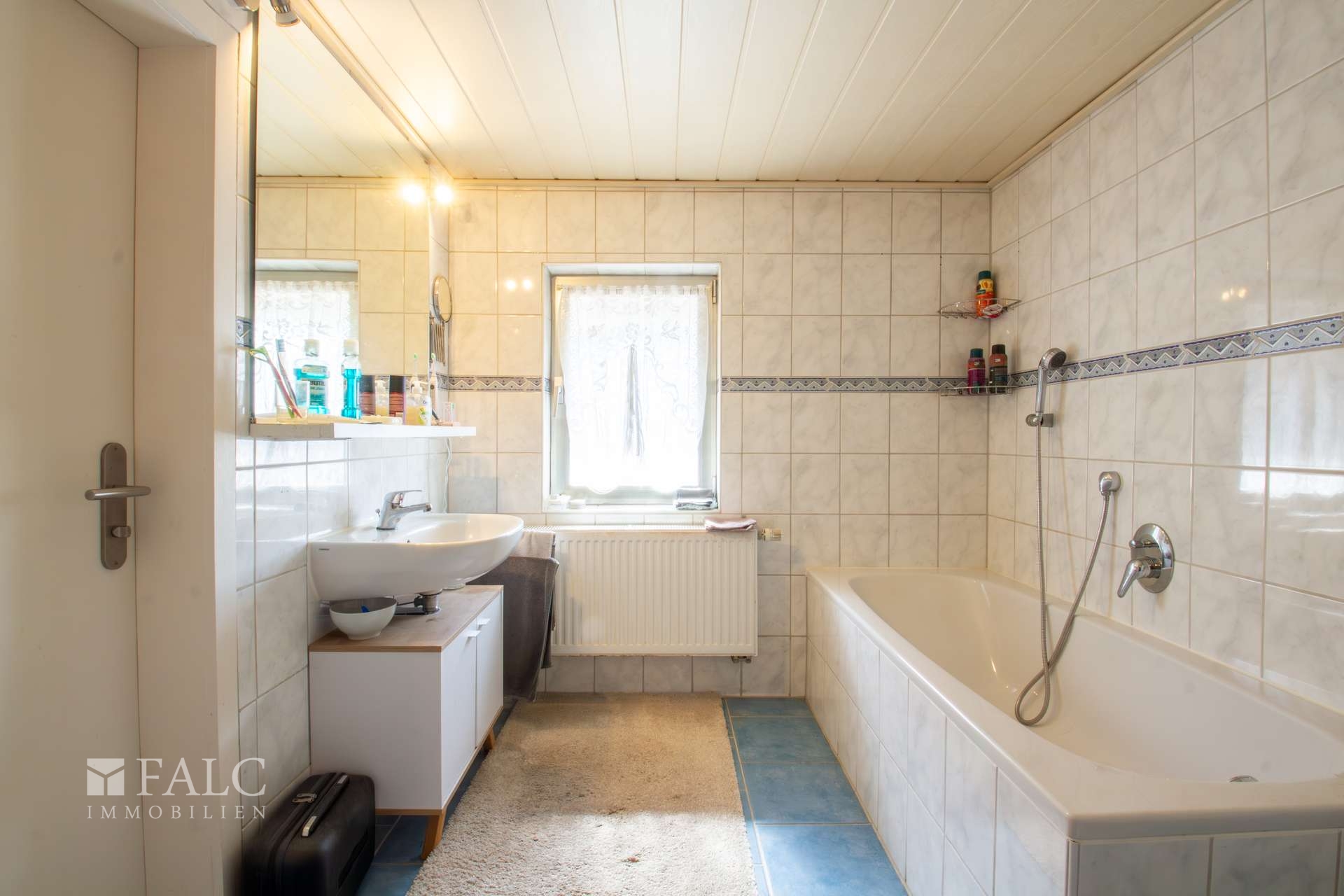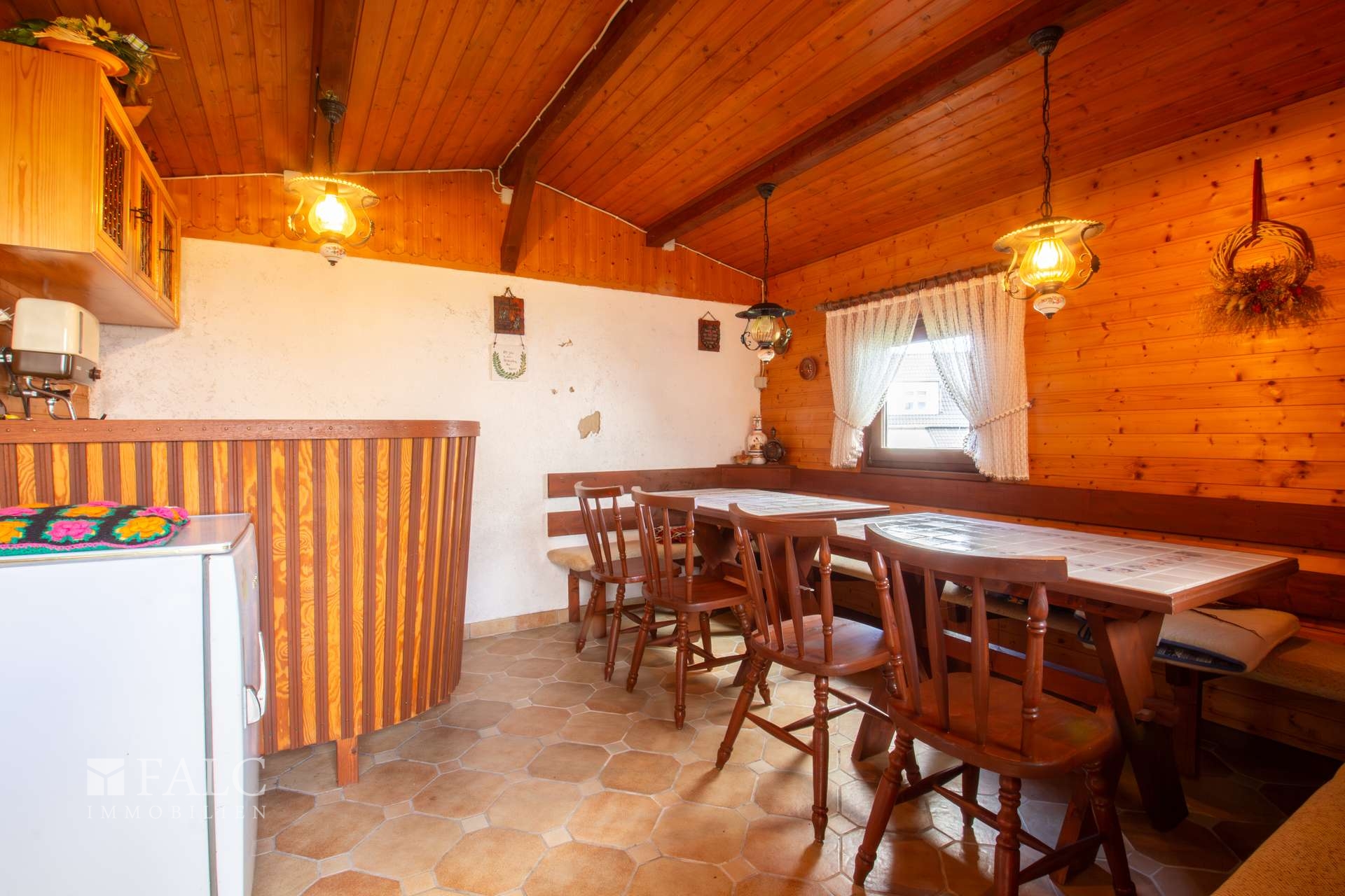 Im folgenden Text wird die Ausstattung des Zweifamilienhauses näher beschrieben. In den Wohnräumen des Wohnhauses sind die Böden im Erdgeschoss mit Teppich und Laminat ausgestattet. In der Küche liegt ein Linoleumboden. Das Dachgeschoss ist mit Teppich und Linoleum ausgestattet. Die Böden im Kellergeschoss sind gefliest. Die zweifachverglasten Holzfenster sind aus dem Baujahr. Einige Fenster wurden im Jahre 2021 durch zweifachverglaste Kunststofffenster erneuert. Alle Fenster sind mit Rollläden ausgestattet. Als Innentüren wurden braune Holztüren und Holztüren mit Glasausschnitt verwendet. Die Verbindungen vom Erd- ins Dachgeschoss und vom Erd- ins Kellergeschoss erfolgen über massive Treppen. Das Haus wird über eine Ölzentralheizung aus dem Jahre 1990 beheizt. In allen Wohnräumen sind Heizkörper vorhanden. Die Warmwassererzeugung erfolgt ebenfalls über die Ölzentralheizung. In der Dachgeschosswohnung wird in der Küche das Wasser über einen Boiler erwärmt. Das Badezimmer im Erdgeschoss ist aus den 90’er Jahren. Es ist mit hellen Wandfliesen raumhoch gefliest. Es verfügt über eine Badewanne und eine Dusche. Das Badezimmer im Dachgeschoss ist raumhoch mit hellen Fliesen gefliest. Es verfügt über eine Badewanne. Das Dach des Wohnhauses ist mit Kunstschieferplatten eingedeckt. Die Dachgeschosswohnung ist derzeit für eine Kaltmiete in Höhe von 370,- Euro vermietet.