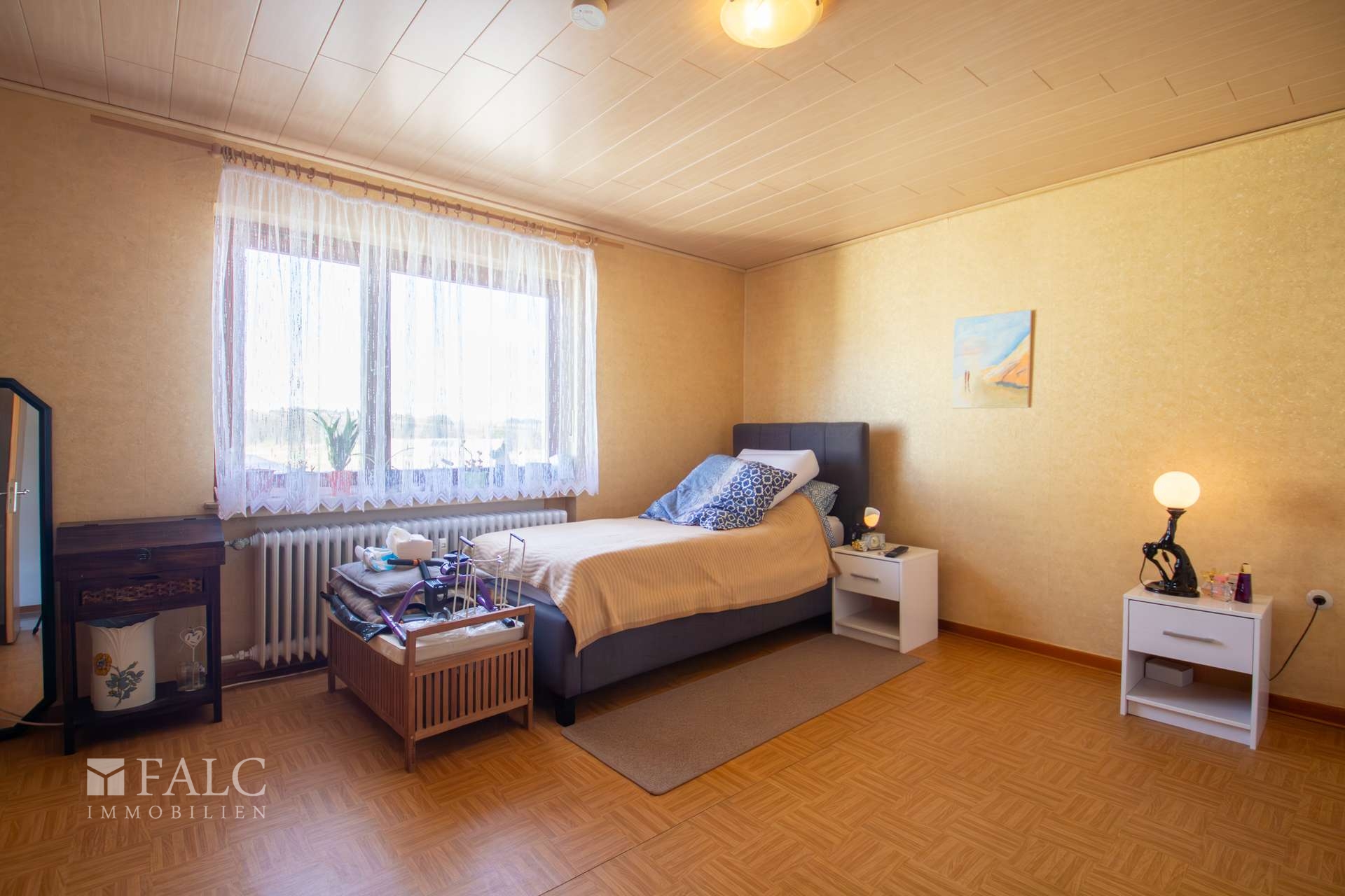 Im folgenden Text wird die Ausstattung des Einfamilienhauses näher beschrieben. In den Wohnräumen des Wohnhauses sind die Böden im Erd- und Dachgeschoss mit Laminat und Holzdielen ausgestattet. Die zweifachverglasten Kunststofffenster sind aus dem Jahre 2008. Alle Fenster sind mit Rollläden ausgestattet. Als Innentüren wurden weiße Holztüren verwendet. Die Verbindung vom Erd- ins Dachgeschoss erfolgt über Holztreppen. Eine massive Treppe verbindet Erd- mit Kellergeschoss. Das Haus wird über eine Ölzentralheizung aus dem Jahre 2001 beheizt. In allen Wohnräumen sind Heizkörper vorhanden. Die Warmwassererzeugung erfolgt ebenfalls über die Ölzentralheizung. Das Badezimmer ist aus den 90’er Jahren und ist raumhoch mit hellen Fliesen gefliest. Es verfügt über eine Badewanne und eine Dusche. Das Dach des Wohnhauses ist mit Kunstschieferplatten eingedeckt. Das Einfamilienhaus ist derzeit für eine Kaltmiete in Höhe von 390,- Euro vermietet. Eine Garagenhälfte ist zusätzlich für 20,- Euro vermietet.