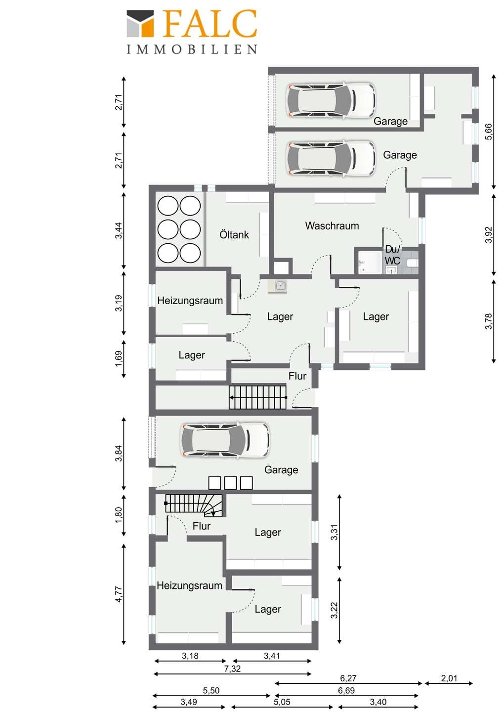 Eine große Doppelgarage befindet sich direkt neben dem Wohnhaus und bietet einen direkten Zugang in den Keller. Der Keller des Wohnhauses ist ebenfalls über das gemeinsame Treppenhaus erreichbar. Dieser verfügt über eine großzügige Nutzfläche. Hier befinden sich ein Waschraum mit Toilette, drei Lagerräume, ein Heizungsraum sowie ein Öltankraum.