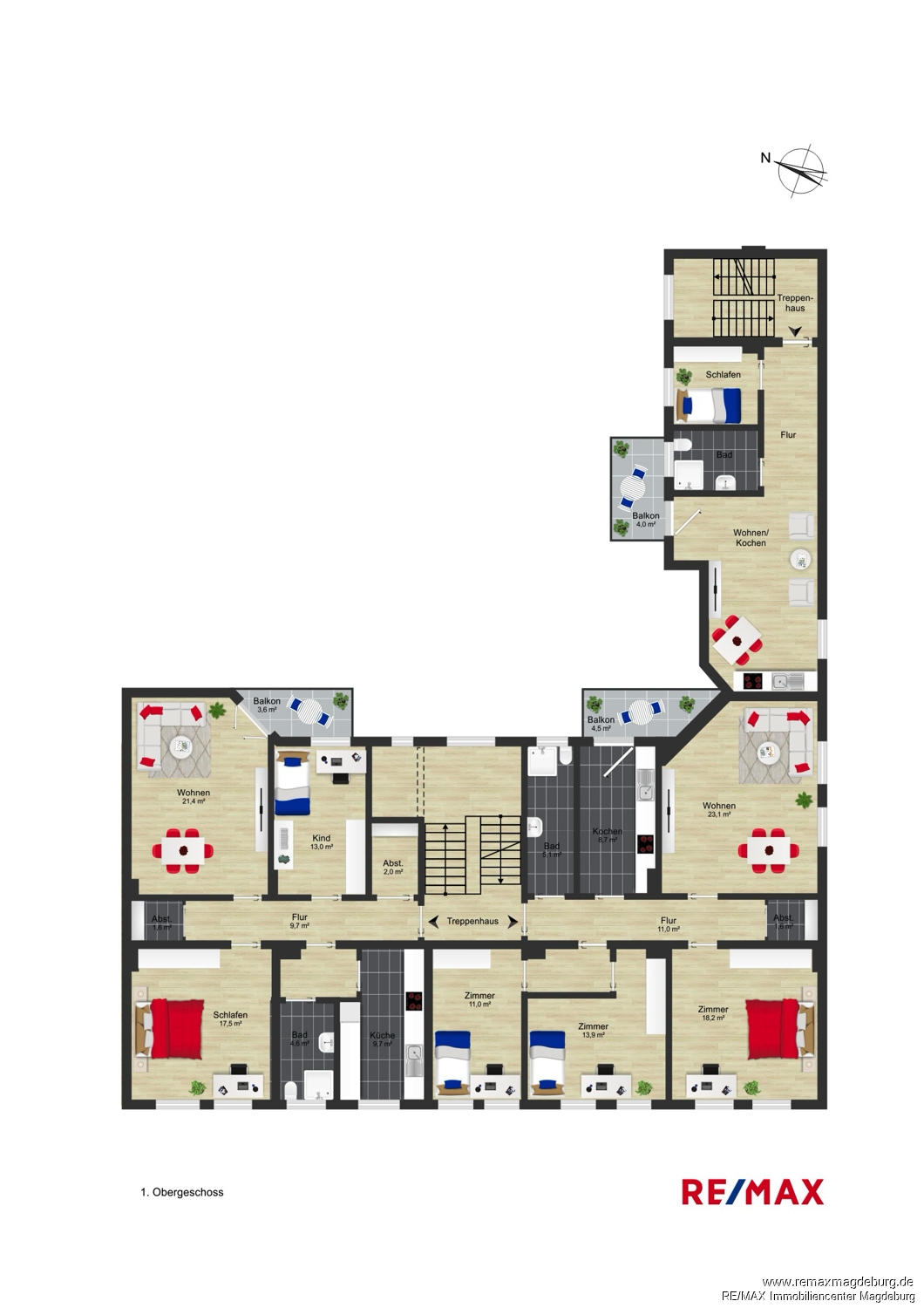 Haupthaus: - fünf 3-Raum-Wohnungen mit ca. 74-85 m² Wohnfläche und Balkon - drei 4-Raum-Wohnungen mit ca. 93-97 m² Wohnfläche und Balkon