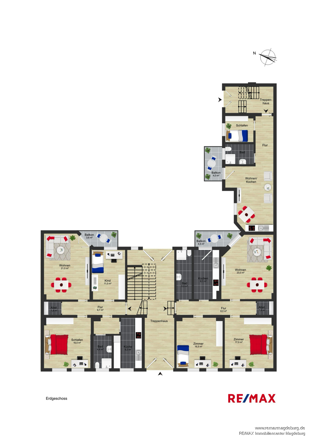 Haupthaus: - fünf 3-Raum-Wohnungen mit ca. 74-85 m² Wohnfläche und Balkon - drei 4-Raum-Wohnungen mit ca. 93-97 m² Wohnfläche und Balkon