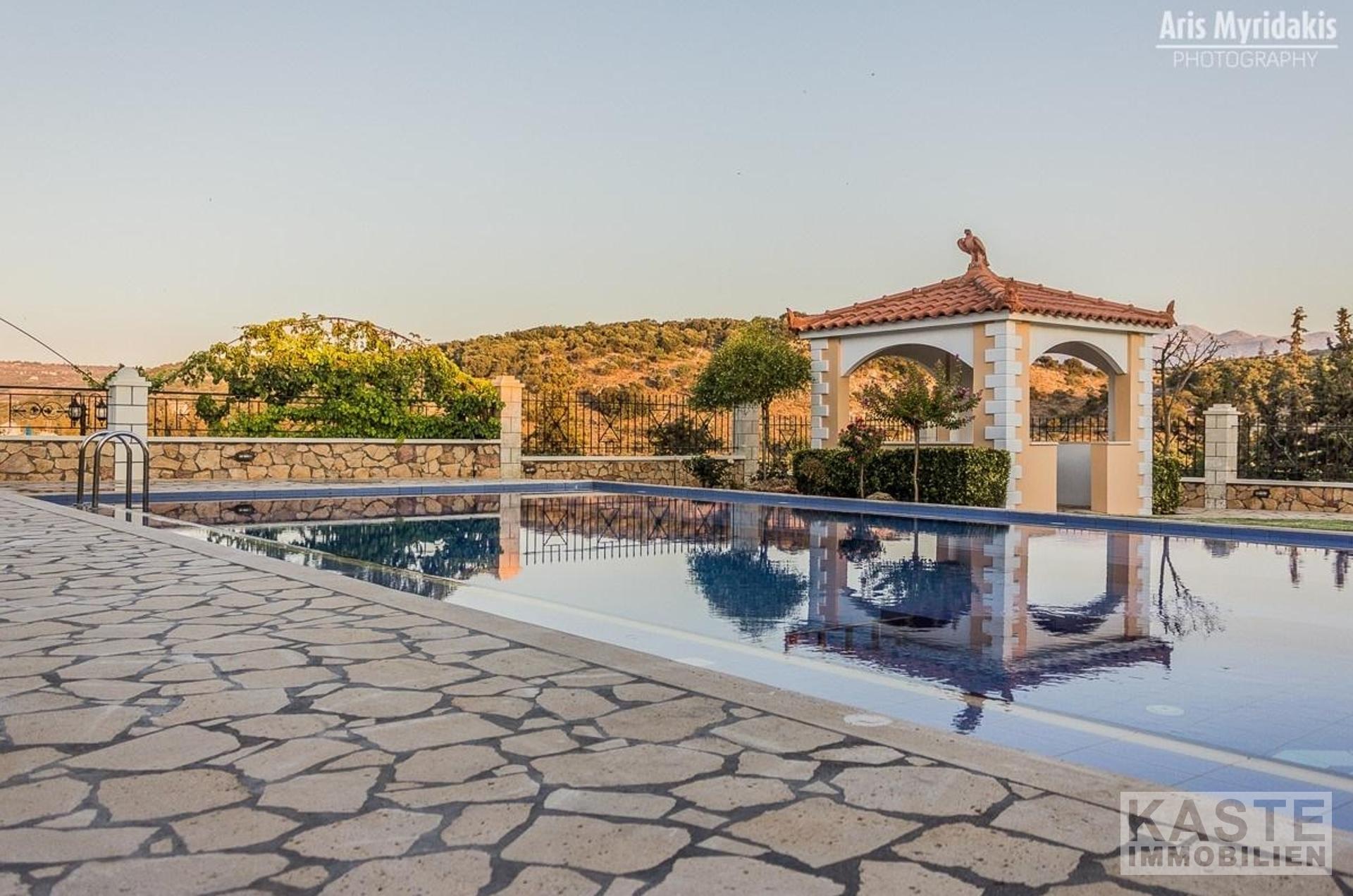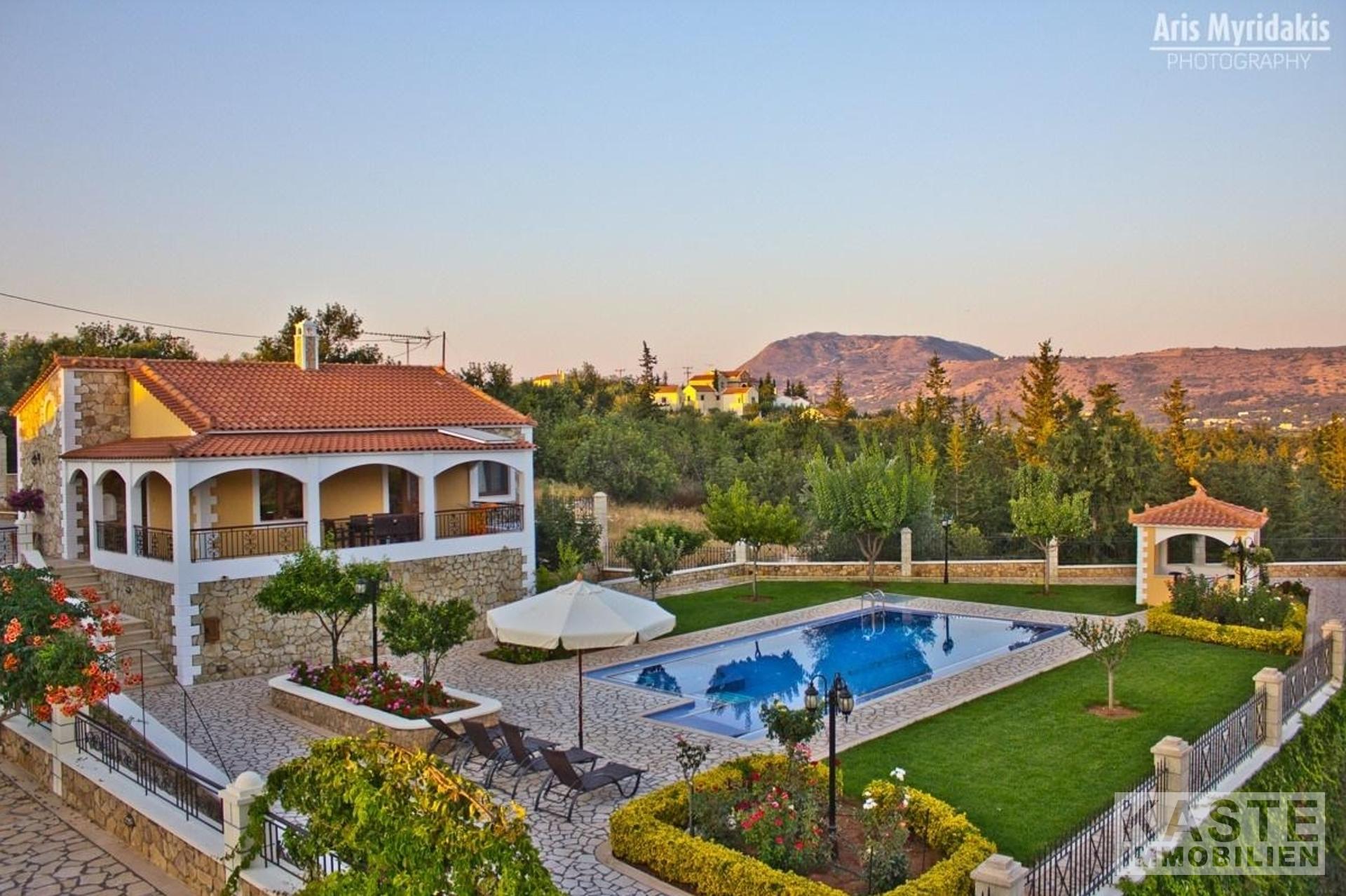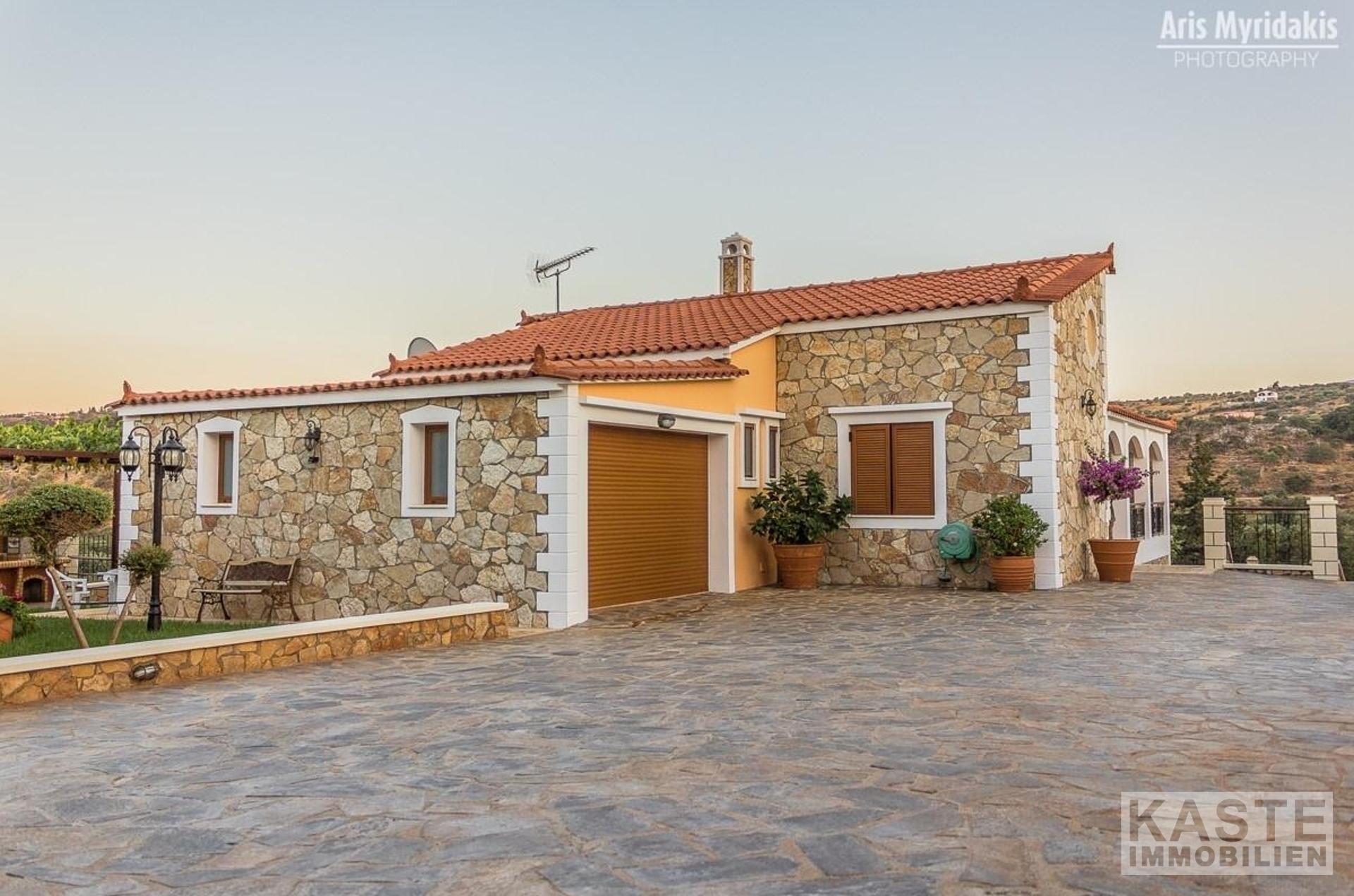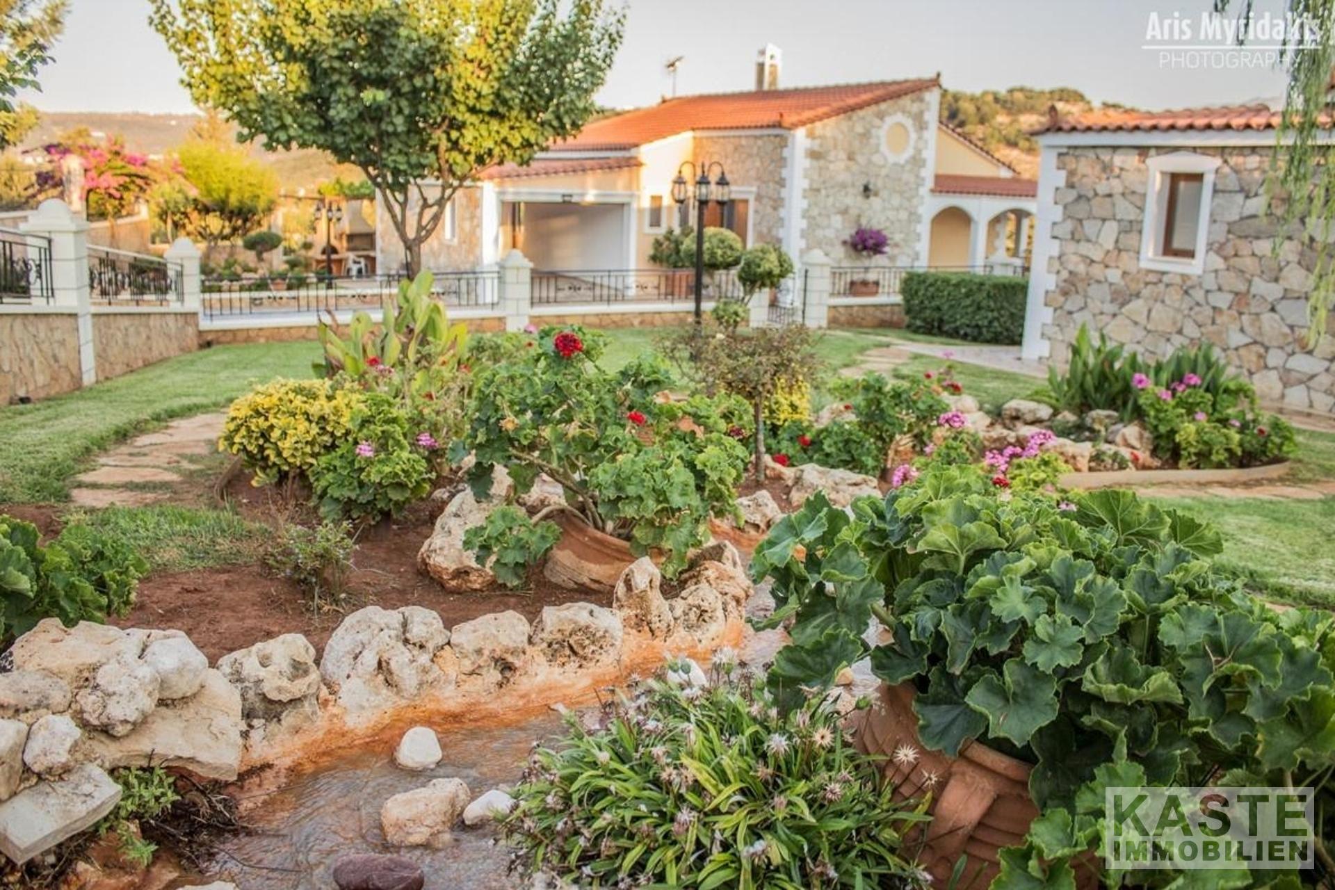 Das kleine Dorf Douliana ist nur einen kurzen Spaziergang entfernt und die Sandstrände und Annehmlichkeiten von Almyrida und Kalives sind nur fünf Minuten Autofahrt. Die umliegenden Grundstücke sind umfangreich gestaltet, makellos mit Gehwegen und reifer Bepflanzung.