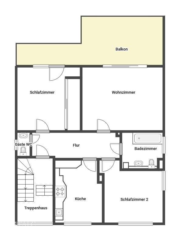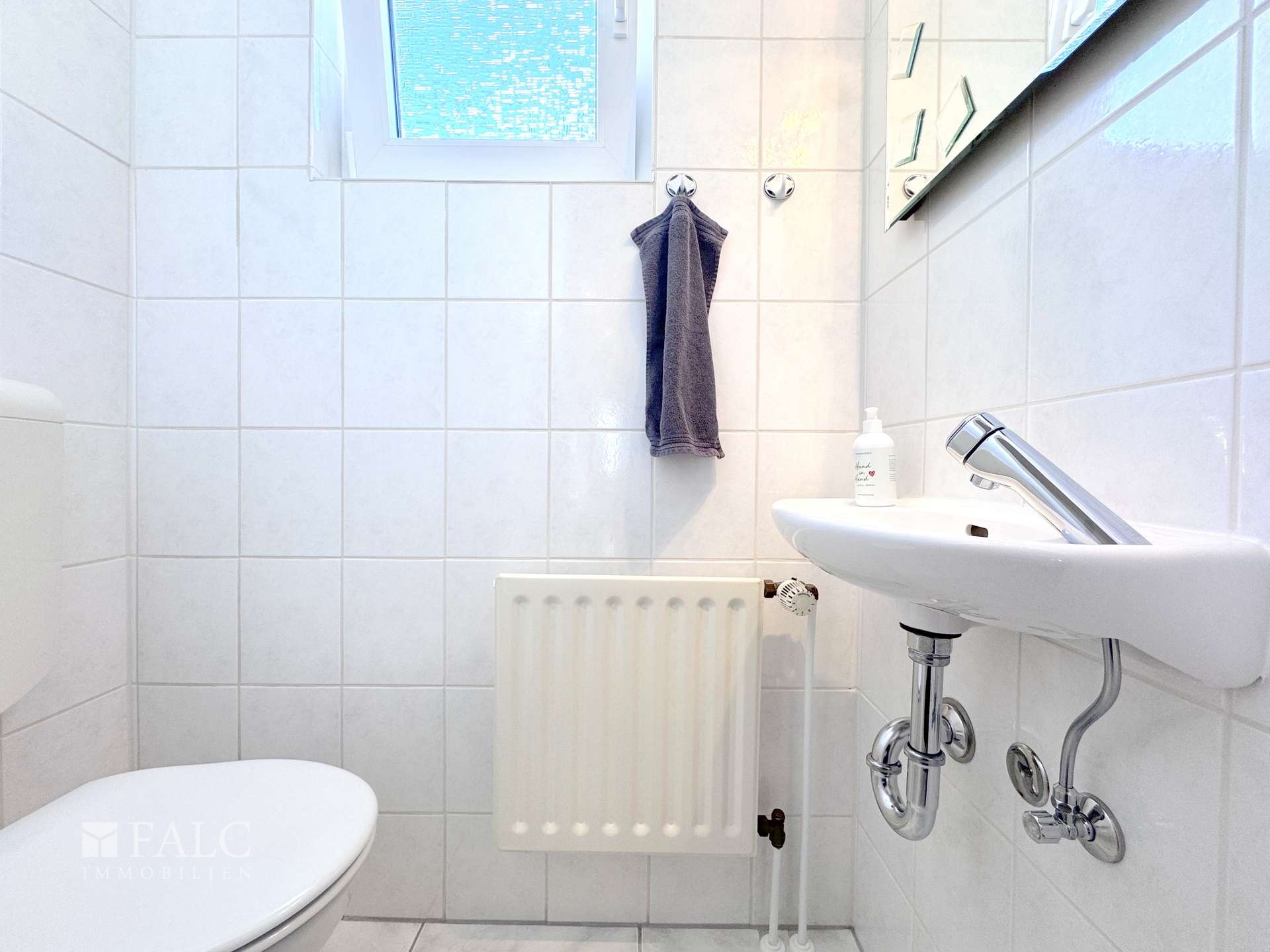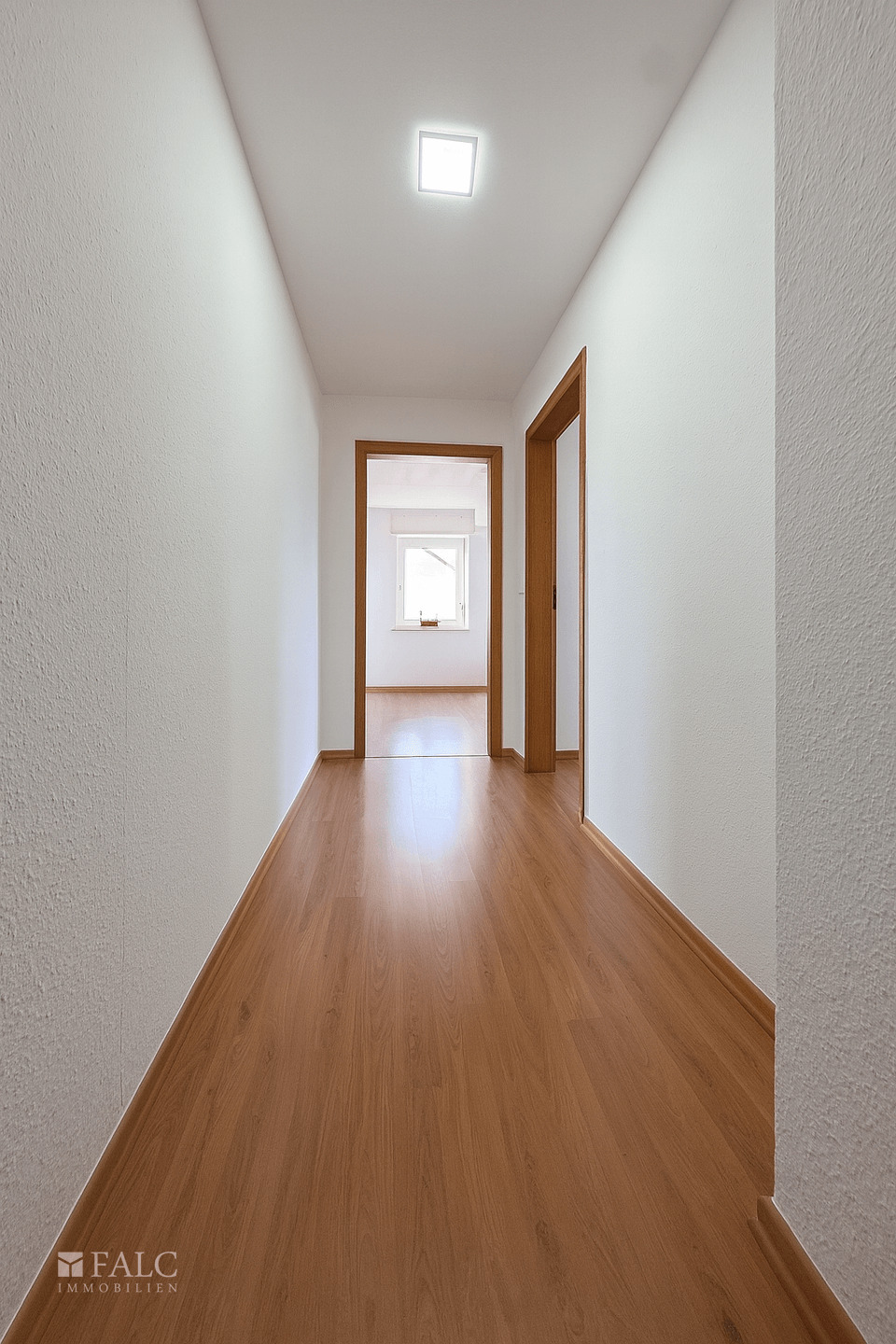 Im Obergeschoss befindet sich eine weitere Dreizimmerwohnung, die sich ebenfalls durch eine praktische Aufteilung auszeichnet. Neben einer Küche, einem Badezimmer und einem separaten Gäste-WC bieten hier das Wohnzimmer und Schlafzimmer den Zugang auf den Balkon, der einen schönen Blick in den Garten eröffnet. Auch in dieser Etage sind die restlichen Räume bequem über den Flur zugänglich.