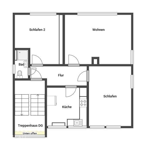 Das Dachgeschoss, das 1978 ausgebaut wurde, verfügt über rund 57 m² Wohnfläche. Hier stehen drei Zimmer, eine Küche sowie ein Badezimmer zur Verfügung. Alle Räume sind vom Flur aus begehbar, wodurch auch diese Wohnung eine angenehme Wohnstruktur erhält. Der besondere Charme dieser Einheit entsteht durch die gemütlichen Dachschrägen, die den Räumen eine behagliche Atmosphäre verleihen.