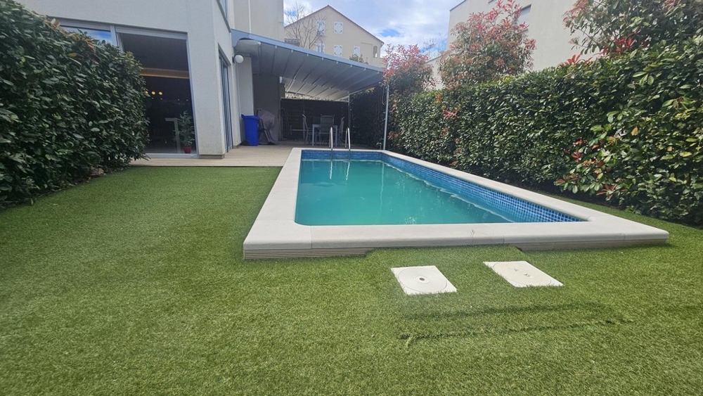 Ein besonderes Highlight ist die Dachterrasse mit etwas Meerblick, die als überdachte Sommerküche und Sonnenterrasse gestaltet ist. Die Wohnung im Erdgeschoss ist von einem gepflegten Garten mit eigenem Pool umgeben. Zudem steht ein Bereich für geselliges Beisammensein und erholsame Stunden im Freien zur Verfügung.