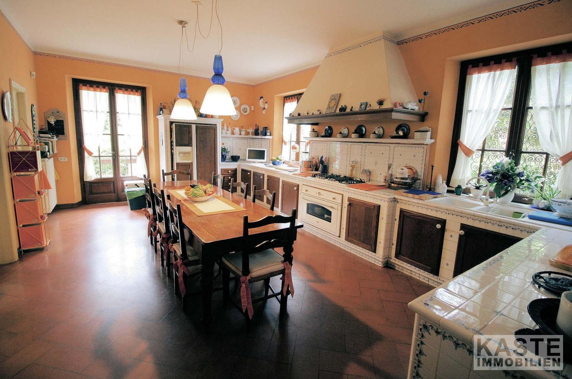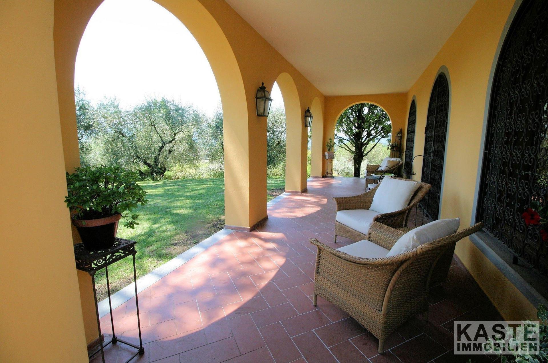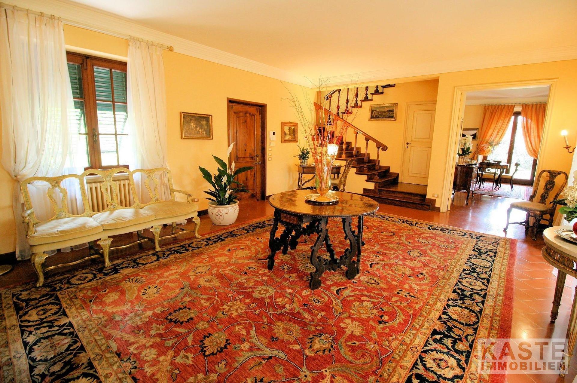 Die Villa steht in der Mitte des Grundstücks und ist komplett eingezäunt. Das Grundstück ist etwa 5000 qm groß. Die Villa ist von einem Park umgeben, der ca. 54.000 qm umfasst. Der sehr gepflegte Garten mit Blumen und Pflanzen sorgt für ein besonderes Flair. Außerdem gibt es einige Dutzend Olivenbäume, die genug Oliven für den Bedarf der Familie produzieren. In einem privaten Bereich in der Nähe der Villa gibt es einen schönen Swimmingpool von 11×5 m mit einer breiten Sonnenterrasse. Sie erreichen die Villa über eine von Bäumen umgebene Straße mit Zypressen und Hecken, die die Villa aufwerten. Die Villa ist 518 qm groß und besitzt 2 Etagen + 1 Keller. Das Erdgeschoss hat einen großzügigen Eingangsbereich, eine große Küche im Lucca-Stil mit Hauswirtschaftsraum, ein Esszimmer mit Zugang zur Terrasse, auf der Sie schöne Mahlzeiten im Freien mit Verwandten und Freunden genießen können, ein Wohnzimmer mit Kamin und Zugang zur Veranda. Eine Holztreppe führt in den ersten Stock, wo sich ein Badezimmer und die Schlafzimmer befinden. Außerdem befindet sich dort ein Hauptschlafzimmer mit begehbarem Kleiderschrank und Bad mit Jacuzzi und direktem Zugang zur Terrasse mit herrlichem Panoramablick, ein weiteres Schlafzimmer inklusive Bad, 2 weitere Schlafzimmer und ein weiteres Bad. Im Untergeschoss gibt es ein großes Wohnzimmer, einen Studioraum, eine Waschküche, einen Hauswirtschaftsraum und ein Badezimmer. Die Villa ist in perfektem Zustand und hat eine sehr gute Ausstattung.