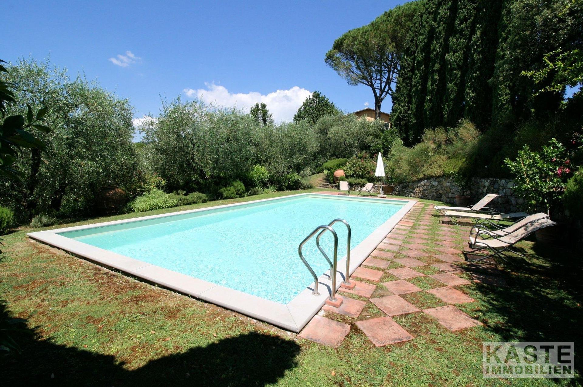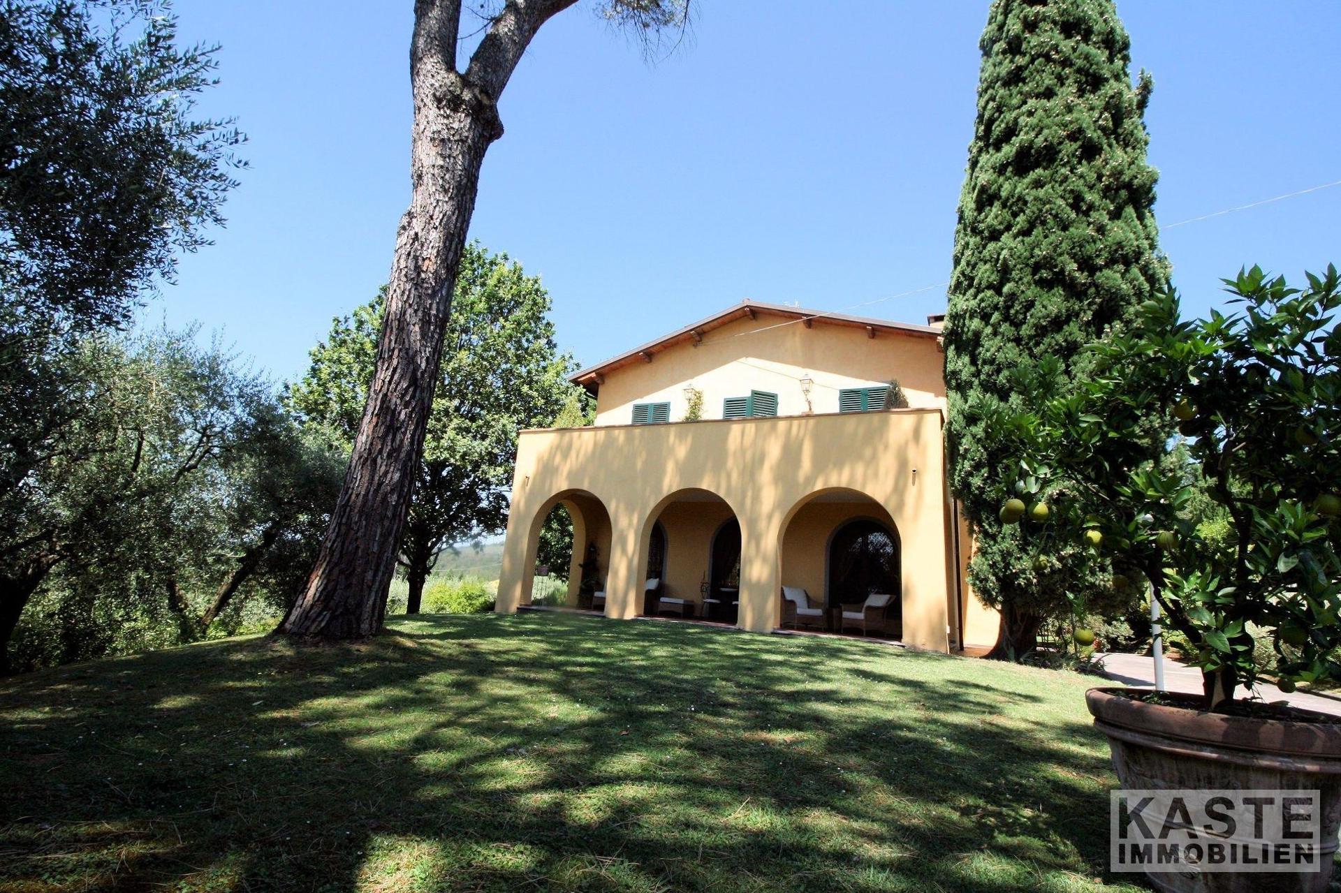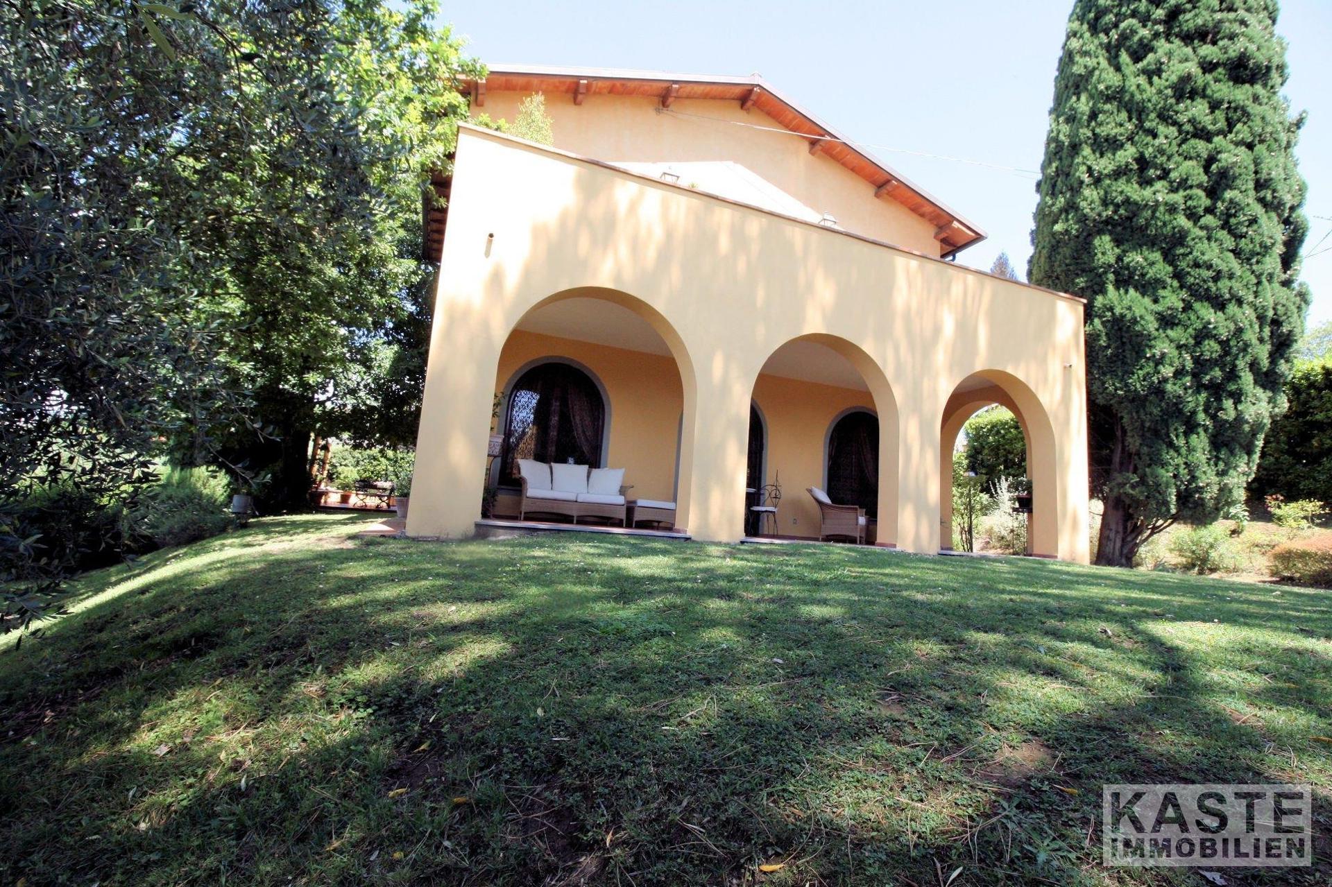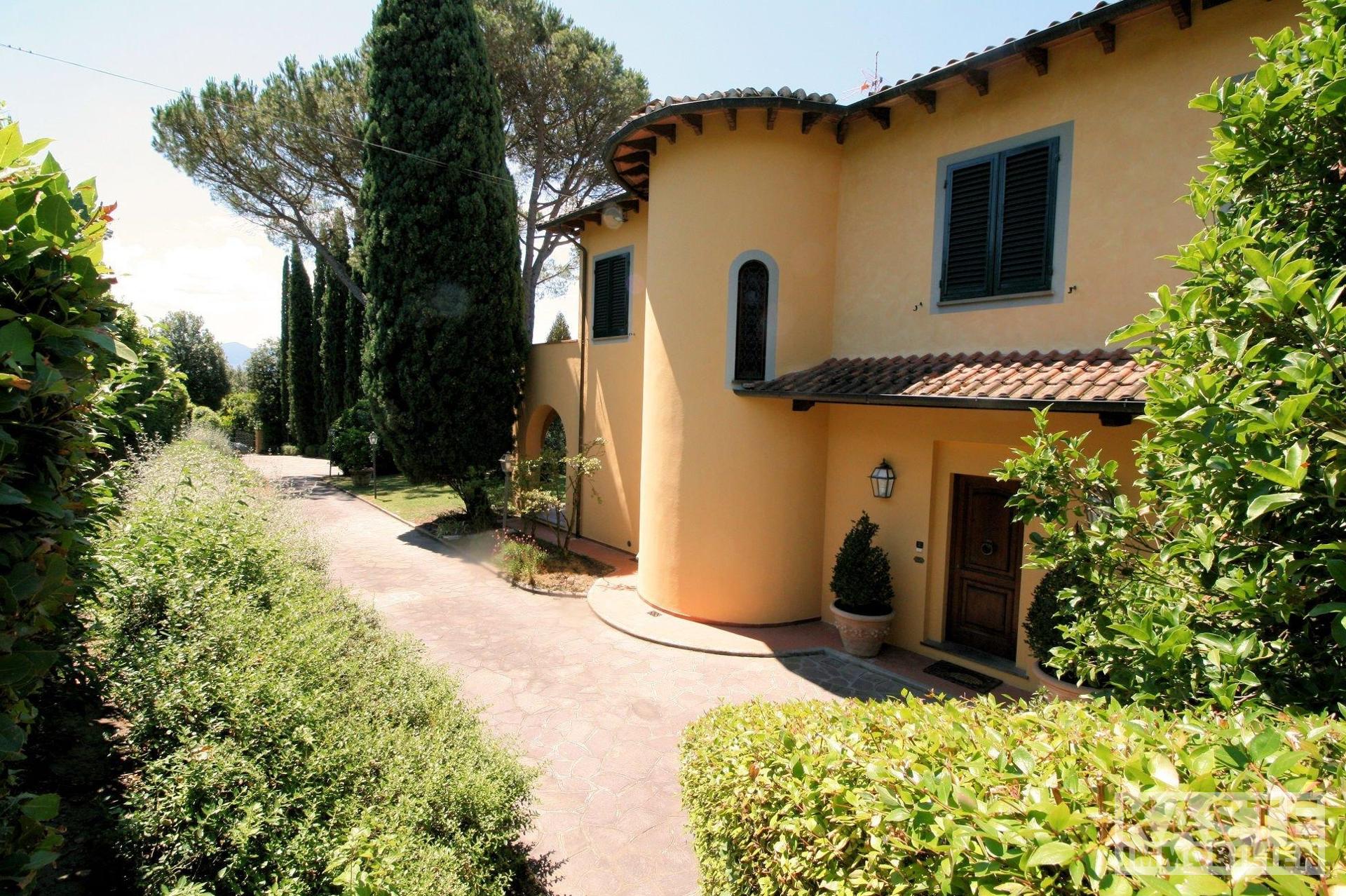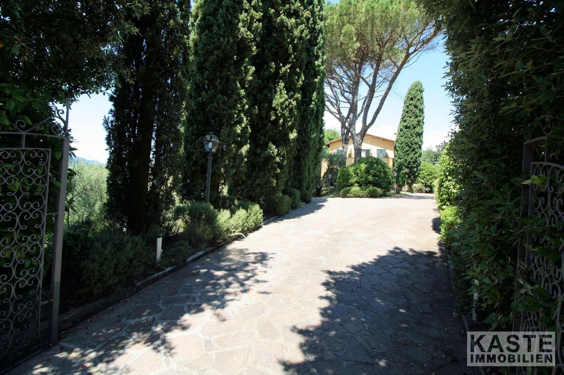 Die Villa steht in der Mitte des Grundstücks und ist komplett eingezäunt. Das Grundstück ist etwa 5000 qm groß. Die Villa ist von einem Park umgeben, der ca. 54.000 qm umfasst. Der sehr gepflegte Garten mit Blumen und Pflanzen sorgt für ein besonderes Flair. Außerdem gibt es einige Dutzend Olivenbäume, die genug Oliven für den Bedarf der Familie produzieren. In einem privaten Bereich in der Nähe der Villa gibt es einen schönen Swimmingpool von 11×5 m mit einer breiten Sonnenterrasse. Sie erreichen die Villa über eine von Bäumen umgebene Straße mit Zypressen und Hecken, die die Villa aufwerten. Die Villa ist 518 qm groß und besitzt 2 Etagen + 1 Keller. Das Erdgeschoss hat einen großzügigen Eingangsbereich, eine große Küche im Lucca-Stil mit Hauswirtschaftsraum, ein Esszimmer mit Zugang zur Terrasse, auf der Sie schöne Mahlzeiten im Freien mit Verwandten und Freunden genießen können, ein Wohnzimmer mit Kamin und Zugang zur Veranda. Eine Holztreppe führt in den ersten Stock, wo sich ein Badezimmer und die Schlafzimmer befinden. Außerdem befindet sich dort ein Hauptschlafzimmer mit begehbarem Kleiderschrank und Bad mit Jacuzzi und direktem Zugang zur Terrasse mit herrlichem Panoramablick, ein weiteres Schlafzimmer inklusive Bad, 2 weitere Schlafzimmer und ein weiteres Bad. Im Untergeschoss gibt es ein großes Wohnzimmer, einen Studioraum, eine Waschküche, einen Hauswirtschaftsraum und ein Badezimmer. Die Villa ist in perfektem Zustand und hat eine sehr gute Ausstattung.