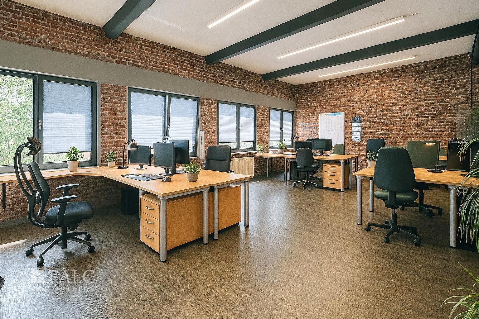 Das Büro präsentiert sich in einem einzigartigen industriellen Stil, der durch teilweise verklinkerte Wände und einen durchgehenden Vinylboden geprägt ist. Die Kombination dieser Elemente schafft nicht nur einen modernen Look, sondern verleiht dem gesamten Raum auch eine robuste Eleganz.