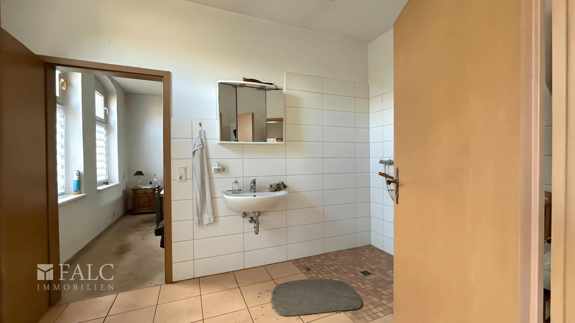 Im Erdgeschoss des Hauses befindet sich ein kleiner Flur, der in ein Wohnzimmer mit Kamin führt. Direkt anschließend liegt ein Zwischenzimmer, das flexibel nutzbar ist, etwa als Essbereich oder Arbeitszimmer. Zudem verfügt das Erdgeschoss über ein Schlafzimmer sowie ein Badezimmer mit ebenerdiger Dusche. Die Küche ist mit einer alten Küchenhexe ausgestattet.