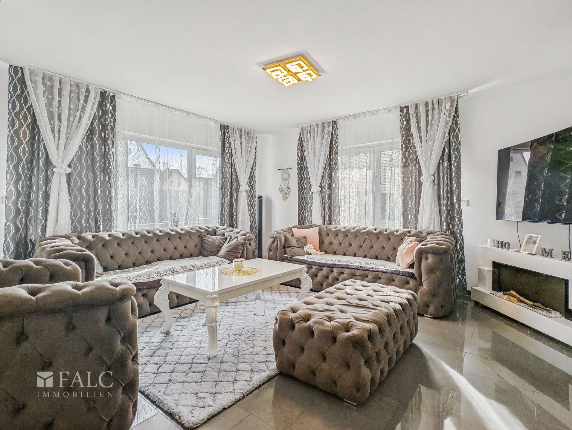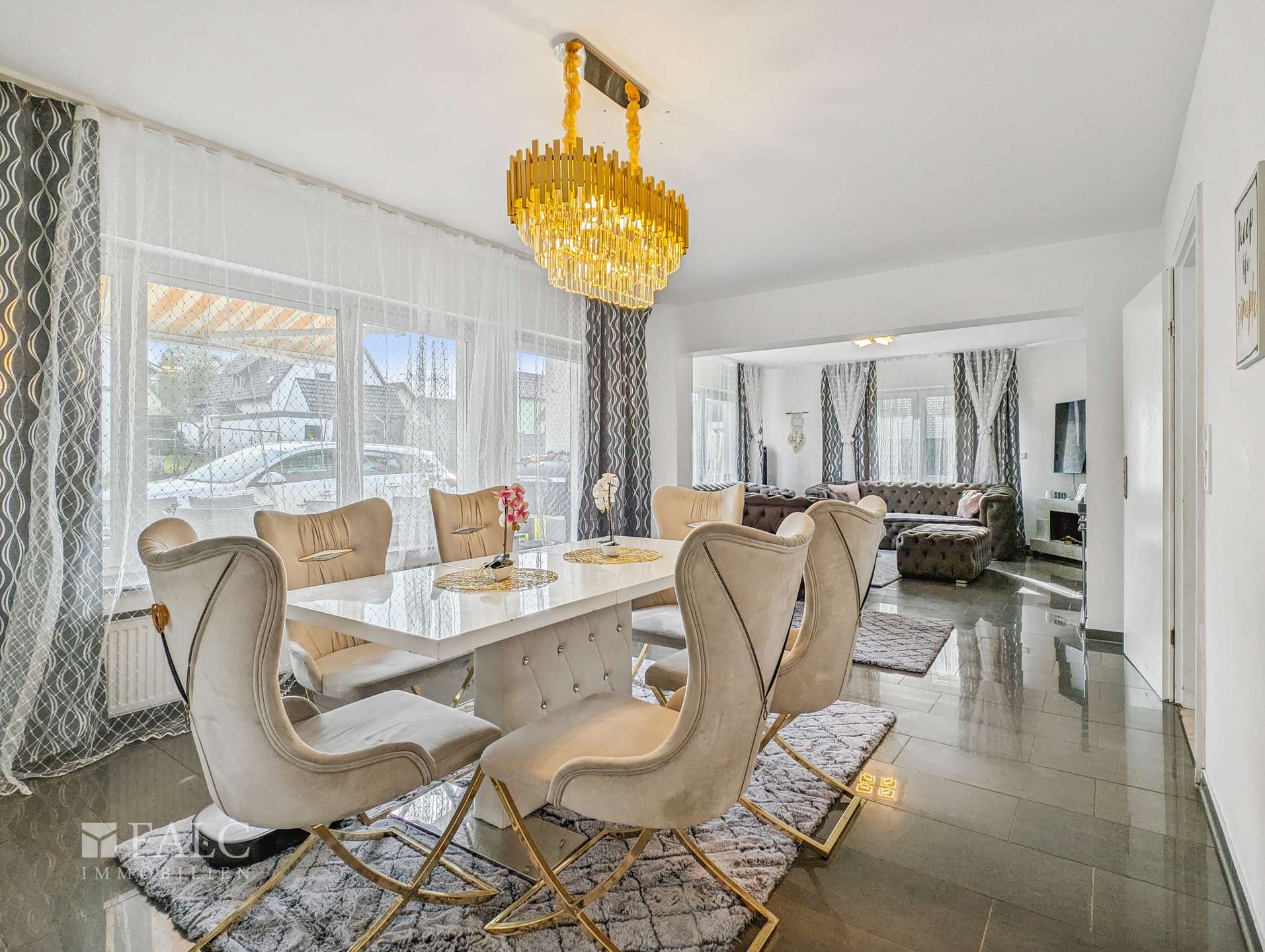 Beim Betreten des Hauses gelangen Sie in einen einladenden Eingangsbereich, der direkt in das geräumige Wohnzimmer führt. Hier können Sie gemütliche Abende mit der Familie verbringen oder Gäste empfangen. Die großen Fenster sorgen für viel Tageslicht und schaffen eine angenehme Atmosphäre. Der angrenzende Essbereich bietet ausreichend Platz für gemeinsame Mahlzeiten und gesellige Runden. Von hier aus haben Sie zudem Zugang zur Terrasse und dem Garten, der sich ideal für Kinder zum Spielen oder für entspannte Stunden im Freien eignet.