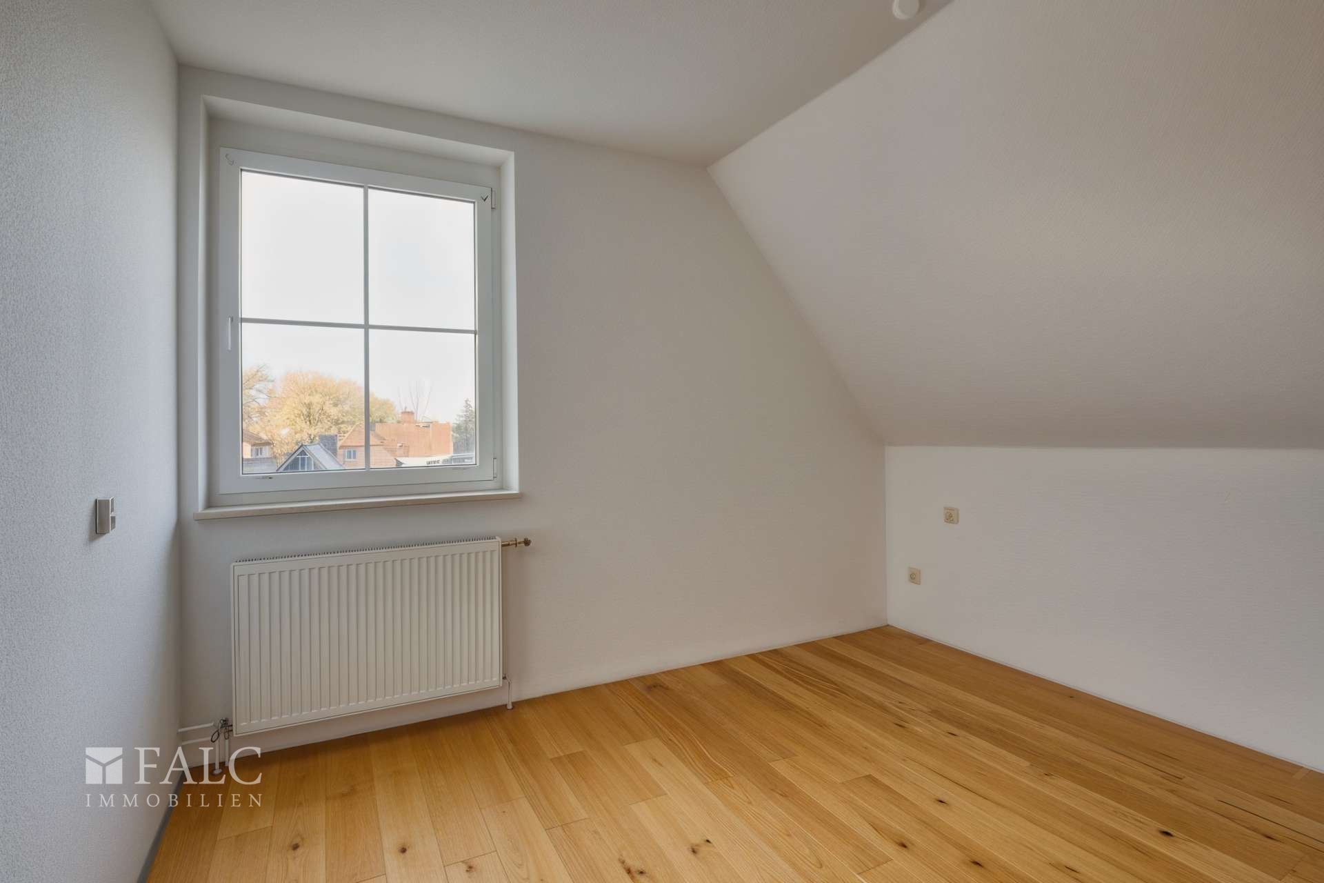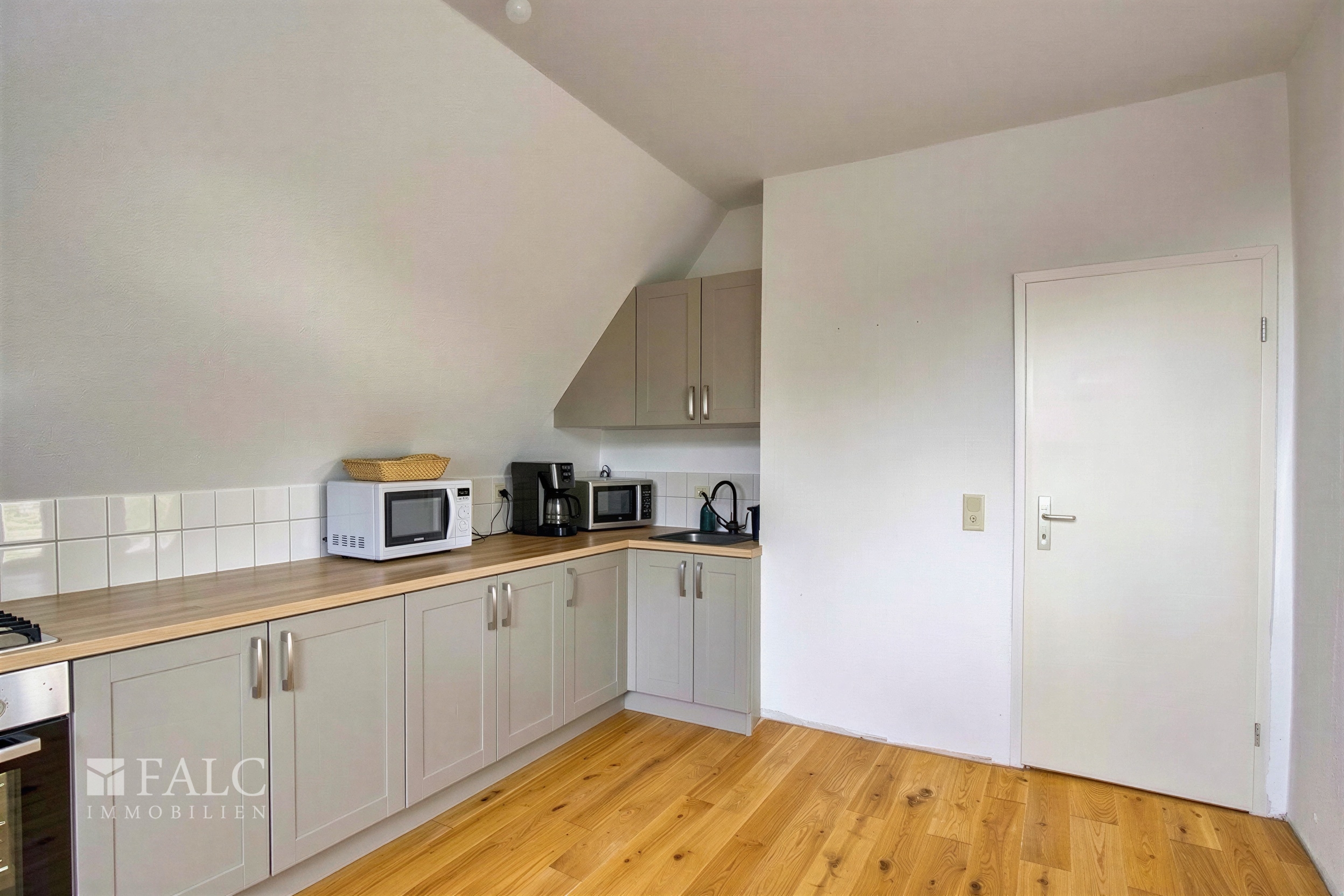 Die Wohnfläche beträgt etwa 50 m². Die vorhandenen Dachgauben verleihen der Wohnung einen gemütlichen Charakter. Das verlegte Parkett unterstützt diesen Eindruck. Das funktionale Wannenbad ist hell gefliest.