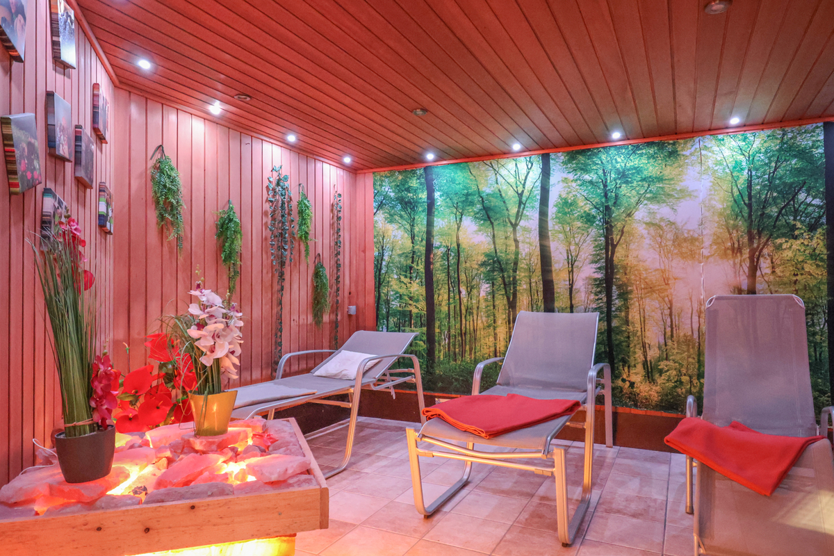 Zwischen den Saunagängen entspannen Ihre Gäste im gemütlichen Ruheraum im Wintergarten oder genießen die frische Luft auf der weitläufigen Sonnenliegewiese. Das Sauna-Restaurant lädt mit köstlichen Speisen und Getränken zum Verweilen ein.