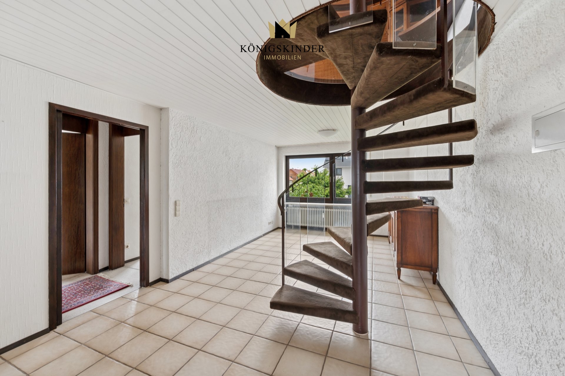 Über eine stilvolle Wendeltreppe gelangt man ins Dachgeschoss, dem wohnlichen Herzstück der Wohnung. Hier befindet sich das beeindruckende Kaminzimmer mit offenem Gebälk, einem voll funktionstüchtigen Kamin und Zugang zur sonnigen Dachterrasse, ein Ort zum Entspannen, Genießen und Wohlfühlen. Ebenfalls im Dachgeschoss gelegen ist ein separates Gäste-WC, das den Komfort dieser Etage ideal ergänzt.