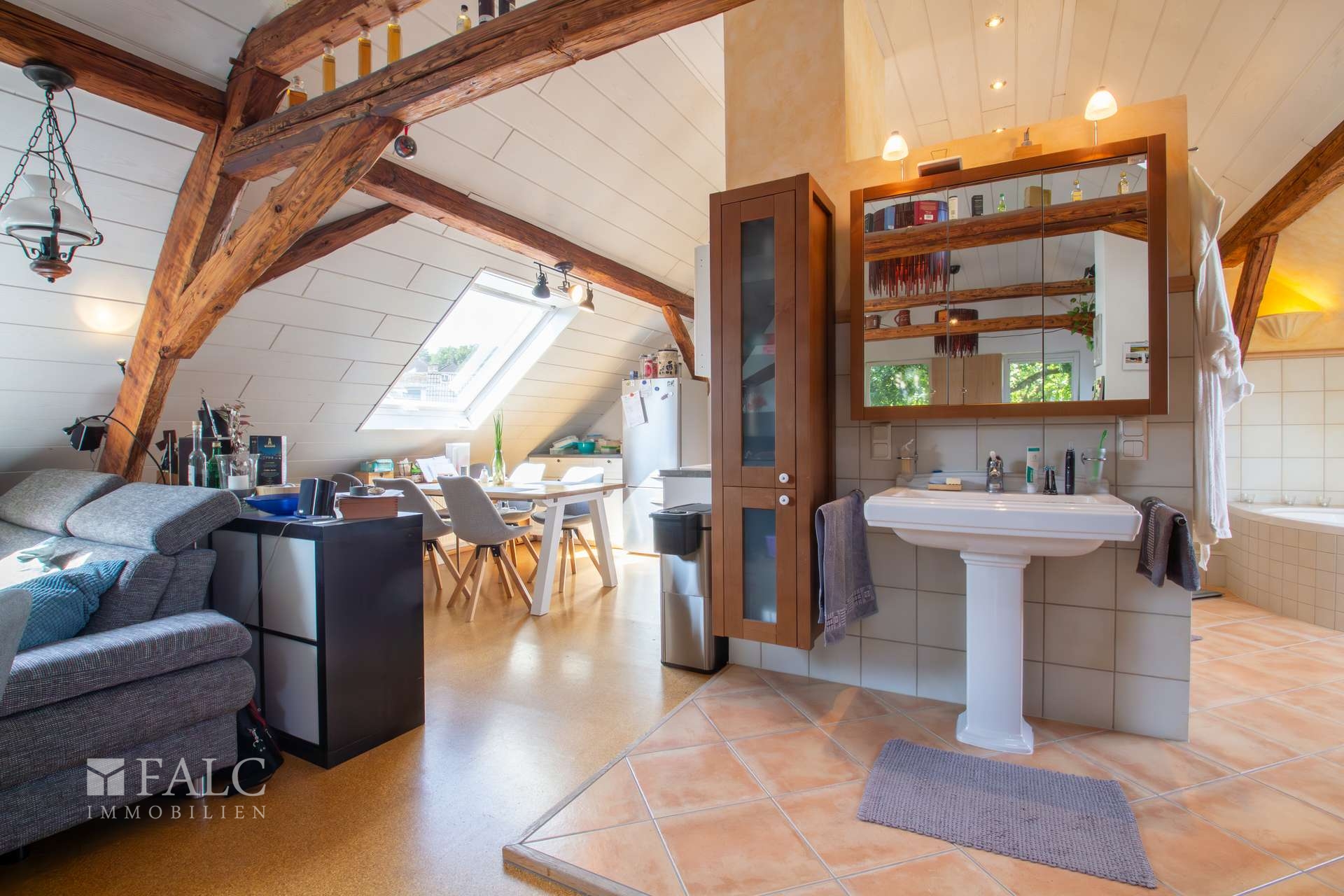 In den Wohnräumen des Fachwerkhauses sind die Böden im Erd- und Obergeschoss mit Eichenparkett, Laminat und Korkboden ausgestattet. Der Eingangsbereich des historischen Fachwerkhauses ist mit einem Terrazzoboden versehen. Das Studio im Dachgeschoss ist mit einem Korkboden ausgestattet. Ein begehbarer Kleiderschrank ist im Schlafbereich des Studios vorhanden. Im Wohnhaus wurde das alte Fachwerk in einigen Räumen im Bereich der Decke und der Wände gestalterisch sichtbar gelassen. Es wurden bereits alle Fenster modernisiert. Die erneuerten Kunststofffenster mit Sprossen und Rollläden sind aus dem Jahre 1991 und verfügen über eine Zweifachisolierverglasung. Im Dachgeschoss wurden nachträglich einige Fenster durch dreifach verglaste Fenster ersetzt. Als Innentüren wurden weiße Designholztüren verwendet. Das Haus wird über eine Gas-Zentralheizung aus dem Jahre 1998 beheizt. In allen Zimmern sind Heizkörper vorhanden. Zusätzlich befindet sich in dem Wohnzimmer ein Kamin. Die Warmwassererzeugung erfolgt über die Gas-Zentralheizung. Im Dachgeschossstudio befindet sich ein Klimagerät. Das Badezimmer im Obergeschoss ist modernisiert und wurde raumhoch mit hellen Fliesen gefliest. Es verfügt über eine Dusche, zwei Waschbecken und eine Toilette. Das Gäste WC ist ebenfalls modernisiert und wurde halbhoch mit hellen Fliesen gefliest. Das offene Badezimmer im Dachgeschoss ist modernisiert und mit hellen Fliesen halbhoch gefliest. Es verfügt über eine Dusche, eine Badewanne, ein Waschbecken und eine Toilette. Die beiden Holztreppen wurden überarbeitet. Die komplette Elektrik inklusive Sicherungen, Steckdosen und Lichtschalter wurde im ganzen Haus erneuert. Das Dach des historischen Wohnhauses ist mit asbestfreien Faserzement Kunstschieferplatten eingedeckt. Die Fassade wurde mit einer 80 mm starken Polystyroldämmung energetisch saniert und verputzt. Die Fensterlaibungen sind mit Giebelgewänden verziert. Die qualitätsvolle, wohl erhaltene originale Haustür ist mit profilierten Kassetten und tauförmig geschnitzter Schlagleiste verziert. Das Oberlicht ist mit zierlich gebogenen Sprossen gestaltet. Da das Gebäude als Kulturdenkmal eingetragen wurde ist die Immobilie zu 100 % von der GrundsteuerB befreit.