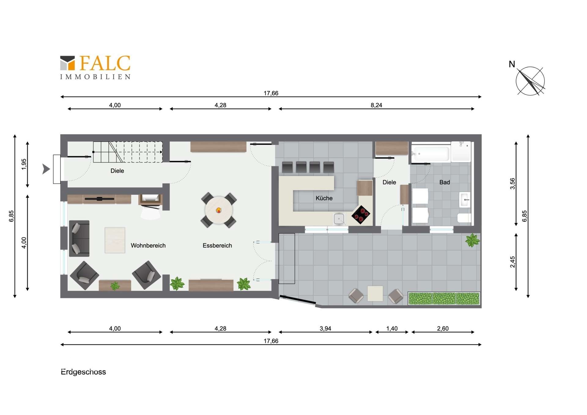 Erdgeschoss: - großzügiger Wohn-/Essbereich mit Zugang zu Terrasse und Garten - schöner Kaminofen im Wohnbereich - große Küche mit Thekenbereich - geschmackvolle Einbauküche im Landhausstil - großes Badezimmer mit Badewanne und Dusche - Klinkerwand und -elemente im Wohnbereich - moderne Fliesenböden