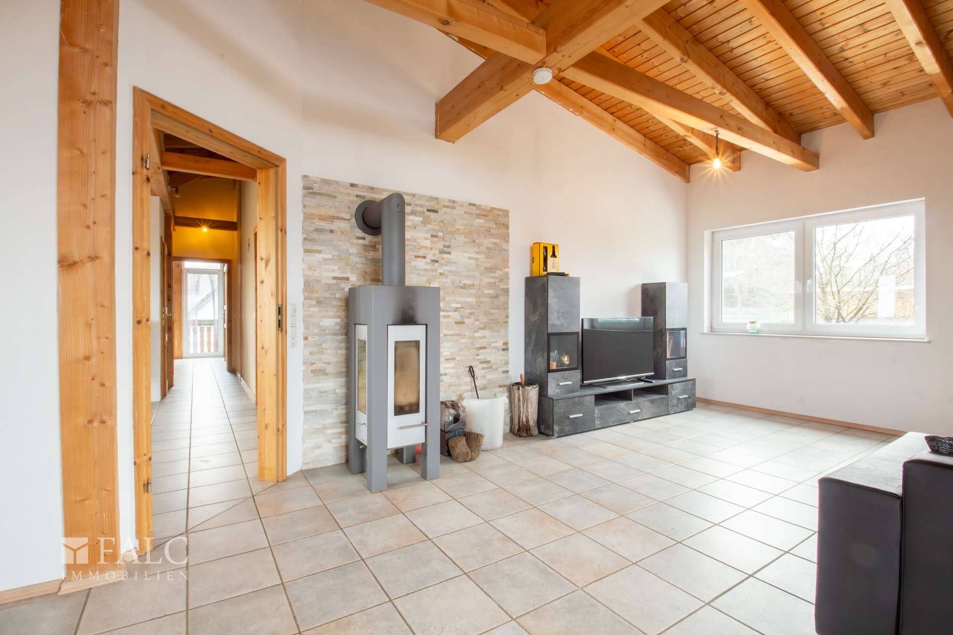 In den Wohnräumen des Einfamilienhauses wurden die Böden überwiegend mit Fliesen ausgestattet. Im Erdgeschoss liegt vereinzelt in den Räumen ein Laminatboden. Die zweifachverglasten Kunststofffenster sind aus dem Jahre 1998 und verfügen teilweise über Innenjalousien. Als Innentüren wurden hochwertigen braune Holztüren verwendet. Im Erdgeschoss sind die Zimmerdecken verputzt. Im Obergeschoss sind die Zimmerdecken mit hellen Deckenpaneelen verkleidet. Im Dachgeschoss ist die Dachkonstruktion sichtbar. Das Haus wird über eine Flüssiggas Zentralheizung aus dem Jahre 1998 beheizt. Der Flüssiggasbehälter hat ein Fassungsvolumen von 6.400 Liter und ist unterirdisch gelagert. Der Behälter wird vom Lieferanten zur Verfügung gestellt. Im Erdgeschoss befinden sich in allen Wohnräumen Heizkörper. Im Obergeschoss und im Dachgeschoss werden die Wohnräume über eine Fußbodenheizung erwärmt. Zusätzlich befindet sich in jeder Etage ein Kaminanschluss. Im Erdgeschoss und im Obergeschoss wurde ein Specksteinofen installiert. Die Warmwassererzeugung erfolgt ebenfalls über die Gas Zentralheizung. Das Gästebadezimmer im Erdgeschoss ist raumhoch mit hellen Fliesen gefliest und verfügt über eine Dusche. Die Sanitärobjekte sind in einem zeitgemäßen Zustand. Das Badezimmer im Obergeschoss ist halbhoch mit cremefarbigen und blauen Fliesen gefliest und verfügt über eine Badewanne sowie Dusche. Die Sanitärobjekte sind in einem zeitgemäßen Zustand. Das Badezimmer im Dachgeschoss ist raumhoch mit hellen Fliesen gefliest und verfügt über eine Dusche. Die Sanitärobjekte sind in einem zeitgemäßen Zustand. Das Satteldach des Wohnhauses ist mit roten Dachpfannen eingedeckt. Die Dachdämmung ist als Aufsparrendämmung ausgeführt. Die Ansichtsflächen der beiden Dachgauben sind mit Naturschiefer verkleidet. Die Doppelgarage ist aus Holz gefertigt und mit einem Pflastersteinboden ausgeführt. Auf dem Grundstück sind 2x 6.000 Liter Regenwasserzisternen ins Erdreich eingesetzt.