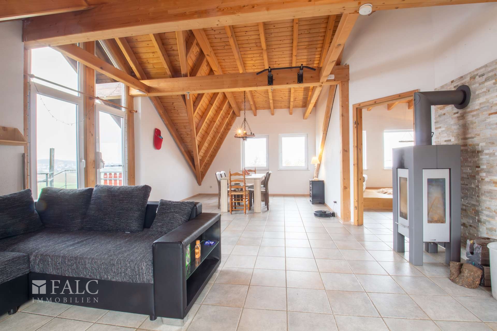 Sie betreten das Haus und werden in der geräumigen Diele des Erdgeschosses empfangen. Von hier aus gelangen Sie zu allen Räumen dieser Etage. Ein Lagerraum, ein Waschraum, ein Heizungsraum, ein Büro und ein Gäste Duschbad gehören zum Raumprogramm dieser Etage. Ein Hobbyraum mit einer Größe von ca. 37 m² steht Ihnen für Ihre Hobbys oder als Gästezimmer zur Verfügung. Ein separater Außenzugang und eine kleine Terrasse sind für dieses Zimmer vorhanden. Ein eingebauten Specksteinofen in der Diele sorgt für eine behagliche Wärme im Eingangsbereich. Über die viertelgewendelte Holztreppe in der Diele gelangen Sie in das Obergeschoss. Hier stehen Ihnen ein Schlafzimmer mit Ankleide und Bad en Suite sowie eine großzügige Galerie mit viel Fensterfläche zur Verfügung. Das Highlight dieser Etage ist der ca. 65 m² große offene Wohn-, Ess- und Küchenbereich mit Erker. Die großen bodentiefen Fenster mit Blick in den Garten sorgen für einen hellen und sonnendurchfluteten Wohnbereich. Ein Specksteinofen im Wohnbereich sorgt in kühlerer Jahreszeit für die behagliche Wärme und lädt Sie und Ihre Gäste zum Verweilen ein. Über einen Terrassenausgang im Wohnbereich gelangen Sie auf die überdachte Südterrasse und in den liebevoll angelegten Garten. Dieser bietet Ihnen besonders in den Sommermonaten einen enormen Freizeit- und Erholungswert. Im Dachgeschoss des Wohnhauses befindet sich die ca. 97 m² große Einliegerwohnung. Diese ist vom Obergeschoss aus über die Treppe in der Galerie erreichbar. Eine Edelstahlaußentreppe führt an der Seite des Gebäudes auf einen Balkon über dem Erker und dient als weiterer Zugang zur Einliegerwohnung. Zum Raumprogramm der Einliegerwohnung gehören zwei Schlafzimmer, eine Küche mit Balkon, ein Duschbad sowie eine Empore. Das Highlight der Wohnung ist das ca. 35 m² große Wohn- und Esszimmer. Hier befindet sich ebenfalls ein Kaminanschluss.