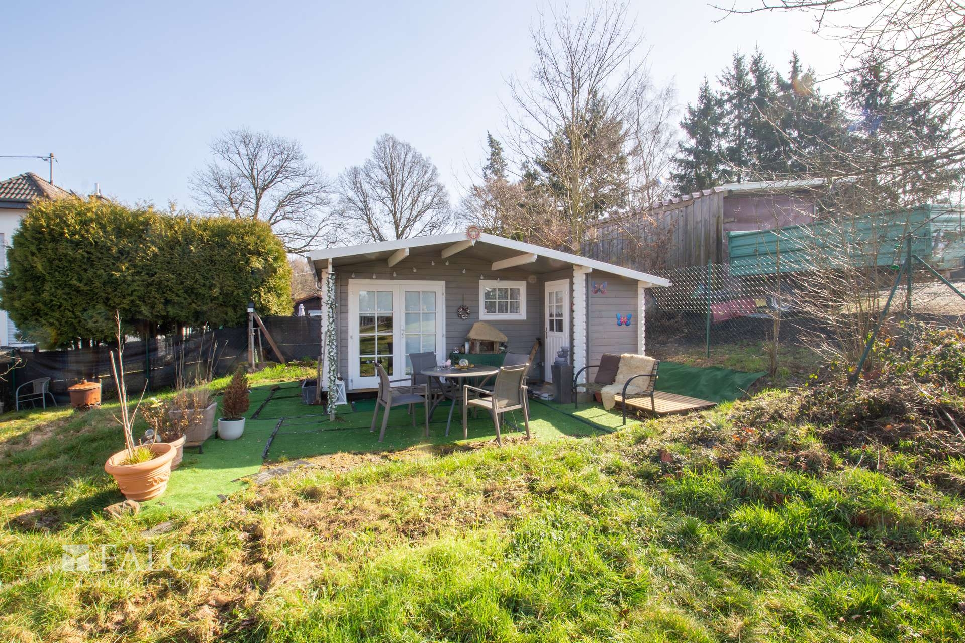 Das Grundstück ist teilweise eingefriedet und wurde mit Sträuchern, Bäumen und einer Rasenfläche angelegt. Ein kleines Gartenhäuschen steht Ihnen zusätzlich als Rückzugsort zur Verfügung. Eine Doppelgarage rundet das Grundstücksangebot ab.