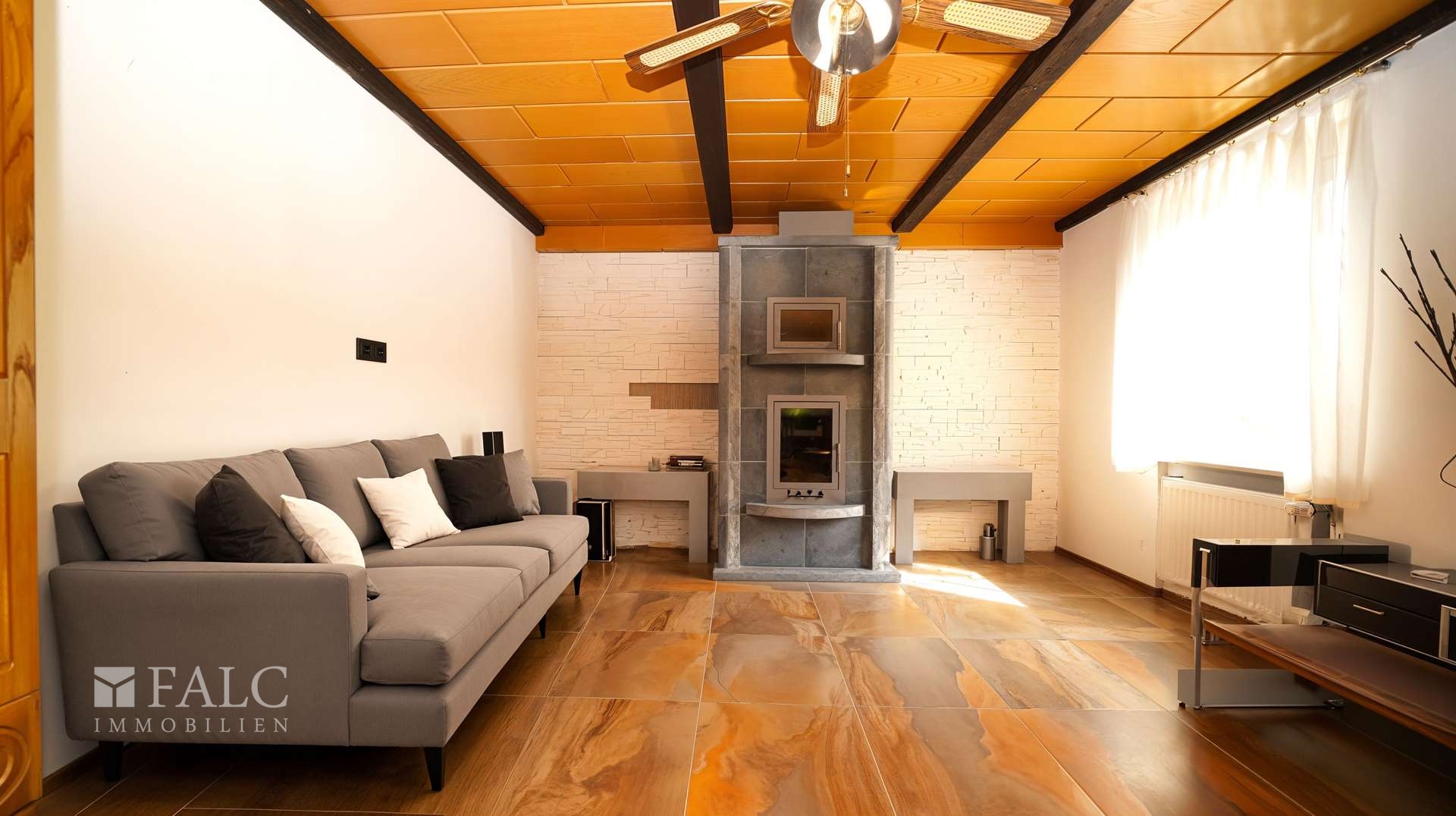 Entscheidet man sich für den Weg über die Terrasse, gelangt man unmittelbar in den großzügigen Wohn-Essbereich mit etwa 33 m² Fläche. Hier bietet sich ausreichend Platz für eine gemütliche Sofalandschaft sowie einen großen Esstisch, an dem die ganze Familie zusammenkommen kann. Ein Kaminofen sorgt an kühlen Tagen für wohlige Wärme und ein behagliches Ambiente. Der gesamte Bereich ist mit stilvollen Fliesenböden ausgestattet, die dem Raum eine moderne und zugleich pflegeleichte Note verleihen.