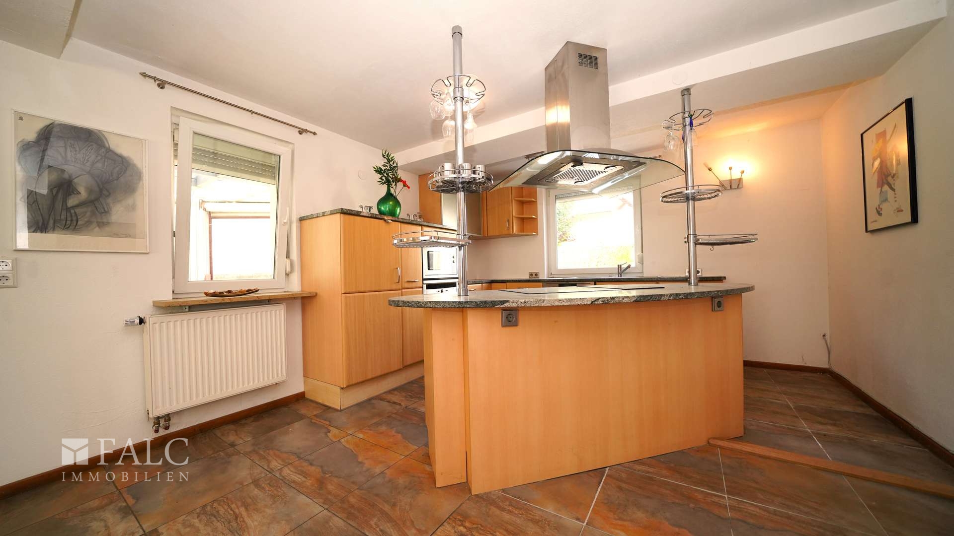 Offen geht es weiter in die Küche, die sich harmonisch an den Wohnbereich anschließt. Hier erwartet Sie eine praktische Kücheninsel, die mit Herdplatte und darüberliegender Abzugshaube ausgestattet ist – perfekt für gemeinsames Kochen und geselliges Beisammensein.