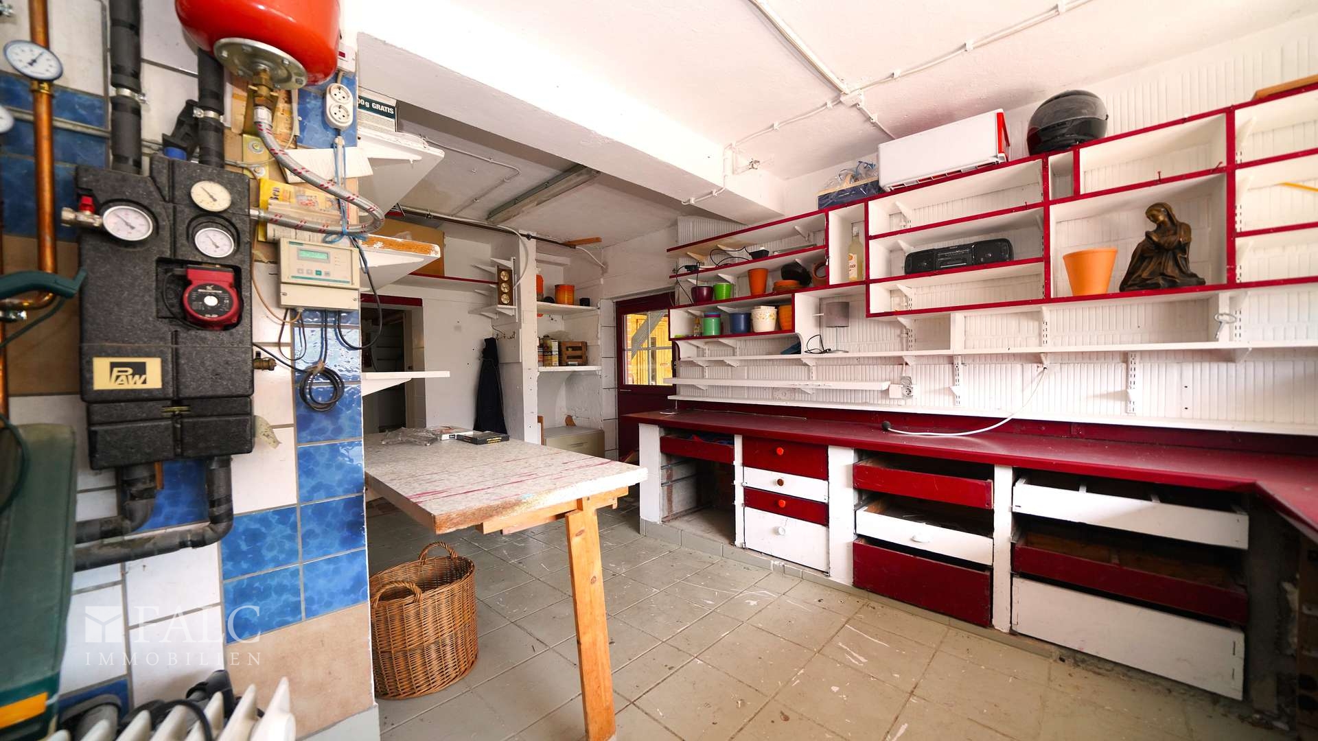 Rechts davon schließt sich ein weiterer, offen gestalteter Bereich an, der aktuell als Werkstatt genutzt wird, sich aber ebenso gut als Hauswirtschaftsraum eignet. Auch der Heizraum mit der modernen Gaszentralheizung (Baujahr 2015) ist hier untergebracht.