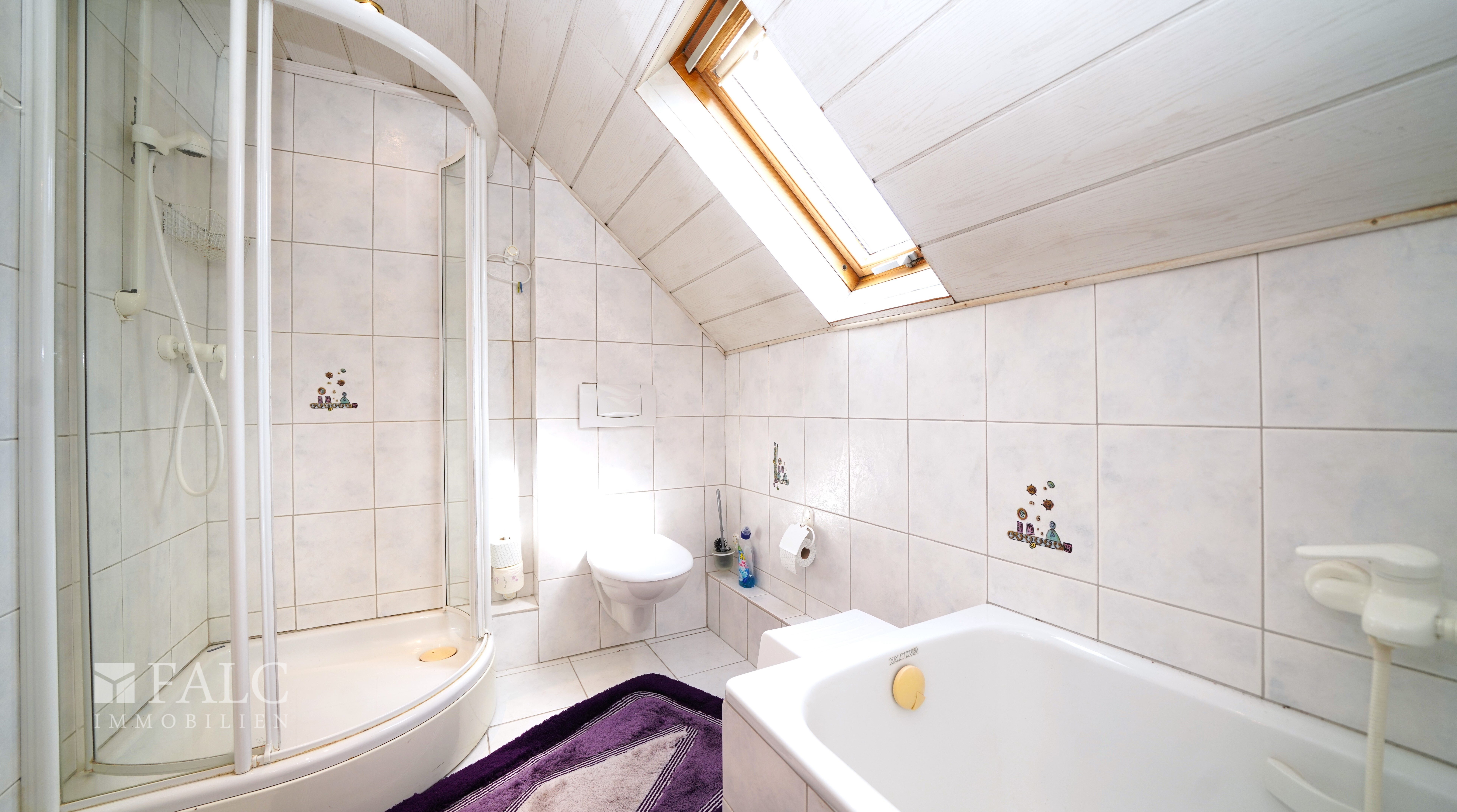 Das Badezimmer, versehen mit weißen Badfliesen, bietet Ihnen ebenfalls ausreichend Platz für Ihre Morgen- und Abendroutine. Es überzeugt mit einer Duschkabine mit Glastüren, einer zusätzlichen Badewanne, einem Waschbeckenbereich und einem WC. Alles, was Sie für Ihre tägliche Wohlfühlroutine benötigen.
