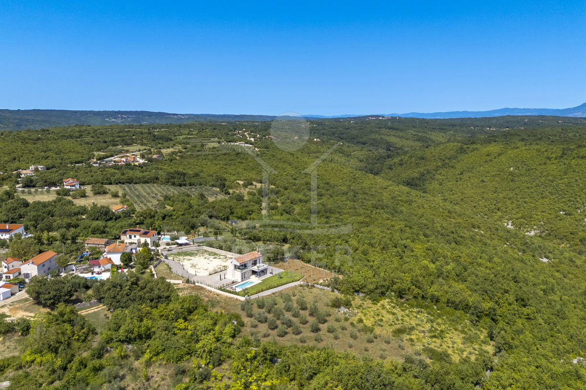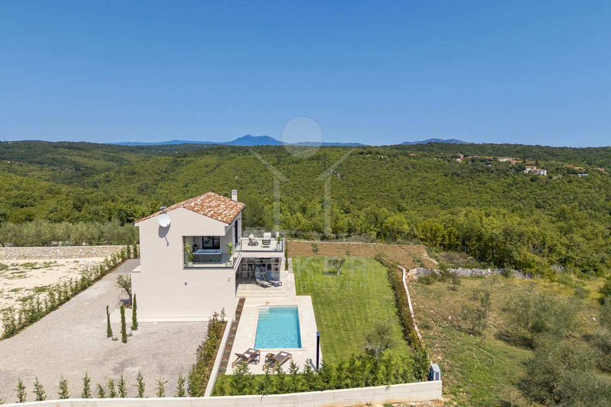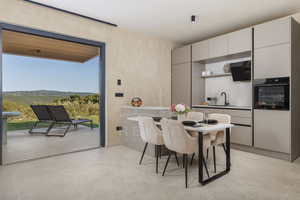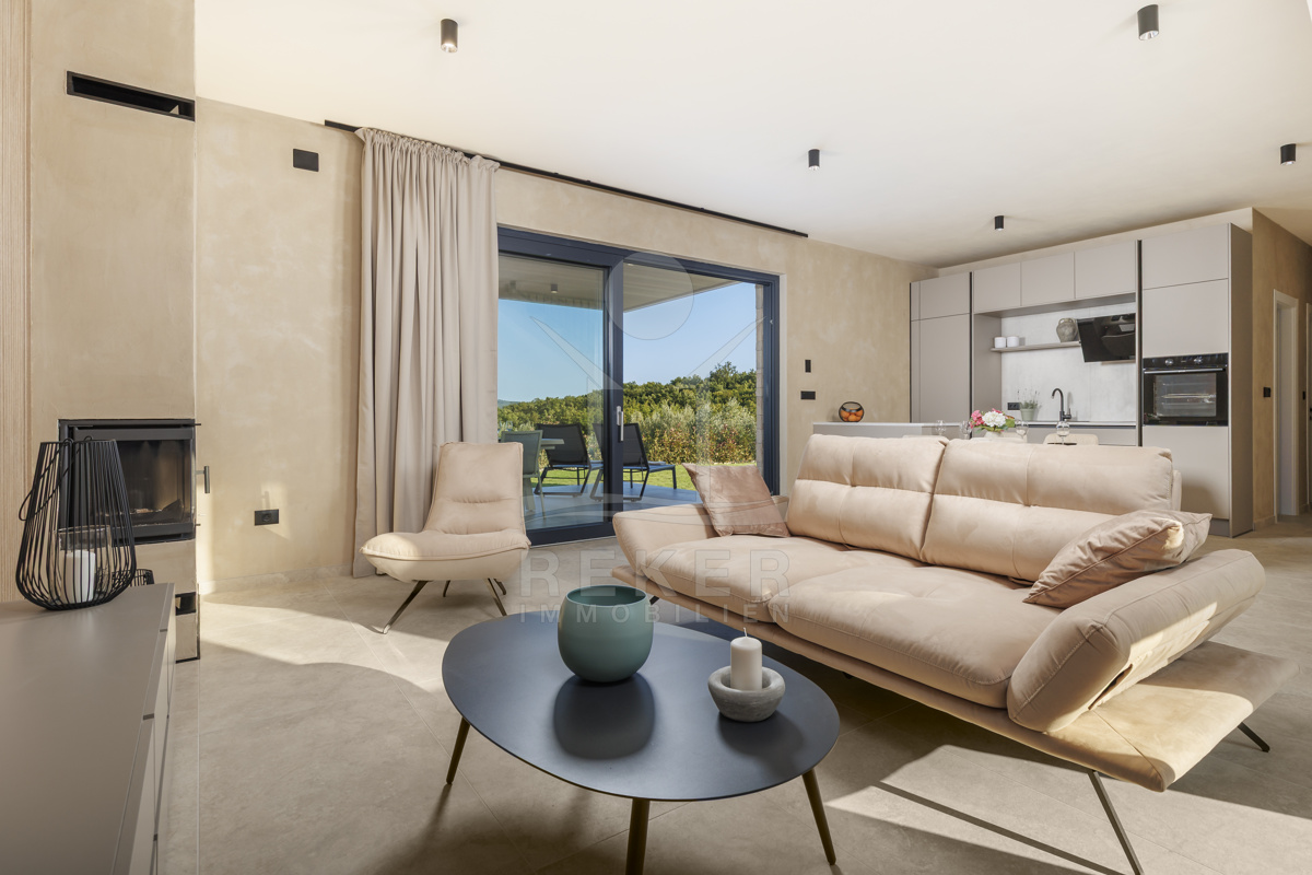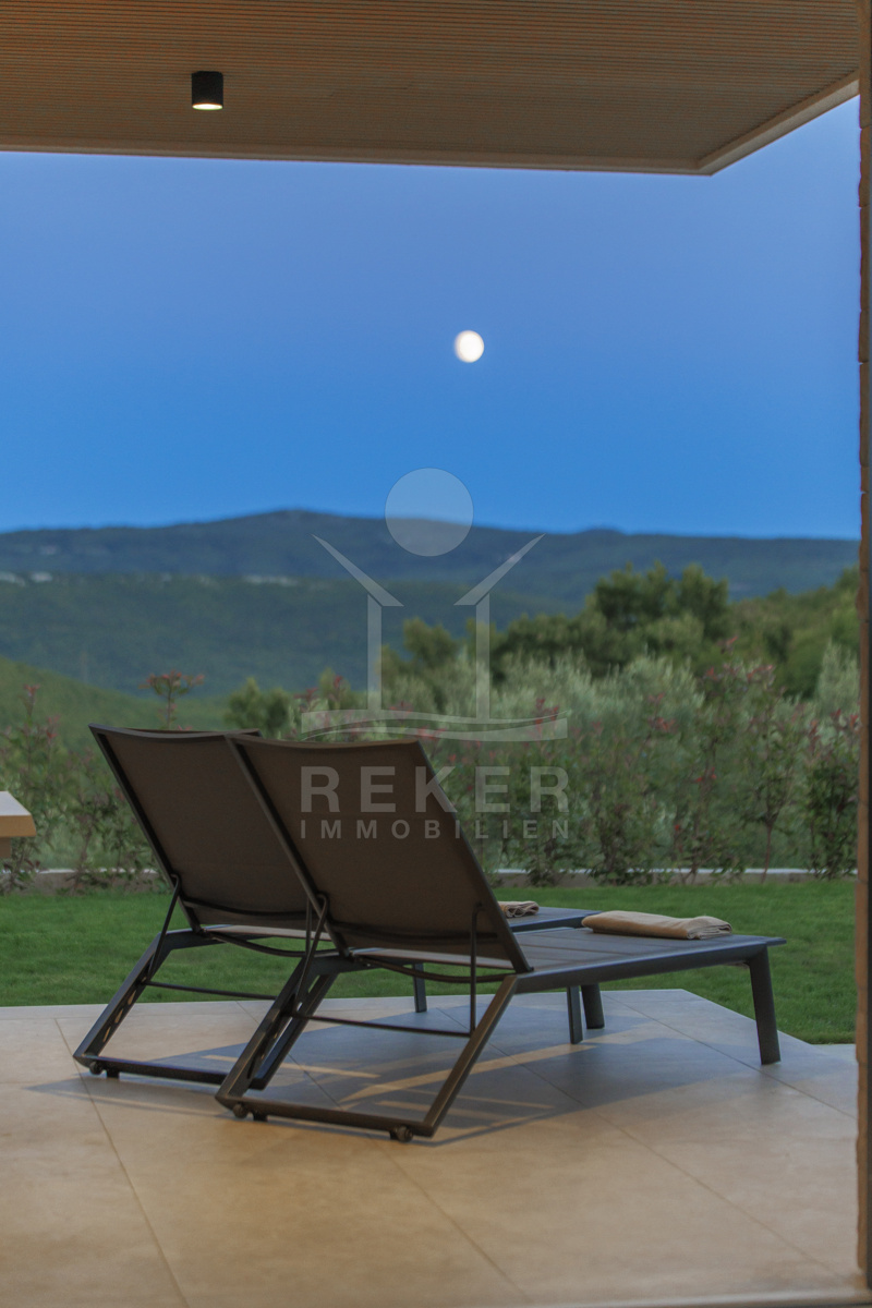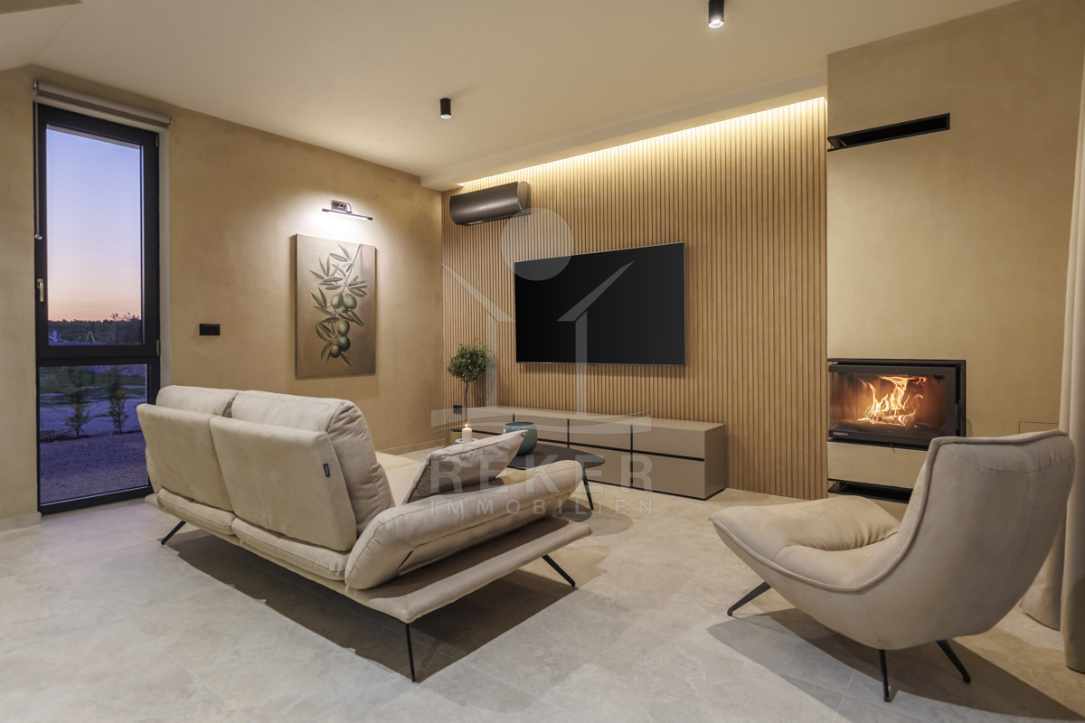 Am Rand des kleinen Dorfes Kunj, nur 8 km von der historischen Stadt Labin entfernt, wartet diese moderne Villa auf neue Bewohner. Hier genießen Sie Ruhe und einen weiten Blick über Olivenhaine und den Berg Učka. Die Küste erreichen Sie in rund 15 Minuten mit dem Auto. Labin bietet Restaurants, Supermärkte und ein vielseitiges Kulturangebot. Auf dem Grundstück stehen mehrere Stellplätze für Ihre Fahrzeuge bereit.