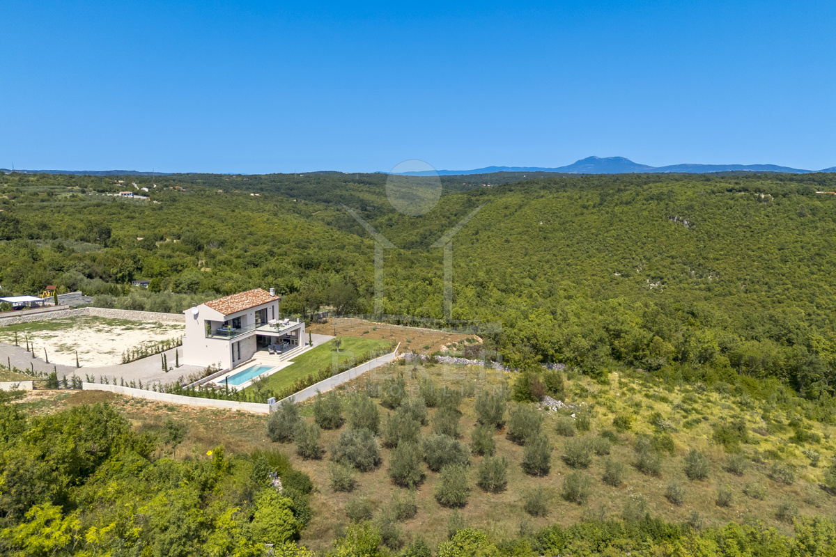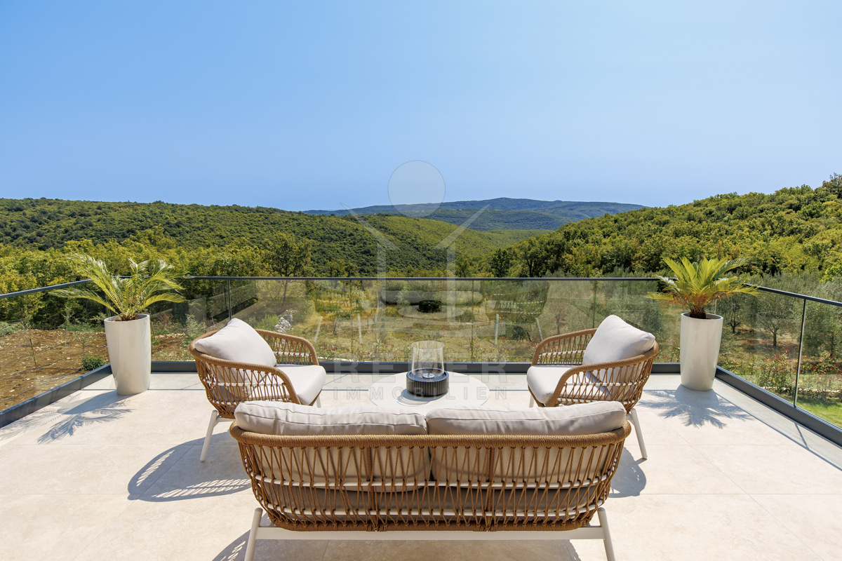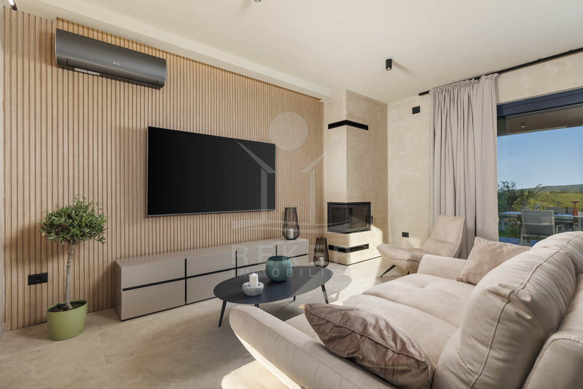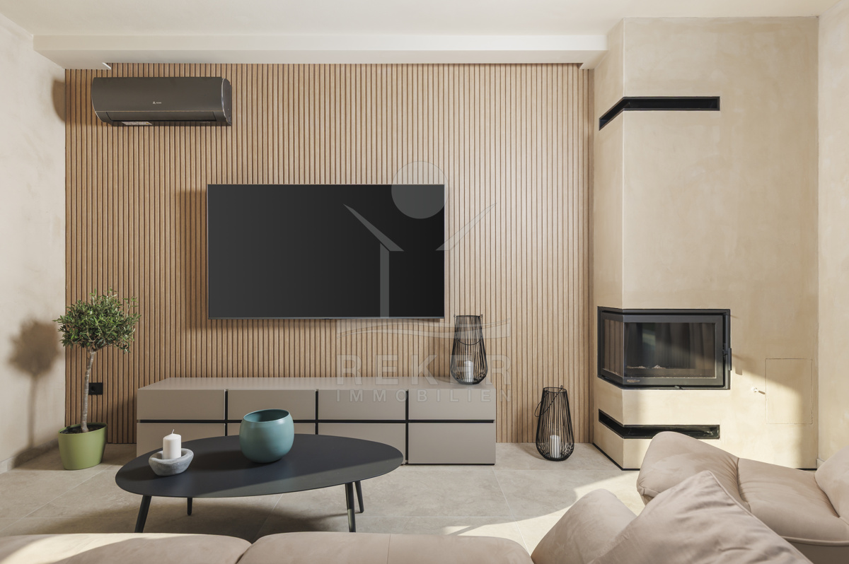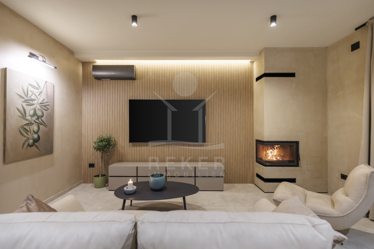 Am Rand des kleinen Dorfes Kunj, nur 8 km von der historischen Stadt Labin entfernt, wartet diese moderne Villa auf neue Bewohner. Hier genießen Sie Ruhe und einen weiten Blick über Olivenhaine und den Berg Učka. Die Küste erreichen Sie in rund 15 Minuten mit dem Auto. Labin bietet Restaurants, Supermärkte und ein vielseitiges Kulturangebot. Auf dem Grundstück stehen mehrere Stellplätze für Ihre Fahrzeuge bereit.