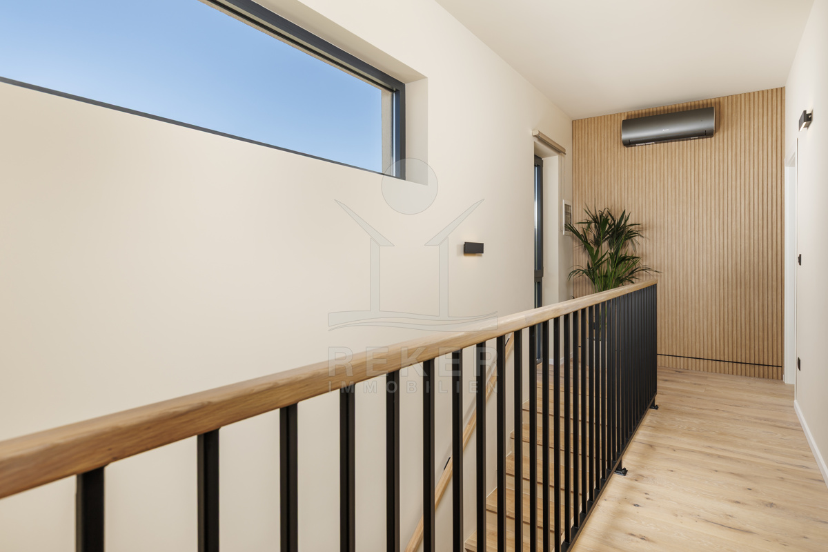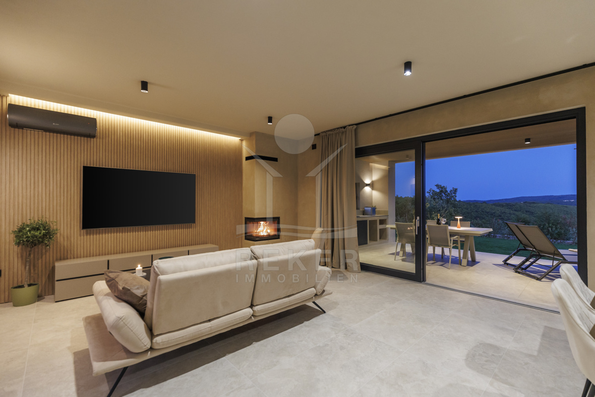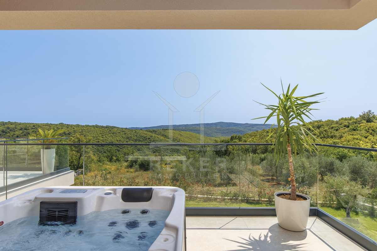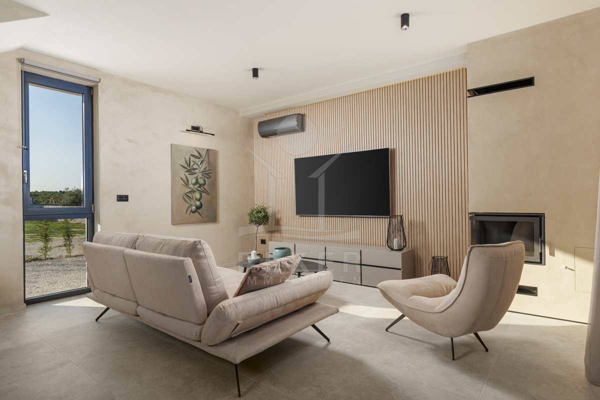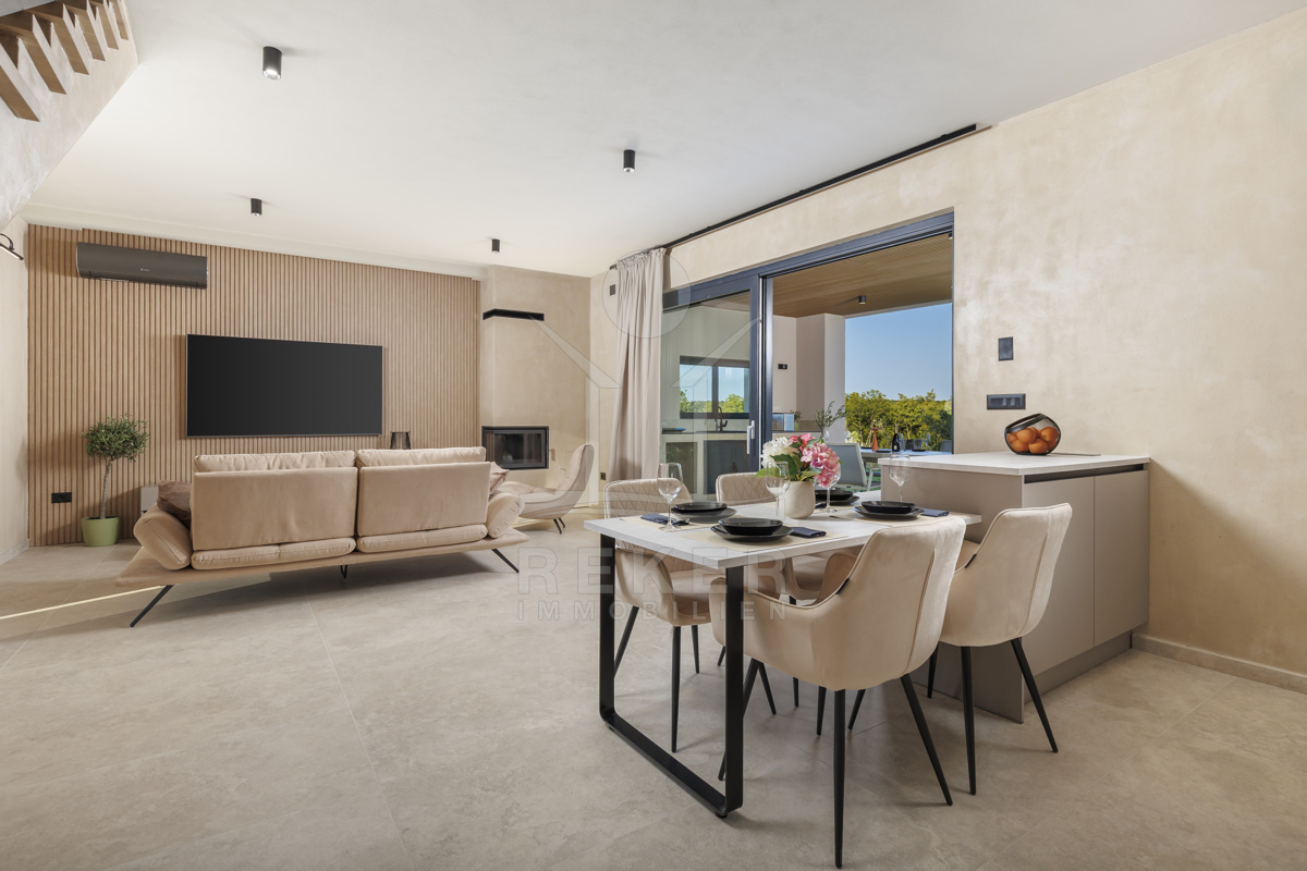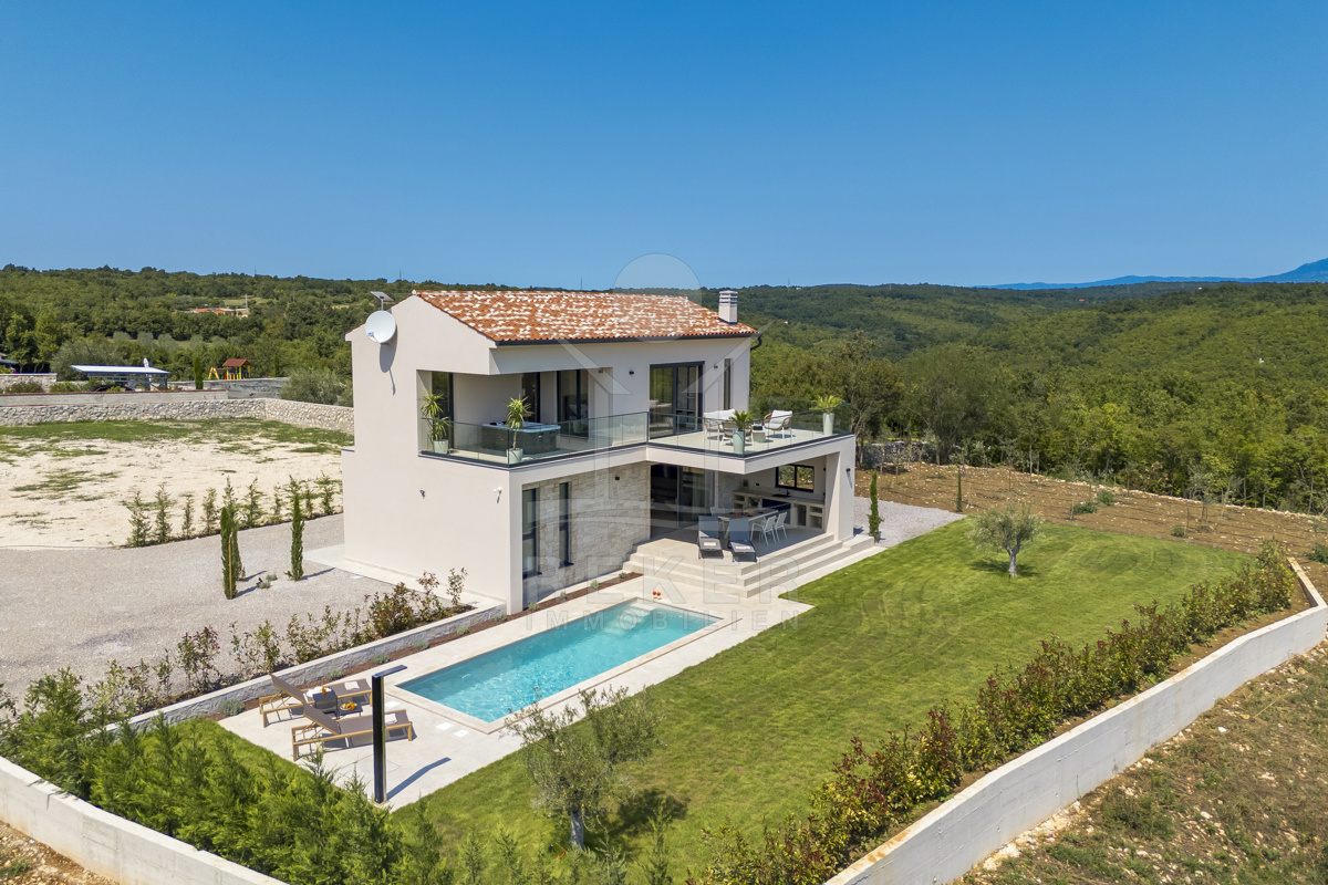 Am Rand des kleinen Dorfes Kunj, nur 8 km von der historischen Stadt Labin entfernt, wartet diese moderne Villa auf neue Bewohner. Hier genießen Sie Ruhe und einen weiten Blick über Olivenhaine und den Berg Učka. Die Küste erreichen Sie in rund 15 Minuten mit dem Auto. Labin bietet Restaurants, Supermärkte und ein vielseitiges Kulturangebot. Auf dem Grundstück stehen mehrere Stellplätze für Ihre Fahrzeuge bereit.