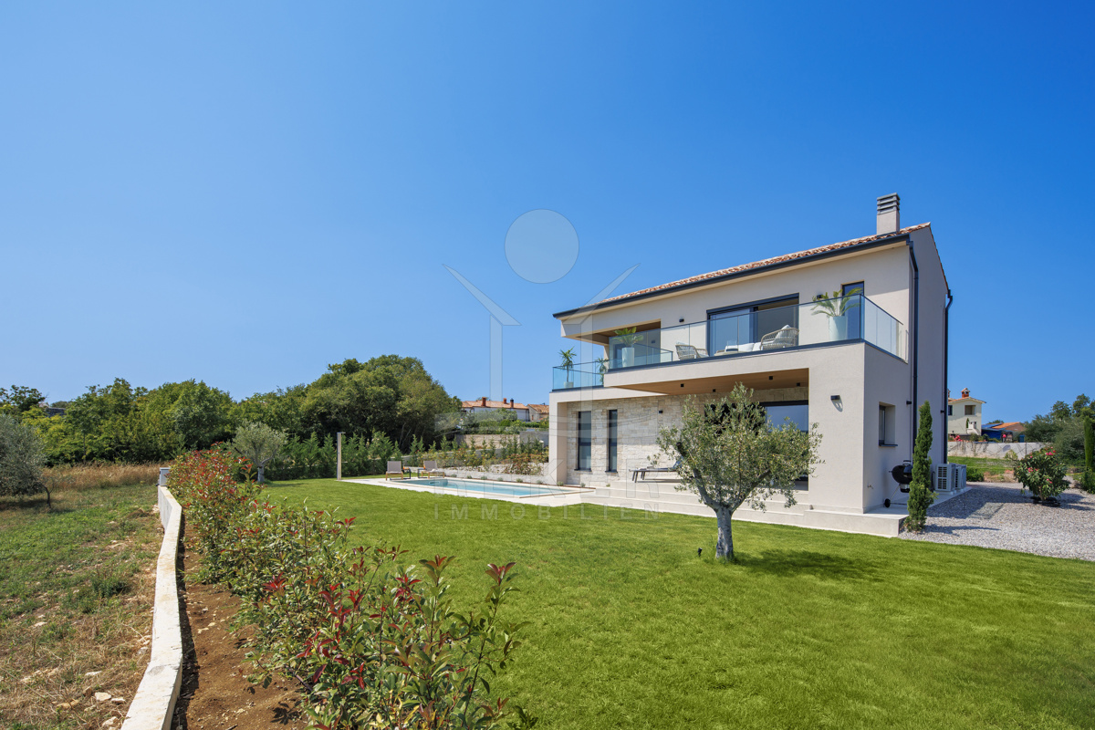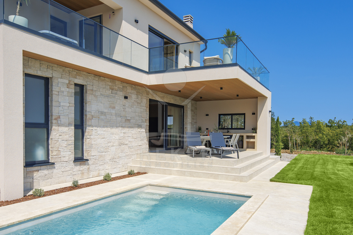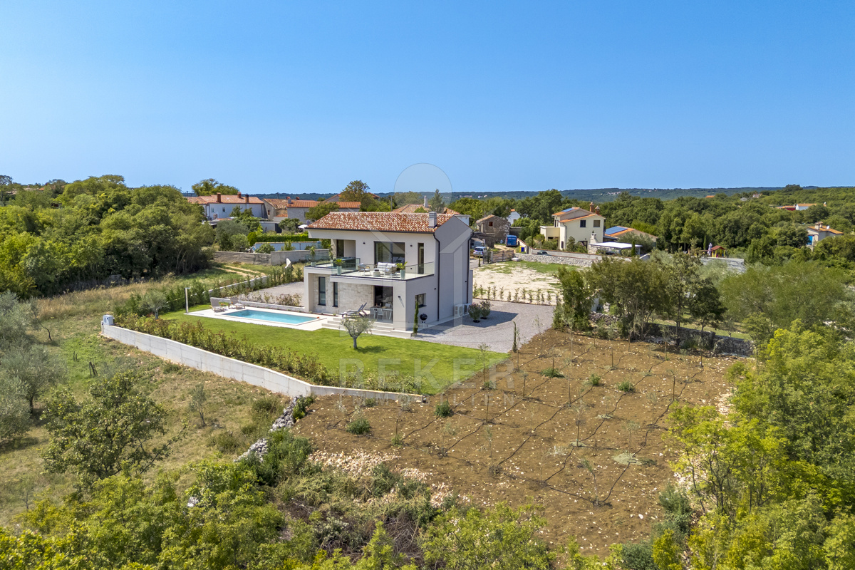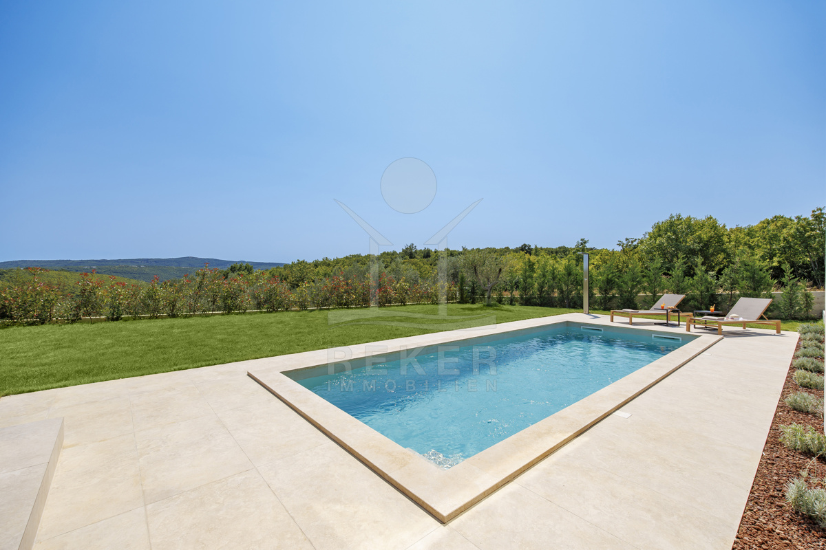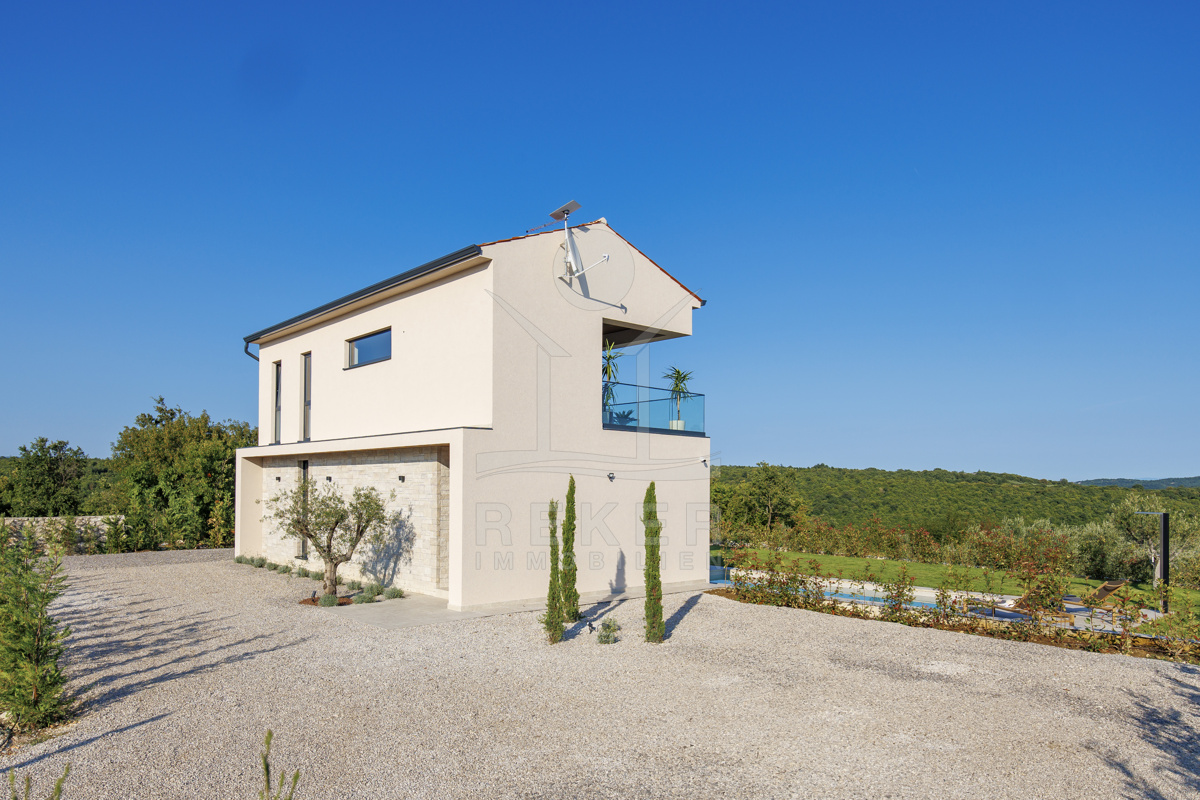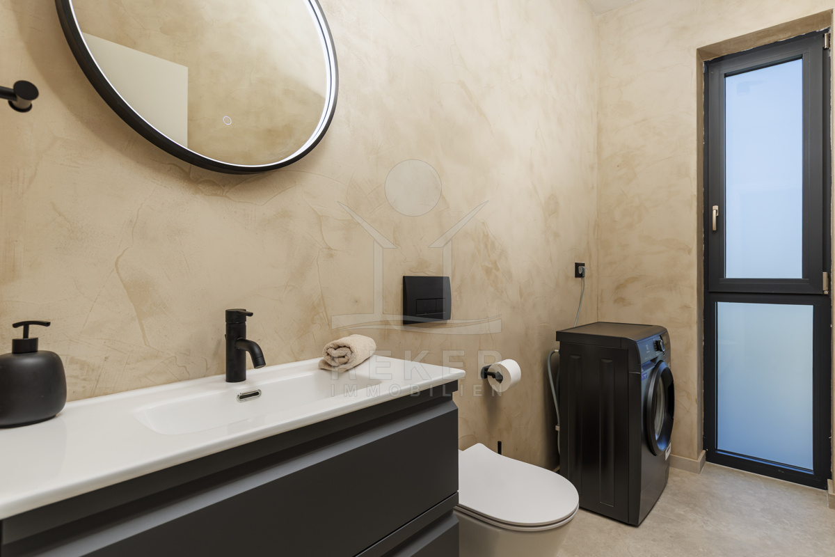 Am Rand des kleinen Dorfes Kunj, nur 8 km von der historischen Stadt Labin entfernt, wartet diese moderne Villa auf neue Bewohner. Hier genießen Sie Ruhe und einen weiten Blick über Olivenhaine und den Berg Učka. Die Küste erreichen Sie in rund 15 Minuten mit dem Auto. Labin bietet Restaurants, Supermärkte und ein vielseitiges Kulturangebot. Auf dem Grundstück stehen mehrere Stellplätze für Ihre Fahrzeuge bereit.