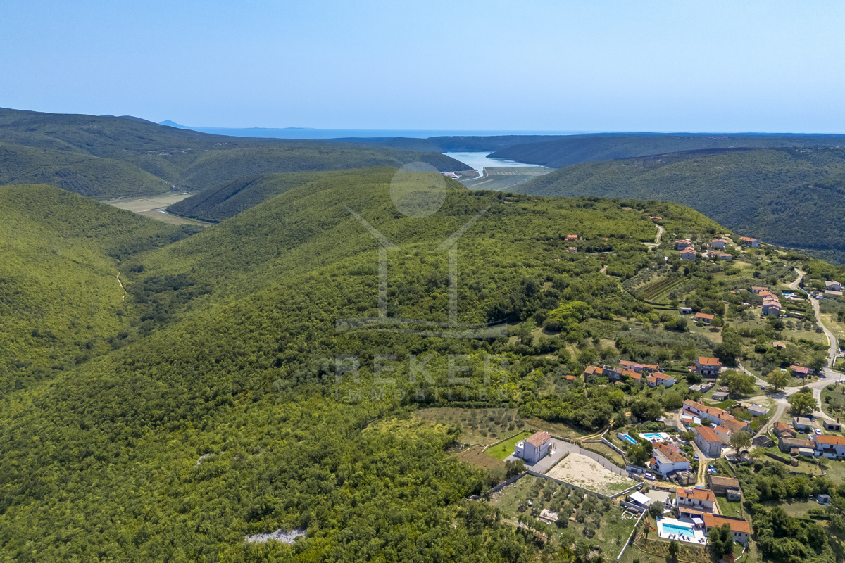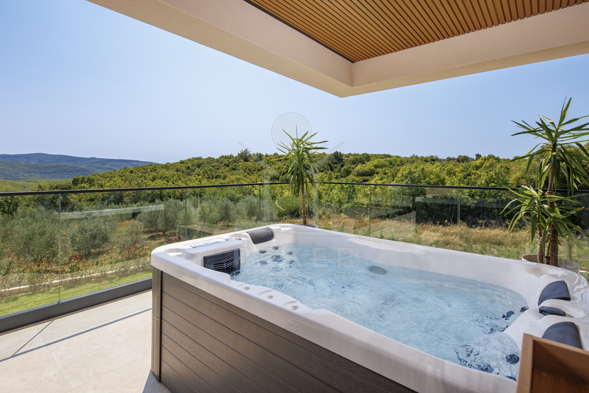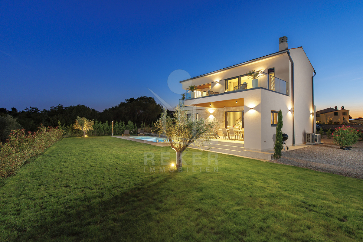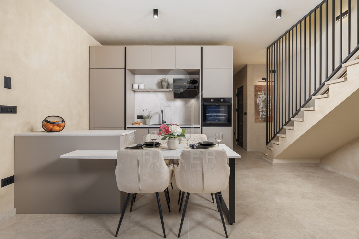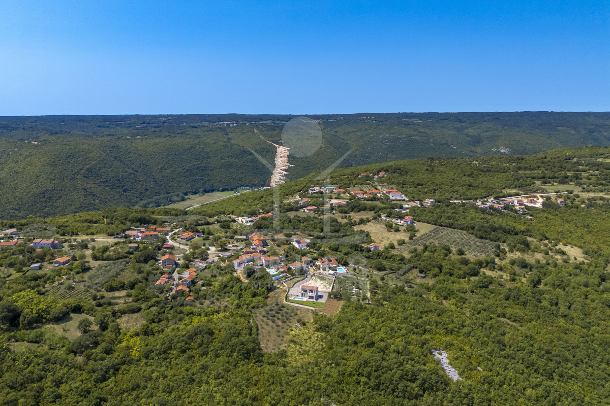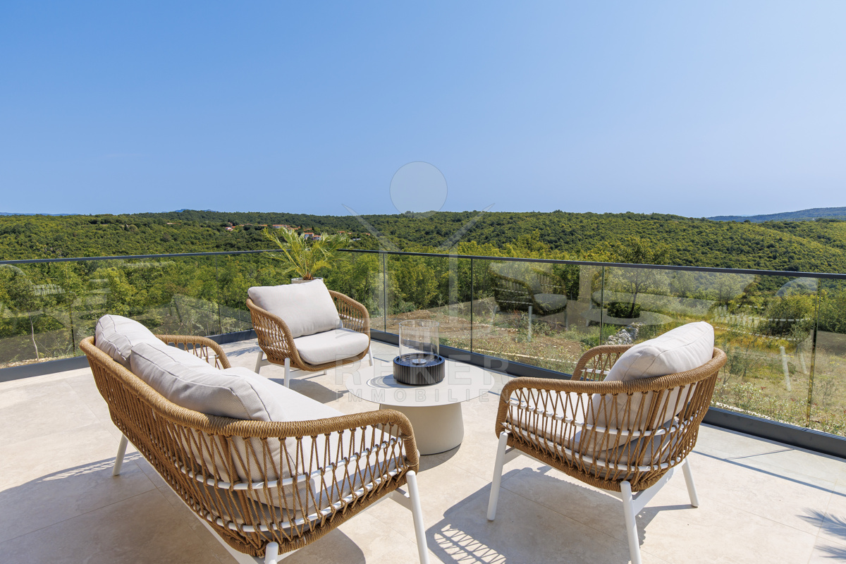 Am Rand des kleinen Dorfes Kunj, nur 8 km von der historischen Stadt Labin entfernt, wartet diese moderne Villa auf neue Bewohner. Hier genießen Sie Ruhe und einen weiten Blick über Olivenhaine und den Berg Učka. Die Küste erreichen Sie in rund 15 Minuten mit dem Auto. Labin bietet Restaurants, Supermärkte und ein vielseitiges Kulturangebot. Auf dem Grundstück stehen mehrere Stellplätze für Ihre Fahrzeuge bereit.