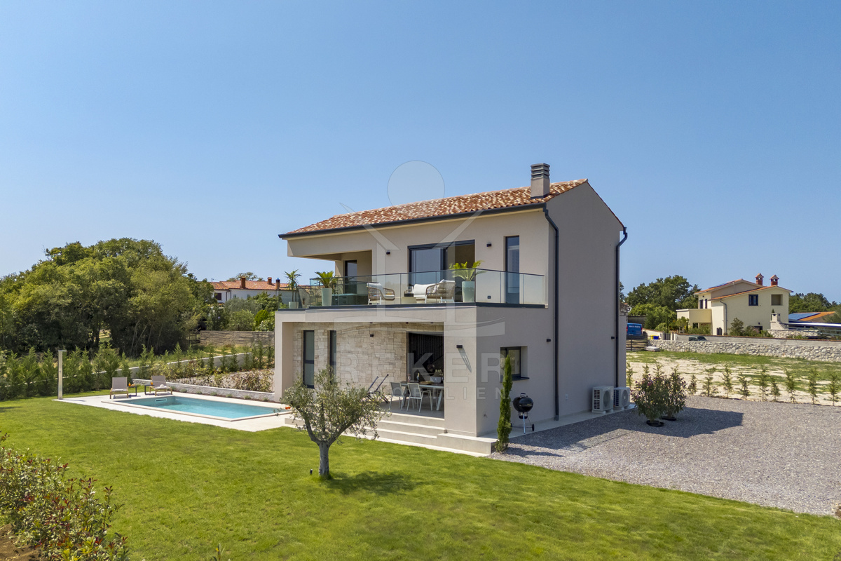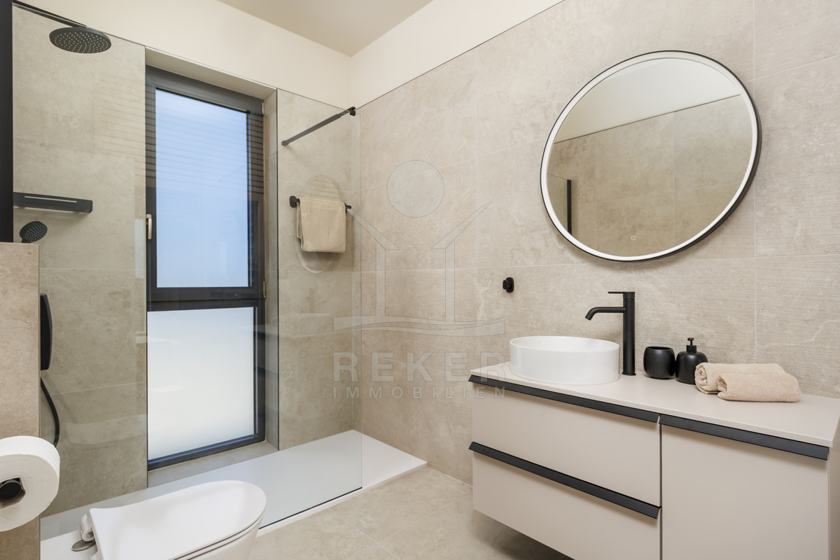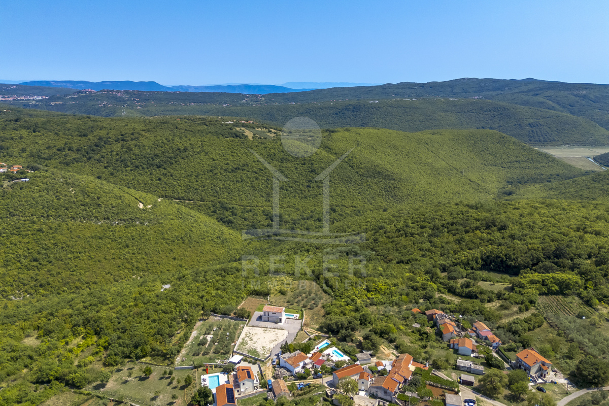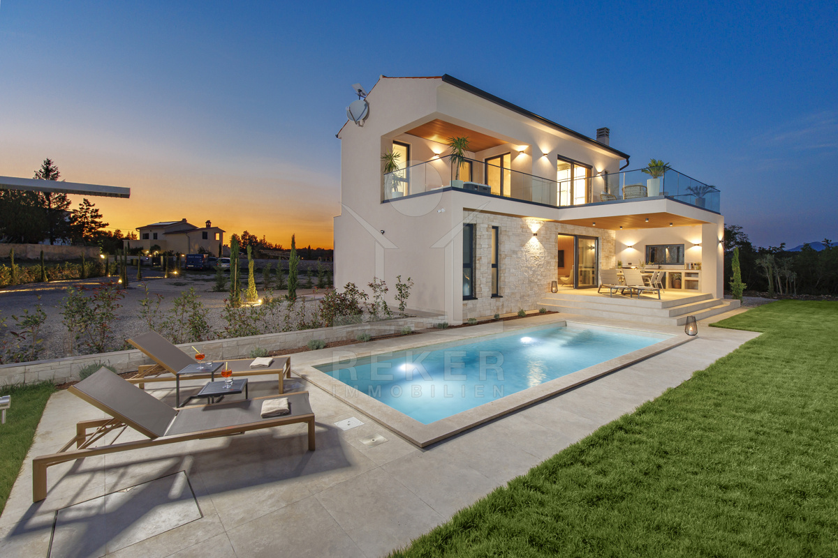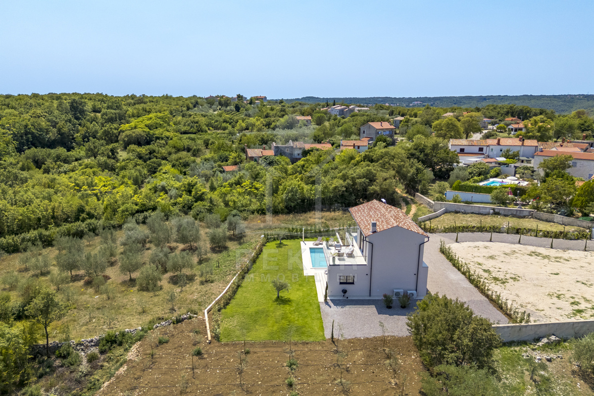 Am Rand des kleinen Dorfes Kunj, nur 8 km von der historischen Stadt Labin entfernt, wartet diese moderne Villa auf neue Bewohner. Hier genießen Sie Ruhe und einen weiten Blick über Olivenhaine und den Berg Učka. Die Küste erreichen Sie in rund 15 Minuten mit dem Auto. Labin bietet Restaurants, Supermärkte und ein vielseitiges Kulturangebot. Auf dem Grundstück stehen mehrere Stellplätze für Ihre Fahrzeuge bereit.