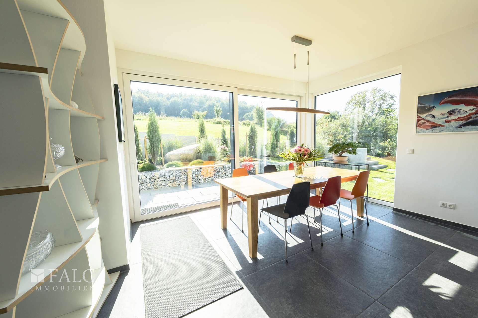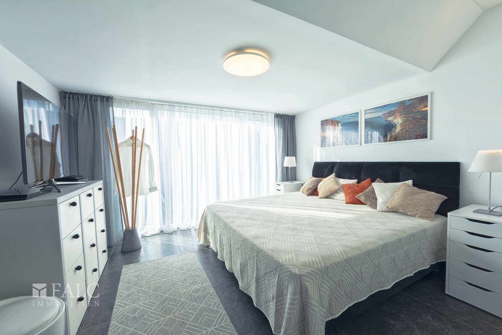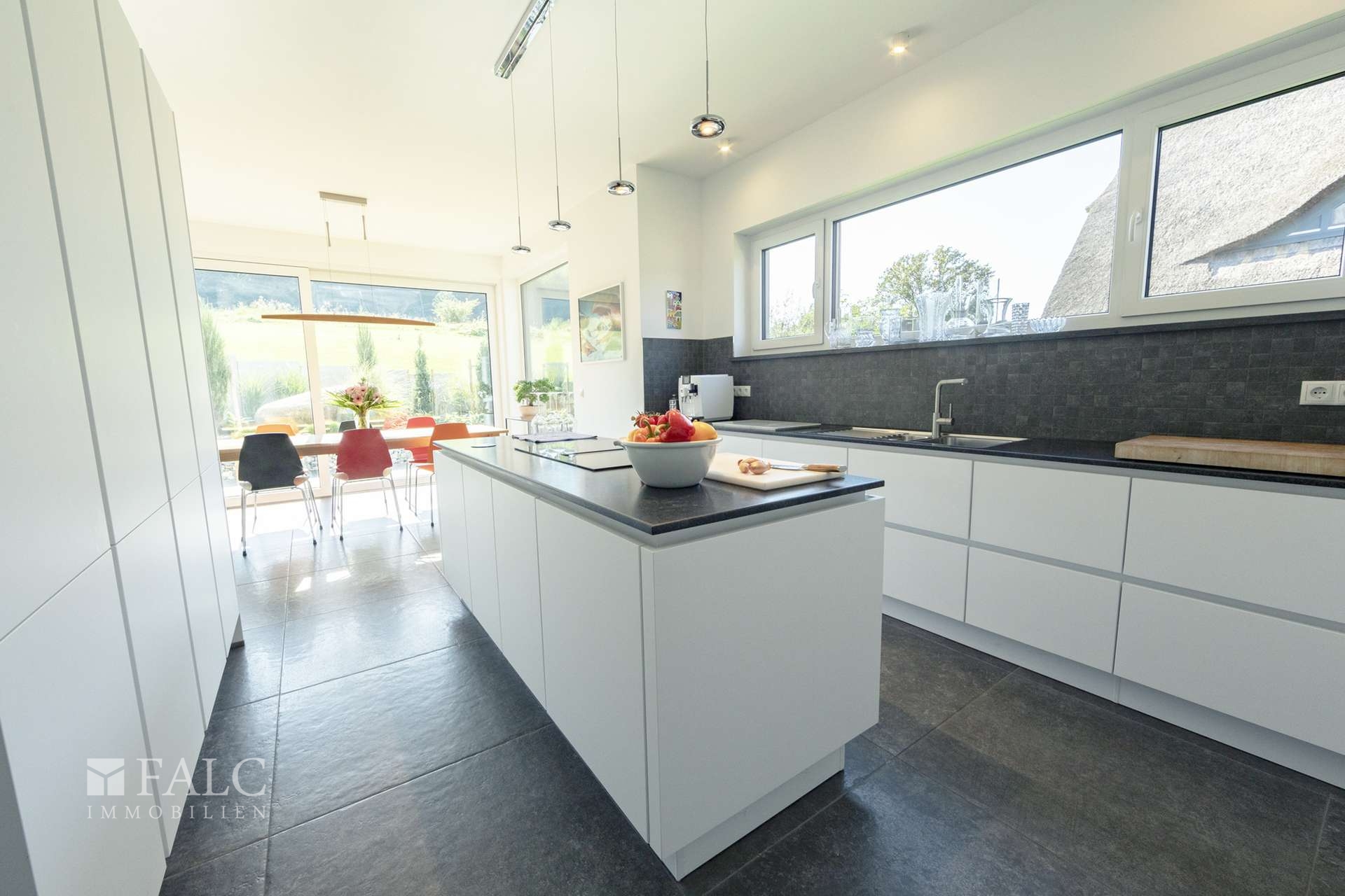 „Zuhause ist, wo die Wellen rauschen.“ Wenn Sie auf der Suche nach einem eleganten, modernen Zuhause für Ihre Familie sind – einem Ort, an dem hochwertiges Design auf durchdachte Wohnqualität trifft – dann wird Sie dieses außergewöhnliche Immobilienangebot begeistern. Anspruchsvoll, jung und stilvoll – so lässt sich der erste Eindruck dieses Hauses wohl am treffendsten beschreiben. Klare Linien, moderne Materialien und lichtdurchflutete Räume schaffen eine Atmosphäre zum Wohlfühlen und Ankommen. Das Herzstück des Hauses bildet der offen gestaltete Wohn-Ess- und Kochbereich. Die hochwertige, weiße Küche mit zentraler Kochinsel ist ein echter Blickfang und bietet mit modernen Elektrogeräten alles, was das Kochherz begehrt. Hier wird gemeinsames Kochen zum Erlebnis. Küche ist im Kaufpreis enthalten. Direkt angrenzend lädt der Essbereich mit Schiebetür zur Südterrasse zu entspannten Stunden im Freien ein. Die großzügige Terrasse öffnet sich zum weitläufigen Garten, dessen Hanglage nicht nur Struktur, sondern auch eine besondere Atmosphäre schafft. Der traumhafte Blick ins Grüne und die Südausrichtung garantieren ganztägigen Sonnengenuss. Im Obergeschoss erwarten Sie drei vielseitig nutzbare Räume – ideal als Schlafzimmer, Kinderzimmer oder Homeoffice. Die Räume überzeugen durch Großzügigkeit, viel Tageslicht und ein angenehmes Wohnklima. Das Hauptschlafzimmer bietet einen ganz besonderen Rückzugsort mit direktem Zugang zum Südbalkon, genießen Sie hier einen herrlichen Ausblick ins Grüne. Die Garage mit elektrischem Rolltor ermöglicht bequemes Parken direkt neben dem Haus. Von hier aus gelangen Sie wahlweise durch einen separaten Seiteneingang direkt in den Hauswirtschaftsraum.