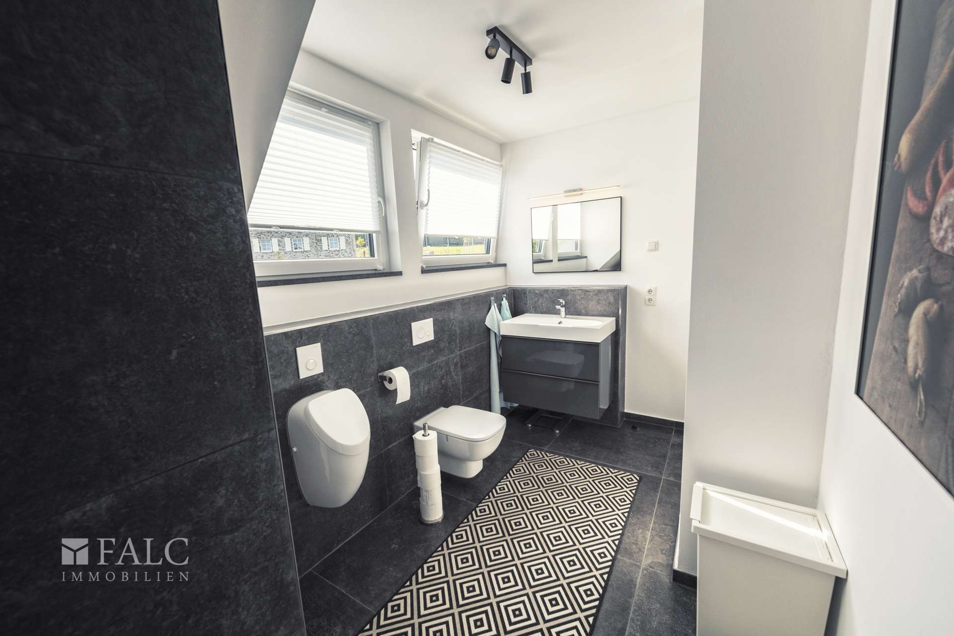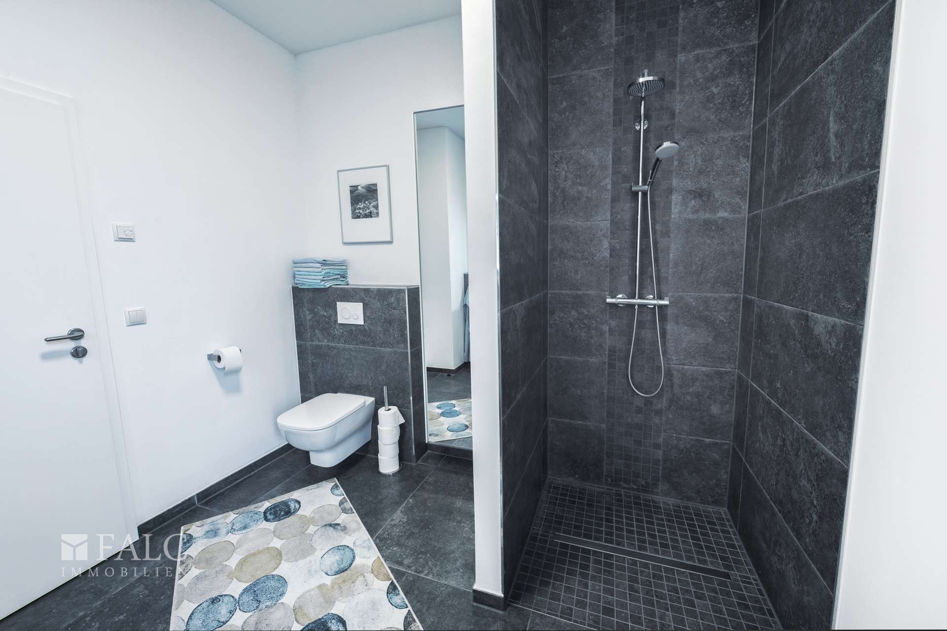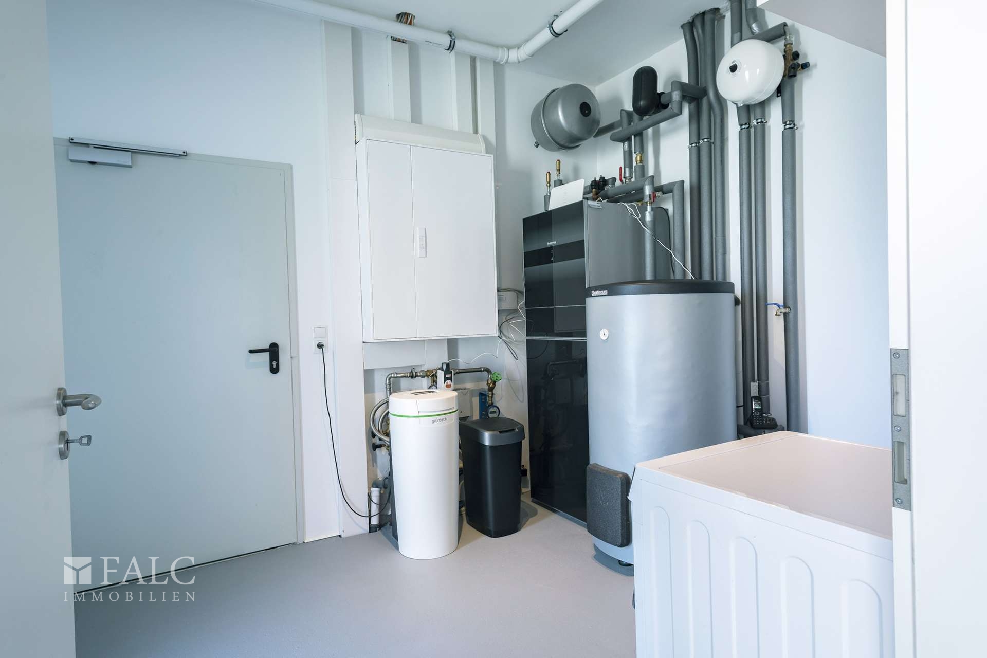 Das gesamte Haus ist mit hochwertigen Fliesen ausgestattet und verfügt über eine gehobene Ausstattung. Beheizt wird es durch eine effiziente Buderus Luft-Wärmepumpe mit Fußbodenheizung. Eine Entkalkungsanlage sorgt zusätzlich für eine hohe Wasserqualität im gesamten Haus. Hier wurde wirklich an alles gedacht! Der praktische Hauswirtschaftsraum mit direktem Zugang zur Garage sorgt für höchsten Wohnkomfort im Alltag. Das elektrische Garagentor lässt sich bequem per Fernbedienung steuern, und eine Wallbox-Vorbereitung für das Laden eines Elektrofahrzeugs ist bereits vorbereitet.